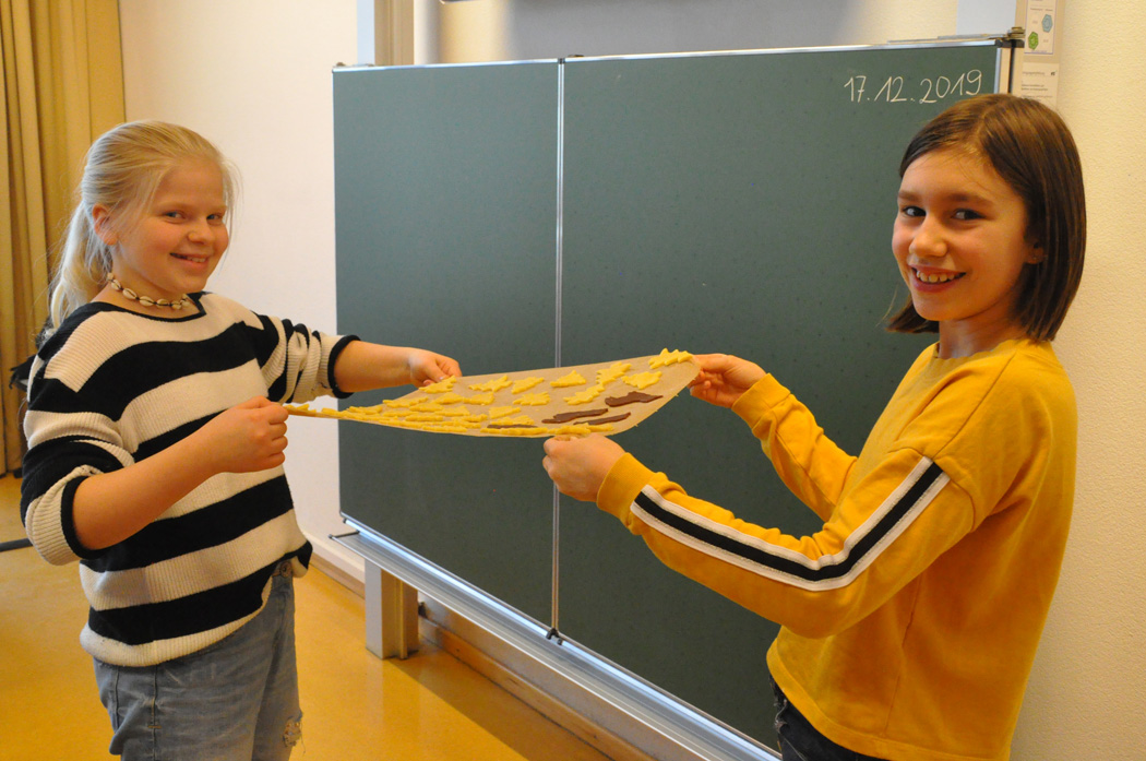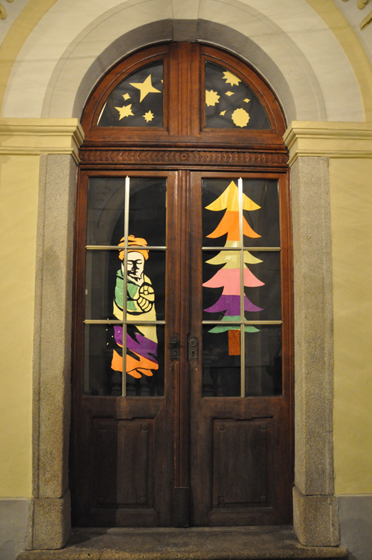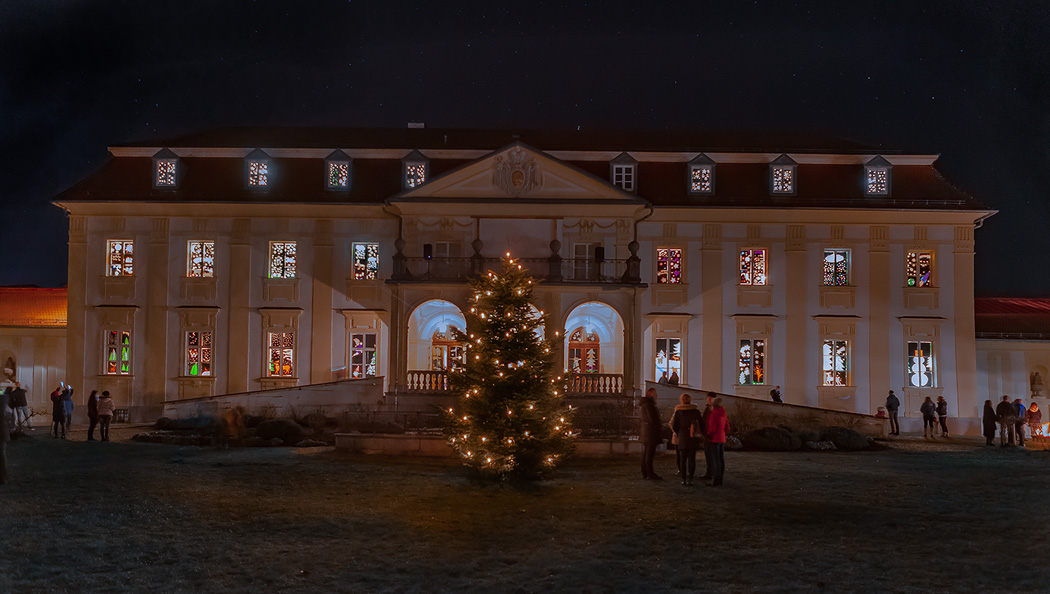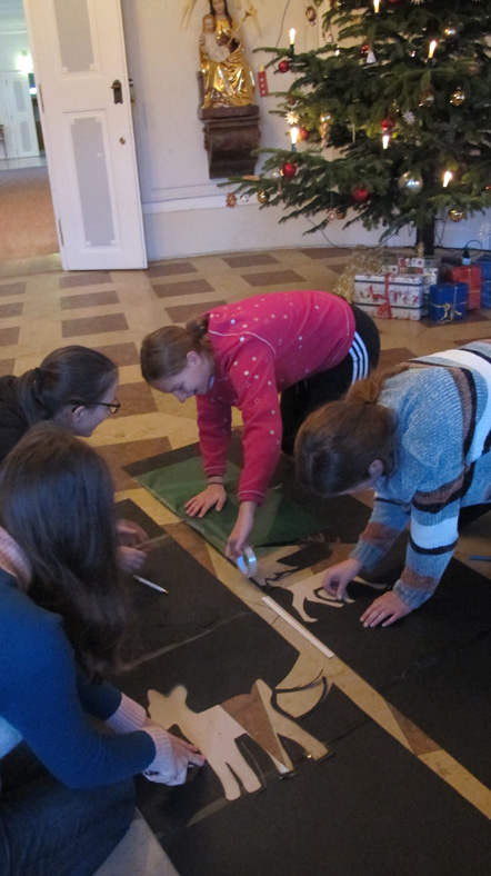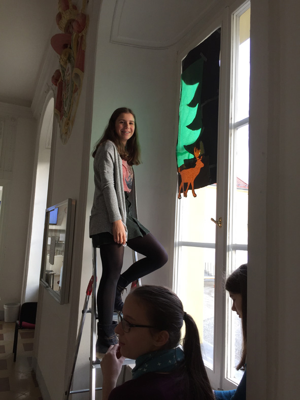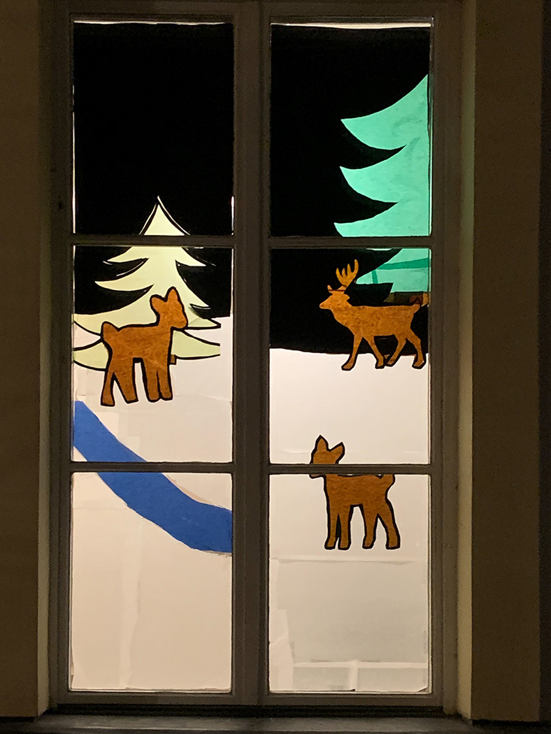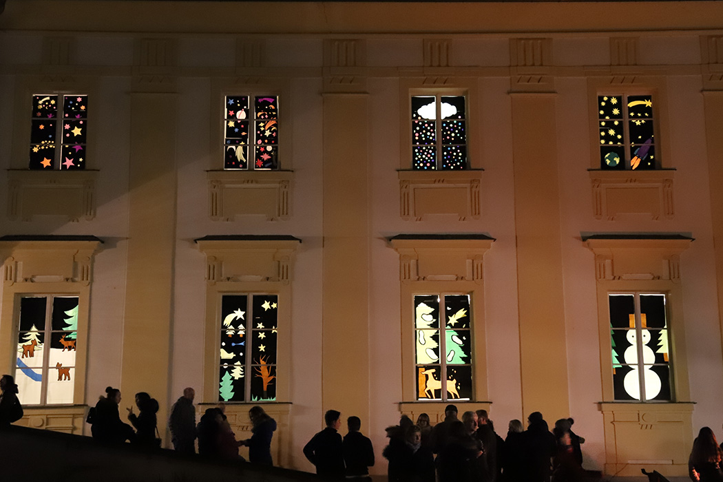 Sterntaler“ stimmte alle Besucher auf das Fest der Liebe und des Gebens ein. Dann wurden nacheinander die Fenster der Hauptfassade erhellt und zauberten Winterlandschaften, weihnachtliche Motive und einen Sternenhimmel herbei. In mühevoller Schneide- und Klebearbeit hatte jede Klasse ein Fenster des Schlossgebäudes gestaltet, das nun als Ganzes den Zusammenhalt der Schulfamilie symbolisierte, die das Weihanchtsfest freudig erwartet.