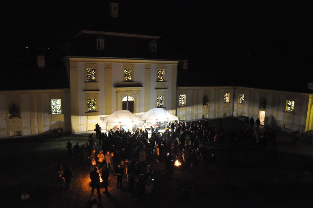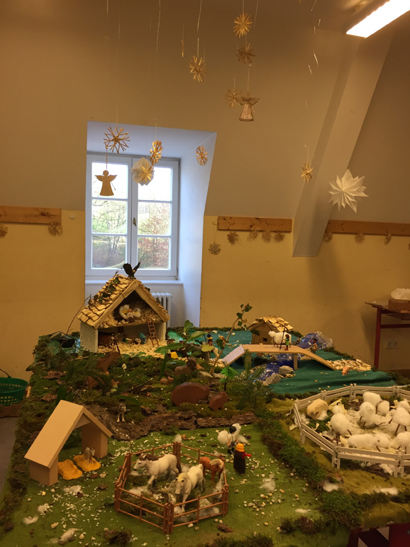 Das Projekt „Freudenhain leuchtet“ führte am Mittwochabend die gesamte Schulfamilie des Auersperg-Gymnasiums zu einer Weihnachtsfeier für alle Sinne zusammen. Nach Einbruch der Dunkelheit strömten die Schüler mit ihren Familien, aber auch Ehemalige und Freunde aufs Schulgelände. Die 5. und 6. Klassen boten bei einem bunten Basar im Festsaal Selbstgebackenes und Selbstgebasteltes an. Alle 7. bis 10. Klassen hatten in ihren Klassenzimmern Krippen aufgebaut, die zu einem Spaziergang durch das weihnachtlich geschmückte Schulgebäude animierten. Stärken konnte man sich im Schlosshof mit großzügig von der Metzgerei Brodinger gestifteten Bratwürsten, Gemüsesuppe und Punsch. Der Erlös aller Verkäufe wird zusammen mit den beim Weihnachtskonzert gegebenen Spenden der Passauer Tafel zugutekommen.
