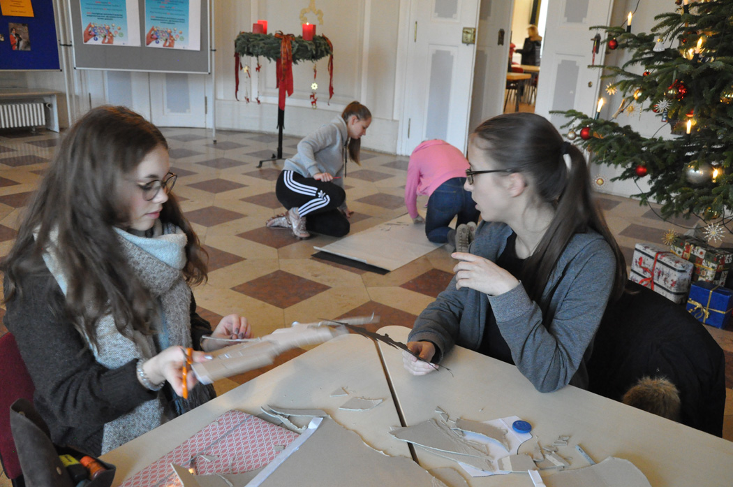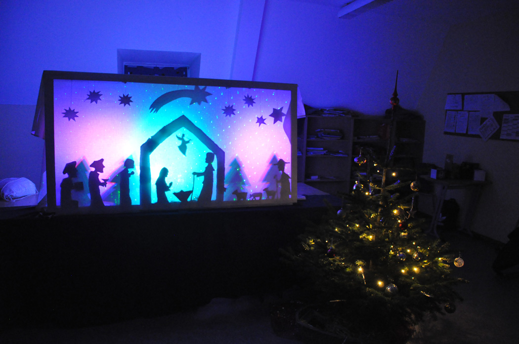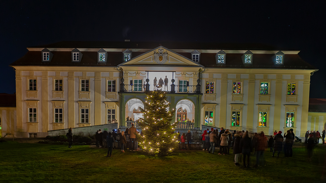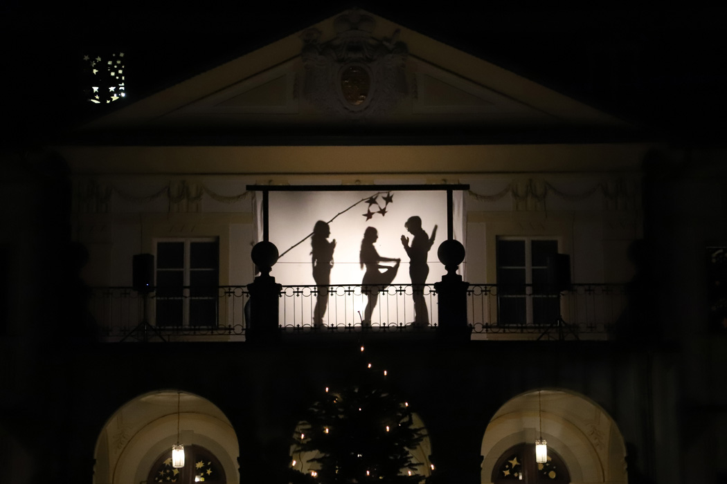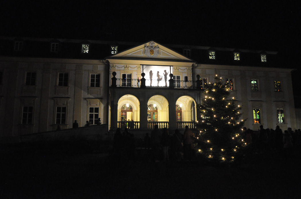 Zweimal an diesem Abend gab es die Gelegenheit zu einem besinnlichen Gottesdienst in der Schlosskirche, wo meditative Texte abwechselnd mit englischen Christmas-Carols vorgetragen wurden, arrangiert von Theresia Kollmann und André Urbanczyk. Den Höhepunkt bildete aber die festliche Illuminierung der Hauptfassade, die die Bläsergruppe unter Leitung von Christoph Rose mit weihnachtlichen Weisen ankündigte. Das durch ein Schattenspiel veranschaulichte und von Stephanie Holly mit der Theatergruppe einstudierte Märchen „Die