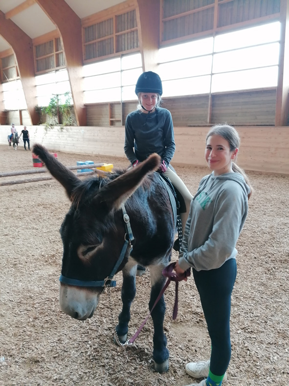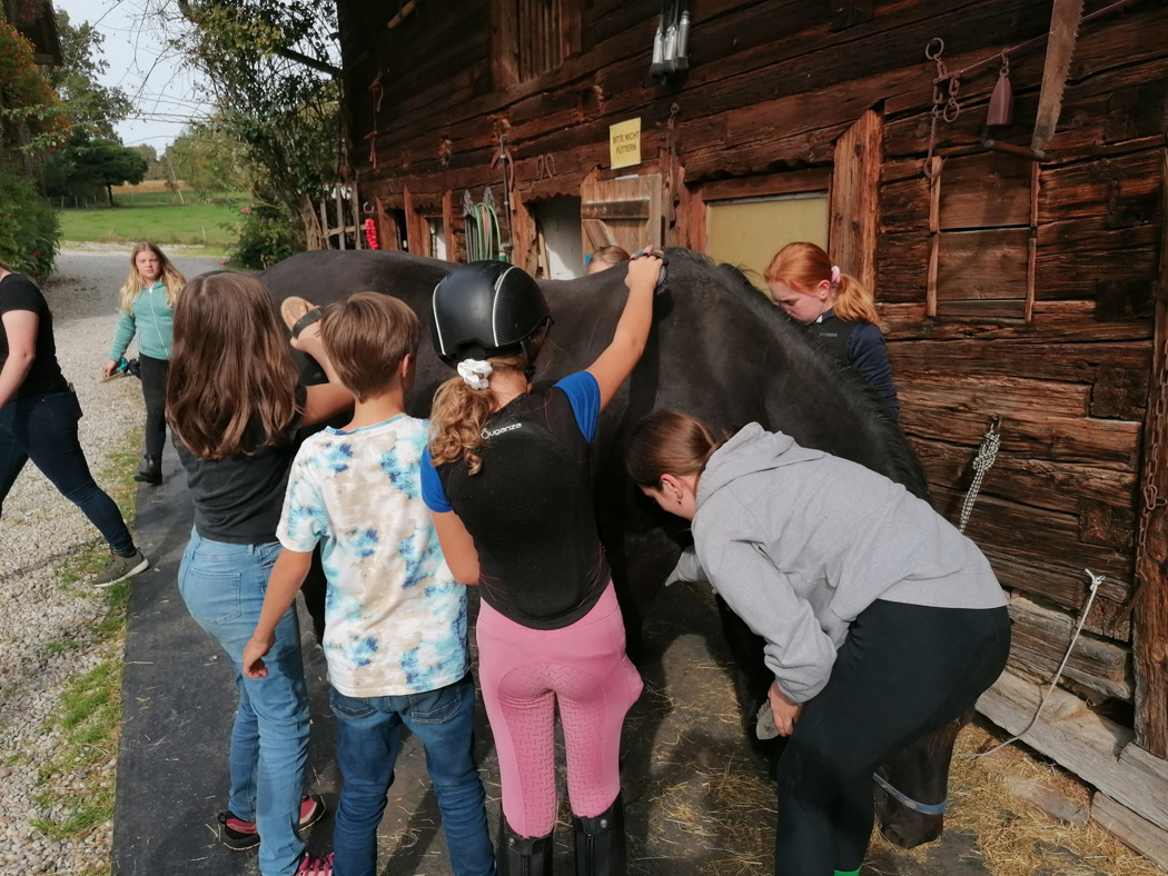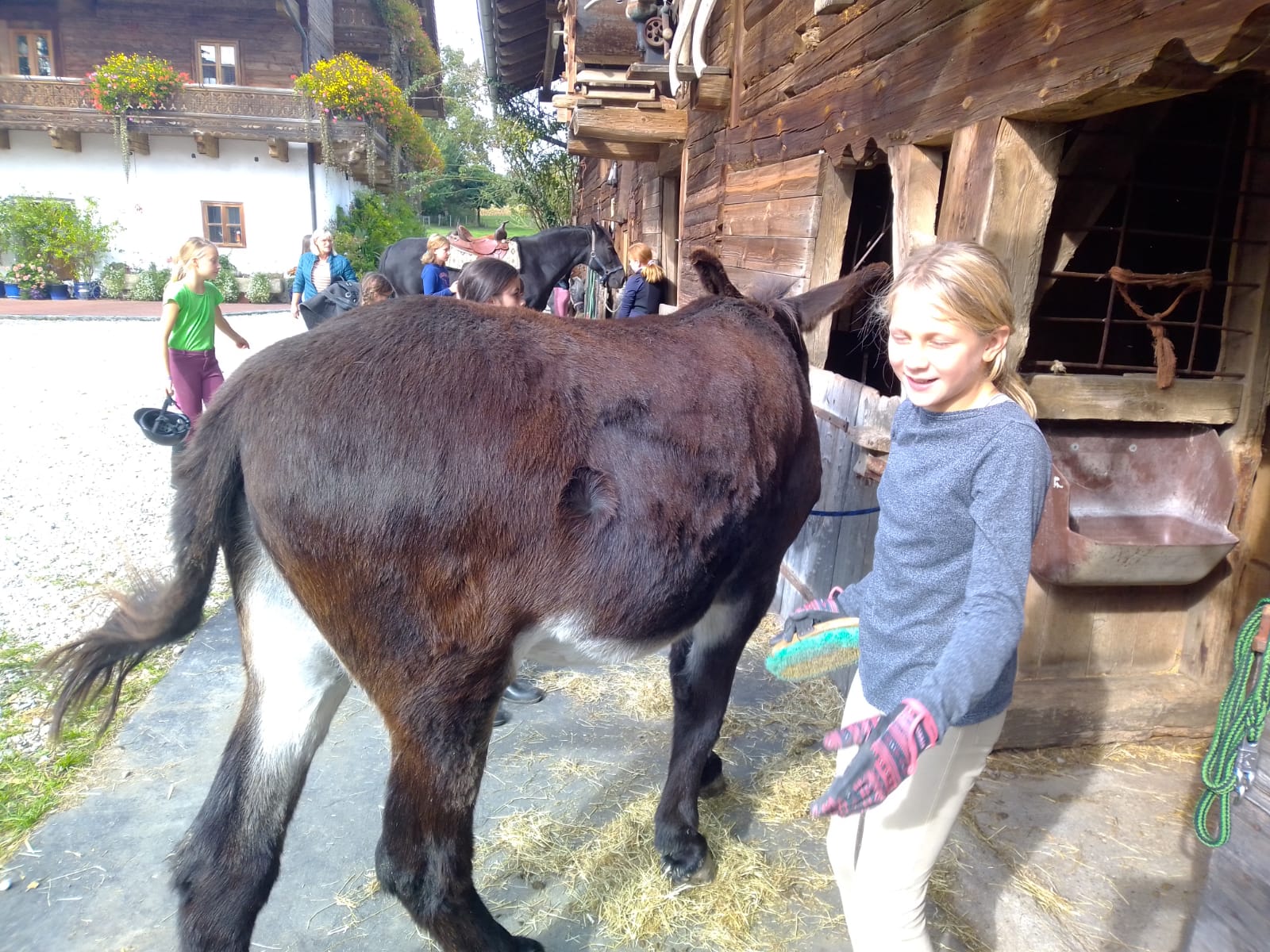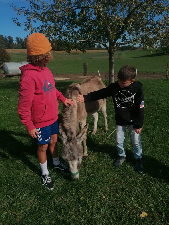 Auch die Klassensprecherwahl fand während des Bauerhofaufenthaltes statt, nachdem Herr Schöttner zuvor ausführlich auf die Aufgaben und Funktion der SMV hingewiesen hatte. Mit großer Ernsthaftigkeit wurde schließlich von den Schülerinnen und Schüler eine demokratische Entscheidung getroffen, die in der Hektik des Schulalltages sicherlich untergegangen wäre. Ein Höhepunkt der Fahrt war der Reitnachmittag. Pferd „Fritz“, Pony „Rosa“ und Esel „Luggi“ drehten mehr oder weniger geduldig ihre Runden in der Reithalle. „Es ist ein tolles Gefühl, auf so einem großen Pferd zu sitzen. Ich hätte nicht gedacht, dass ich mich das traue!“ Dieser Schülerkommentar zeigt, wie wichtig solche Erfahrungen sind. Tierische Mutproben, überstandene Heimwehmomente, rasante Schaukelpartien, gruselige Werwolfrunden, elektrisierende Weidezäune, ungewohnte Funklöcher - und ein frecher schwarzer Kater, der die Schülerinnen und Schüler abends aus der Gutenachtgeschichte bis in ihre Träume verfolgte.