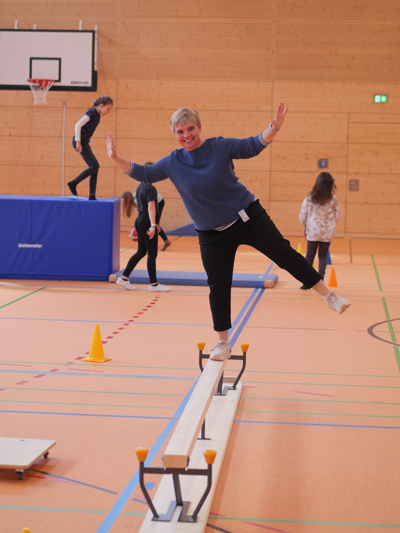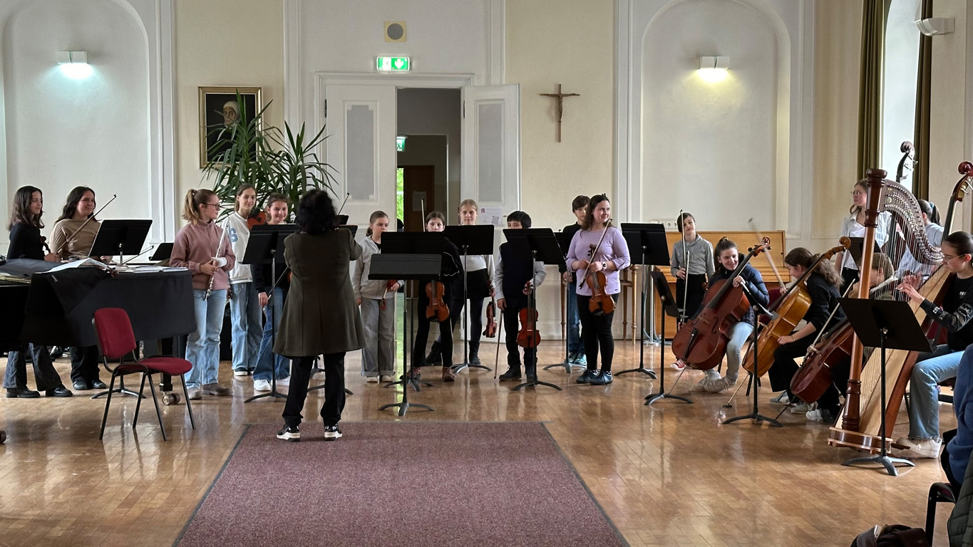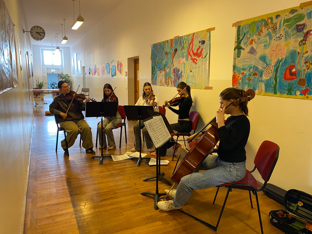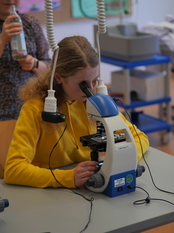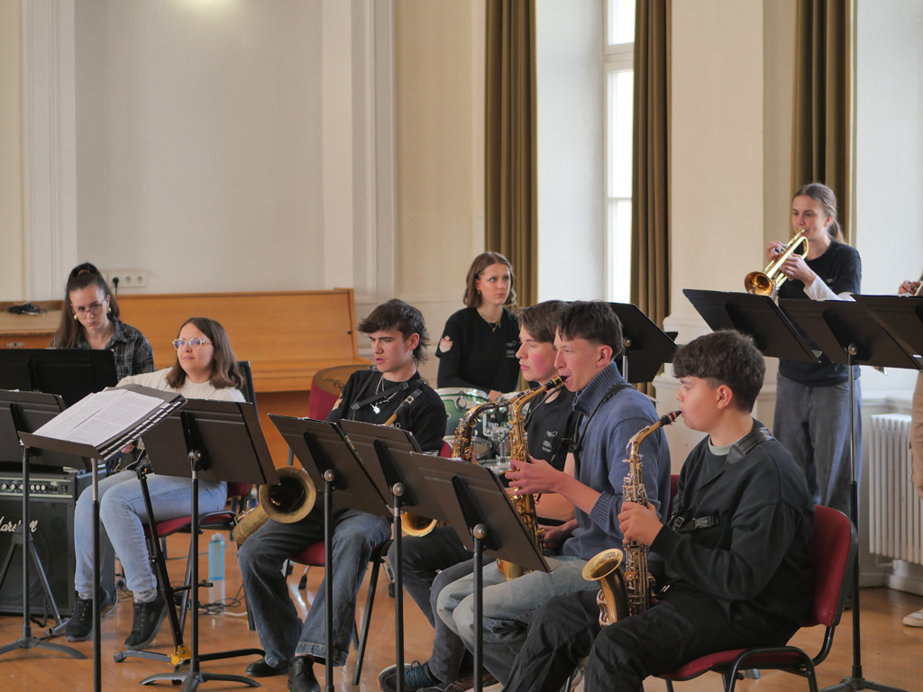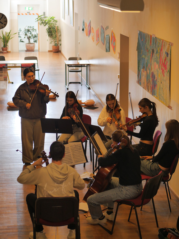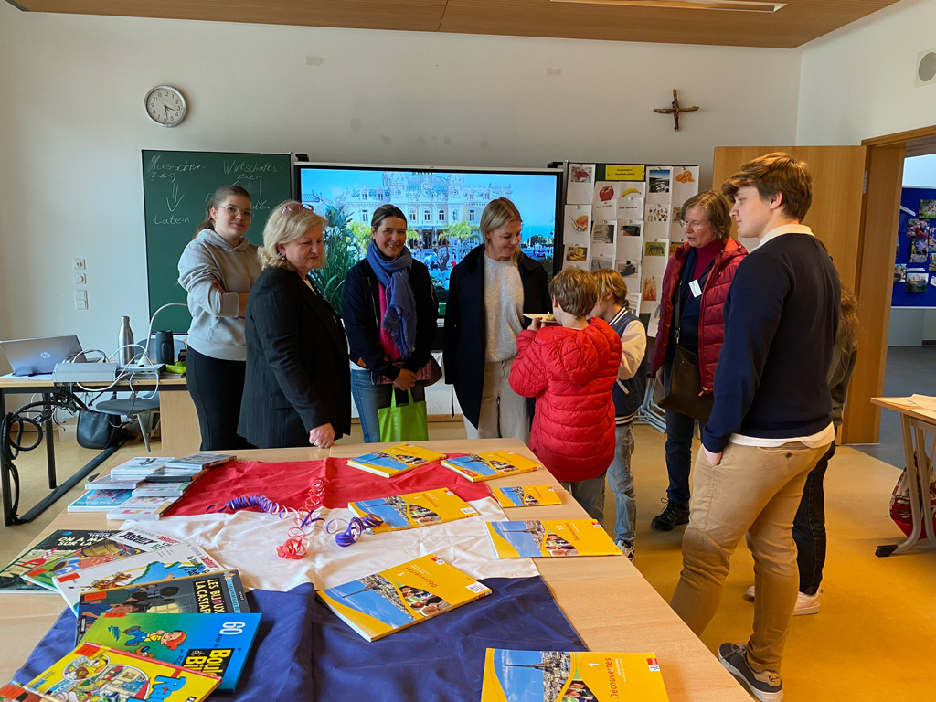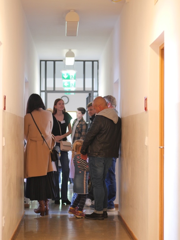 Das weitläufige Schulgelände hinter dem Hauptbau bietet einen kleinen Park zum Erholen, einen Fußballplatz und einen Schulgarten – alles gerne genutzt von den Kindern des Offenen Ganztags. Einen besonderen Charme besitzt das historische Schulgebäude mit Festsaal, eigener Schlosskirche und Rosengarten. In vielen Räumen waren besondere Aktivitäten für die Kinder vorbereitet, z.B. ein Sportparcours, kleine chemische Versuche, Ratespiele, ein Instrumente-Schnuppern, Bauen und Programmieren von Legorobotern und vieles mehr. Nach den Führungen konnte der Nachwuchs seine Lieblingsaktivitäten vertiefen, während sich die Eltern im vom Elternbeirat betreuten Café austauschten. Einen besonderen Leckerbissen bot Lateinlehrer Quirin Würfl am ersten Besuchsnachmittag mit sechs Schülerinnen der 9a, die „Dinner for One“ auf Lateinisch aufführten und großen Applaus ernteten. Ihre Freude an der Musik zeigten musizierende Schüler quer durch alle Klassen, die als Solisten, in kleinen Ensembles oder mit der Bigband im Festsaal oder in den Gängen auftraten. Bis in den frühen Abend hinein blieben manche Familien, um das breitgefächerte Angebot zu genießen.