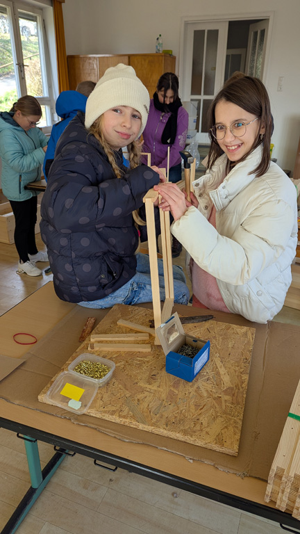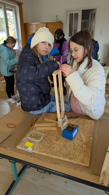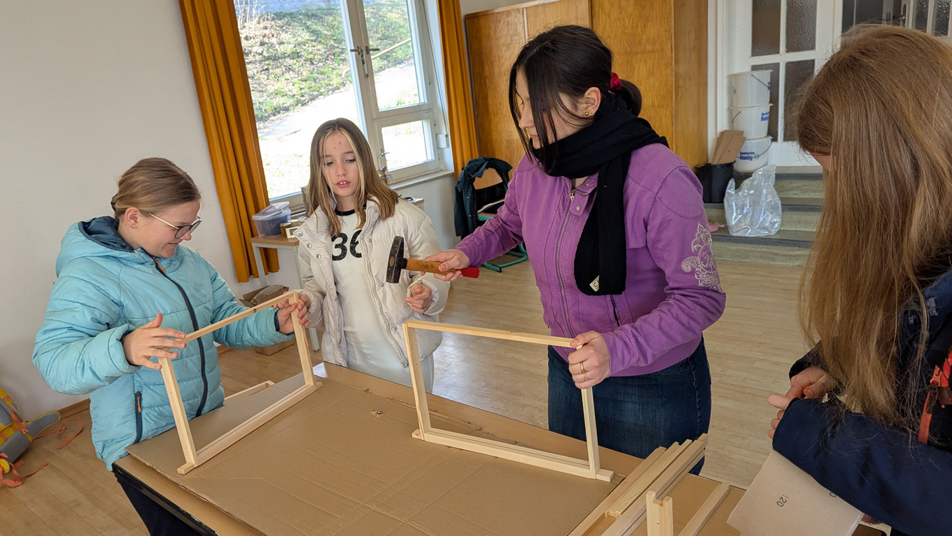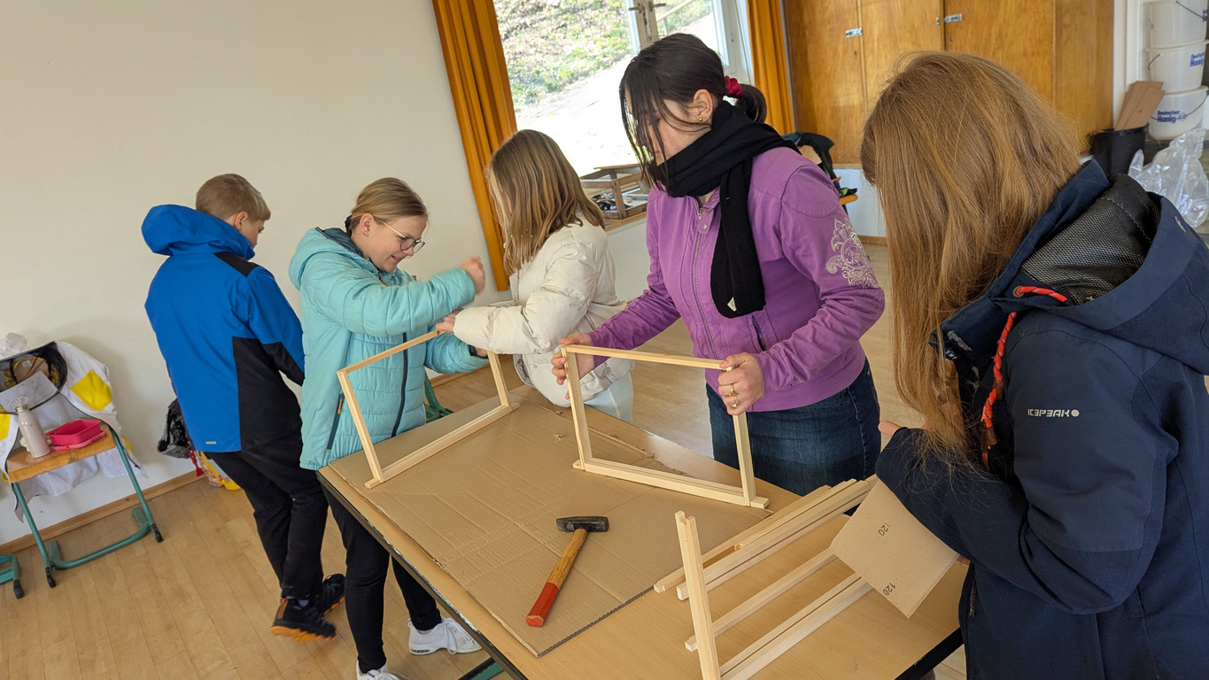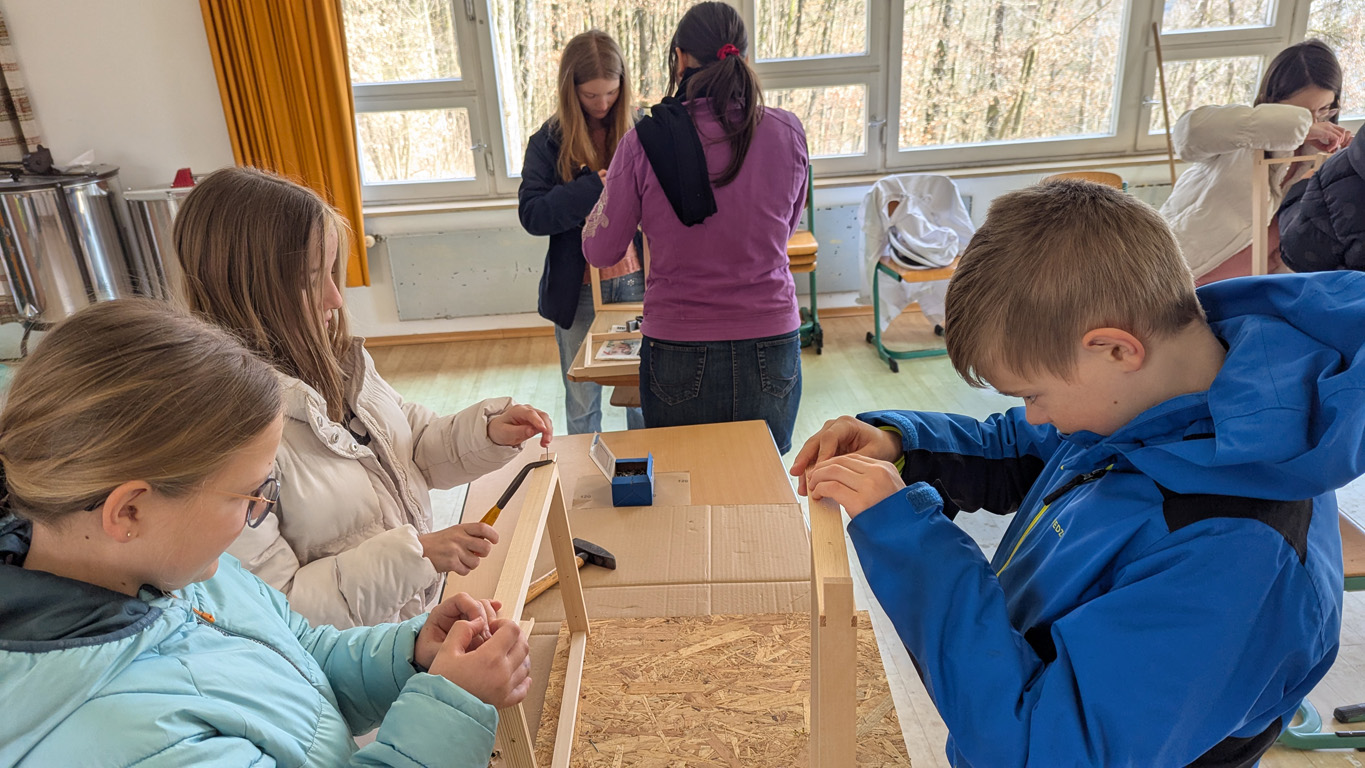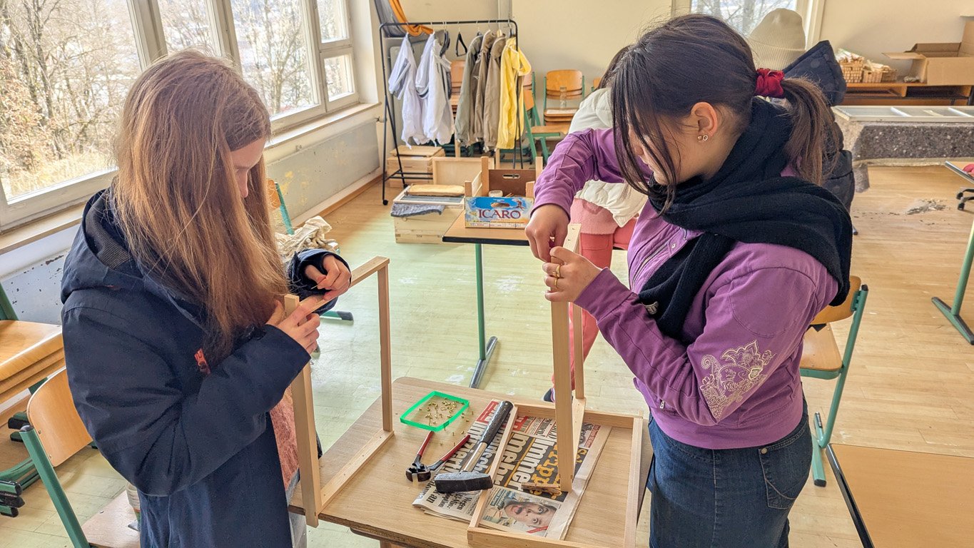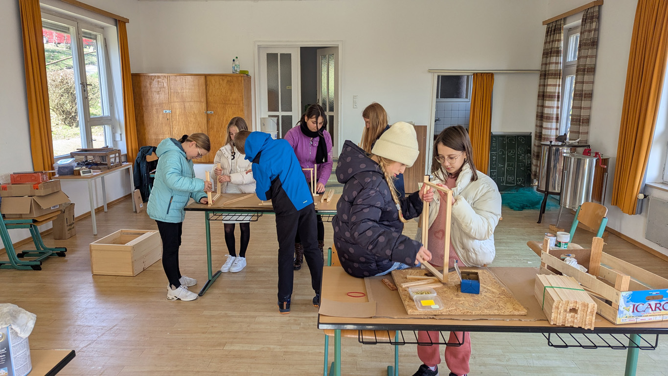 Die Teilnehmer des Wahlkurses Schulimkerei bei Marita Schöttner sind bereits fleißig am Werkeln, auch wenn von den Bienen wegen des kalten Wetters noch kaum etwas zu sehen ist. Im ehemaligen Zeichenhaus sind sie gerade dabei, Material für die Imkerei vorzubereiten, wie z.B. Rähmchen zusammenzubauen. Wenn es dann wärmer wird, können sie endlich einen Blick in die Bienenkästen werfen.