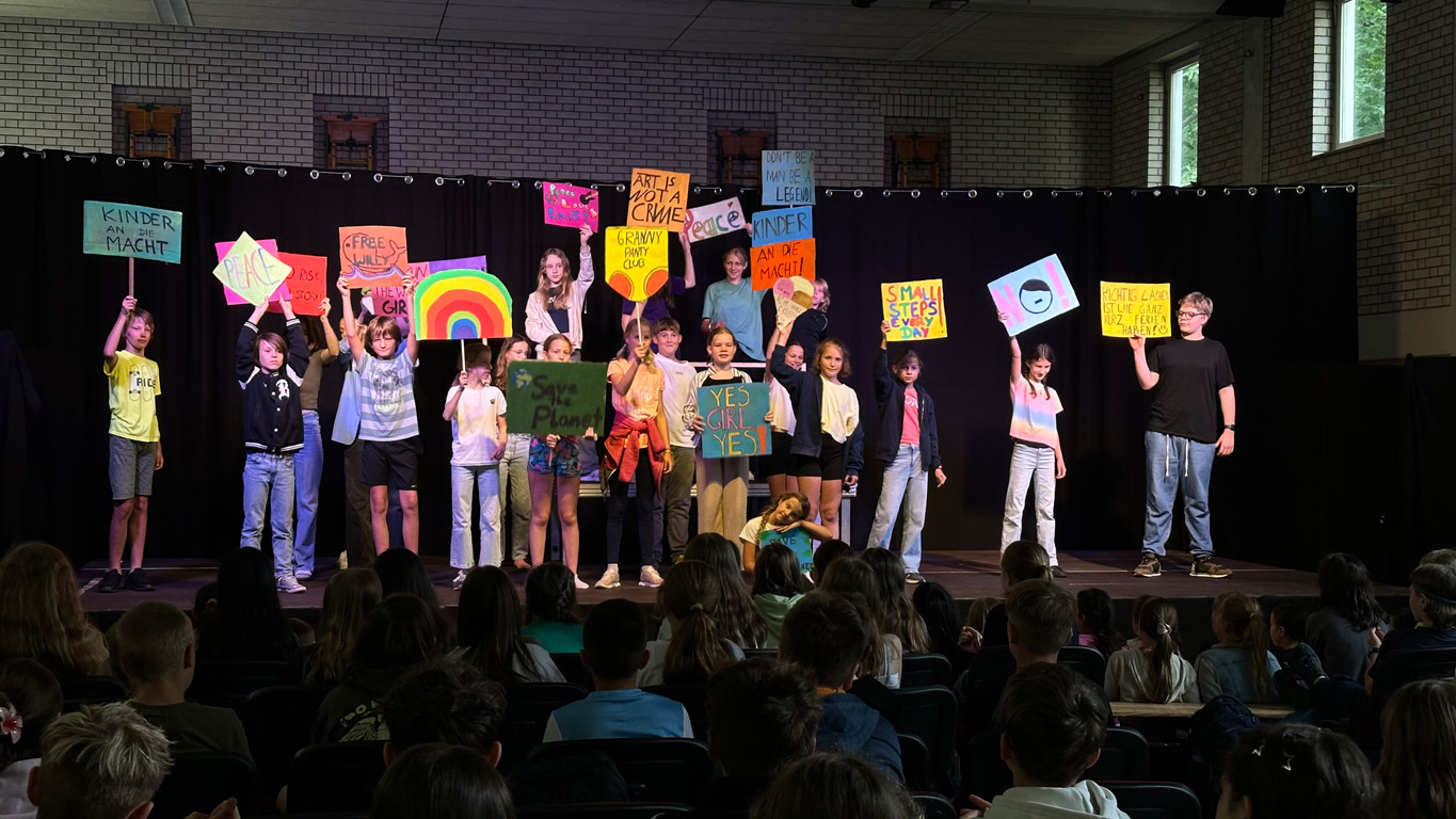 Doch auf ihrer Konferenz geraten auch die Tiere in Streit darüber, was zu tun ist gegen den Meeresspiegelanstieg, gegen Waldbrände und Hungersnöte. Letztendlich beschließen sie den Menschen ihr Liebstes zu nehmen, nein nicht ihre Autos, sondern ihre Kinder. Diese werden kurzerhand entführt und die Erwachsenen müssen endlich die Gefährdung der Erde und damit die Problematik ihres Handelns erkennen, zumal am Ende ein großer Teil der jungen Schauspieler als Demonstranten auf der Bühne steht, mit Plakaten und Bannern Kinderrechte einfordert und skandiert: Es ist unsere Zukunft! Alles für die Kinder!