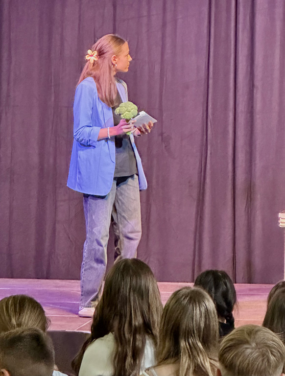 Trotz des ernsten Themas gab es aber auch viel zu schmunzeln für das Publikum, wenn die Reporterin bei den Horrormeldungen statt mit einem Mikro, mal mit einer Gurke, dann mit einer Paprika oder einem Broccoli-Strunk auf die Bühne trat. Wenn Klischees aufgebrochen wurden, indem bei Familie Elefant und bei Familie Giraffe die Väter das Geschirr spülen und Papa Löwe sich für die Konferenz noch schnell die Mähne frisch blondieren und ondulieren lässt. Wenn die Tiere mit Wenigem auf ihr Wesentliches reduziert wurden und trotzdem klar erkennbar waren; so reichte eine Pelztasche vor dem Bauch für das Känguru, eine Pappflosse auf dem Rücken für den Hai, ein Frack für den Pinguin und eine große rote Feder für den Papagei.