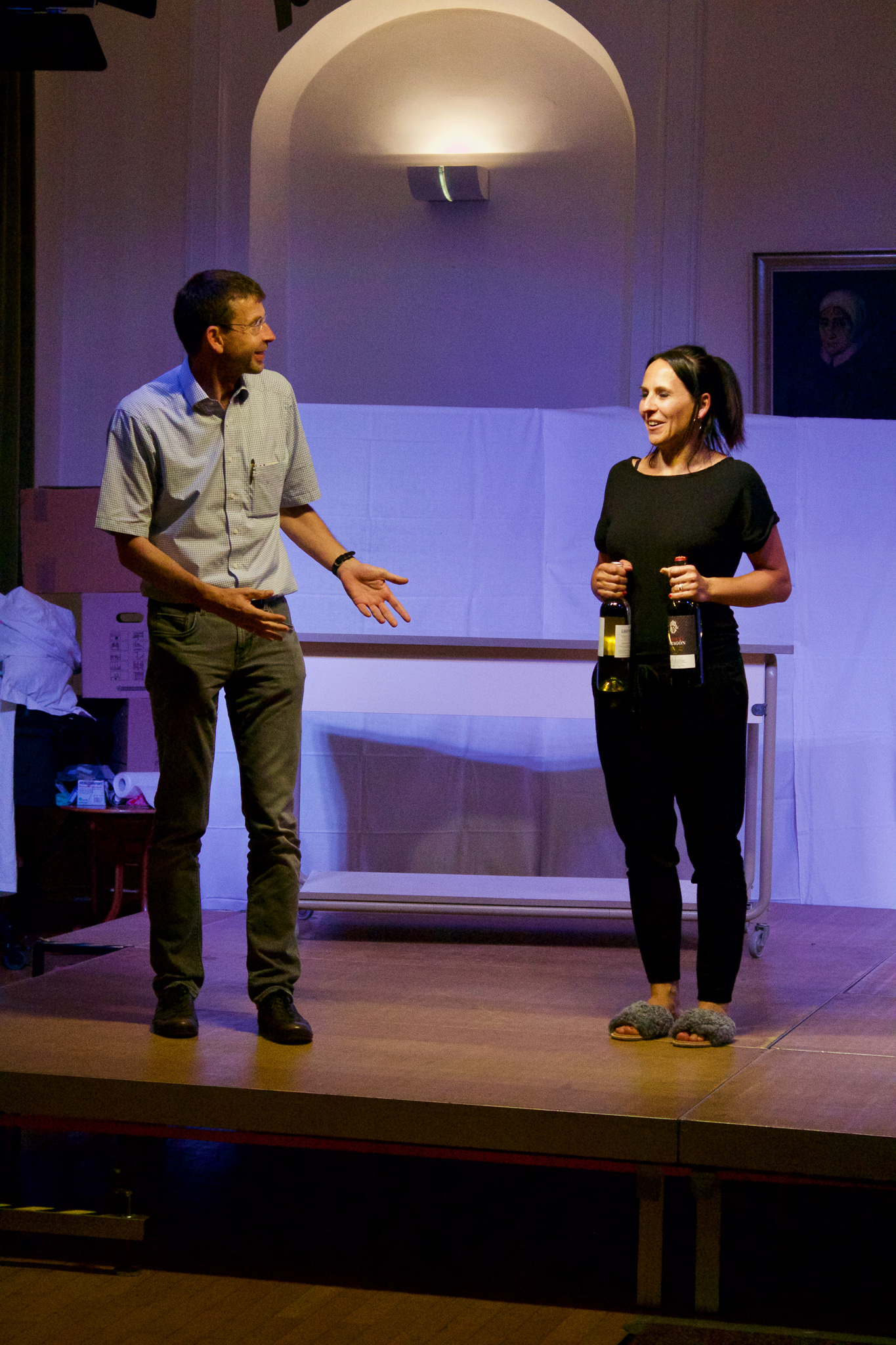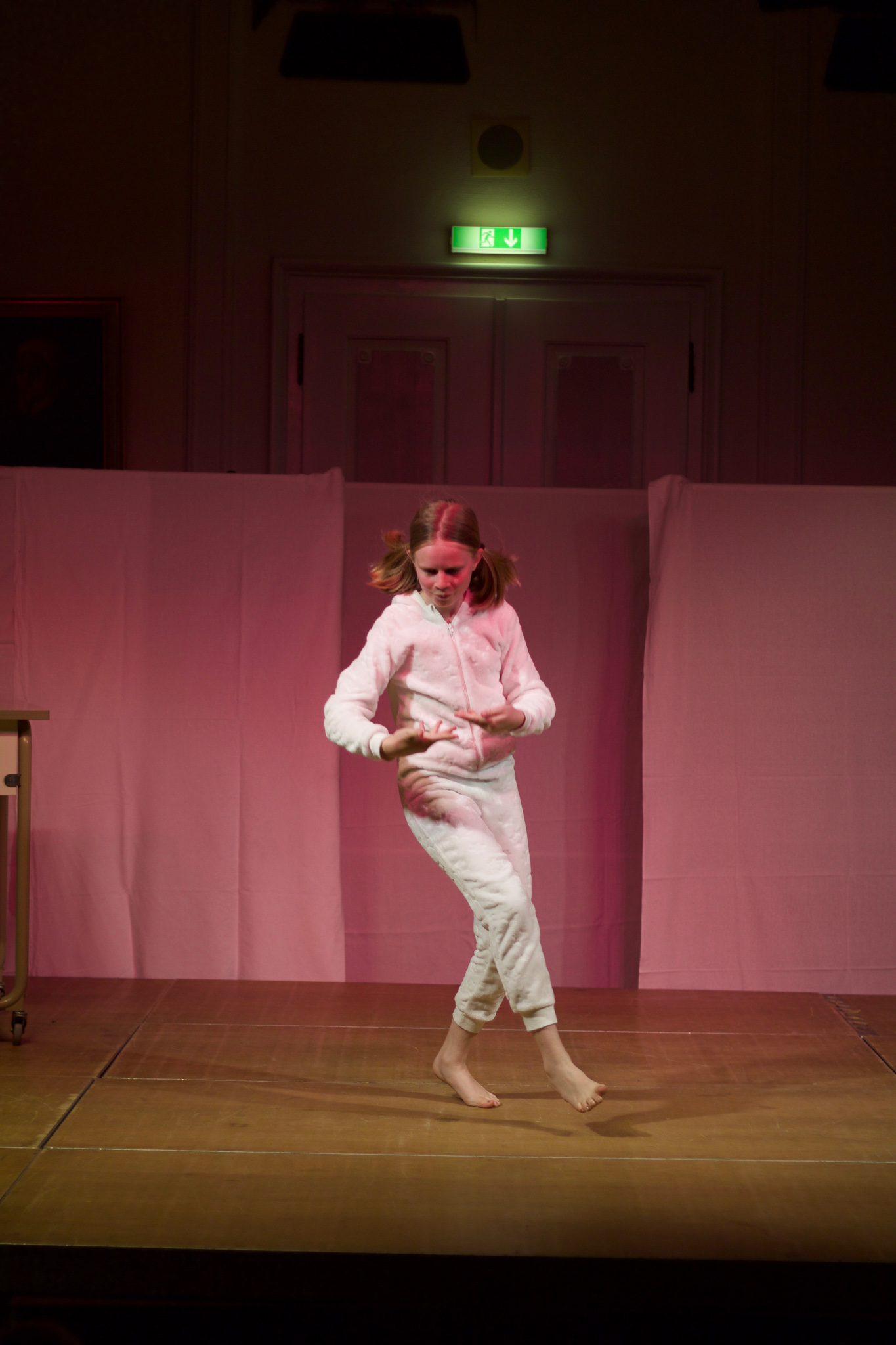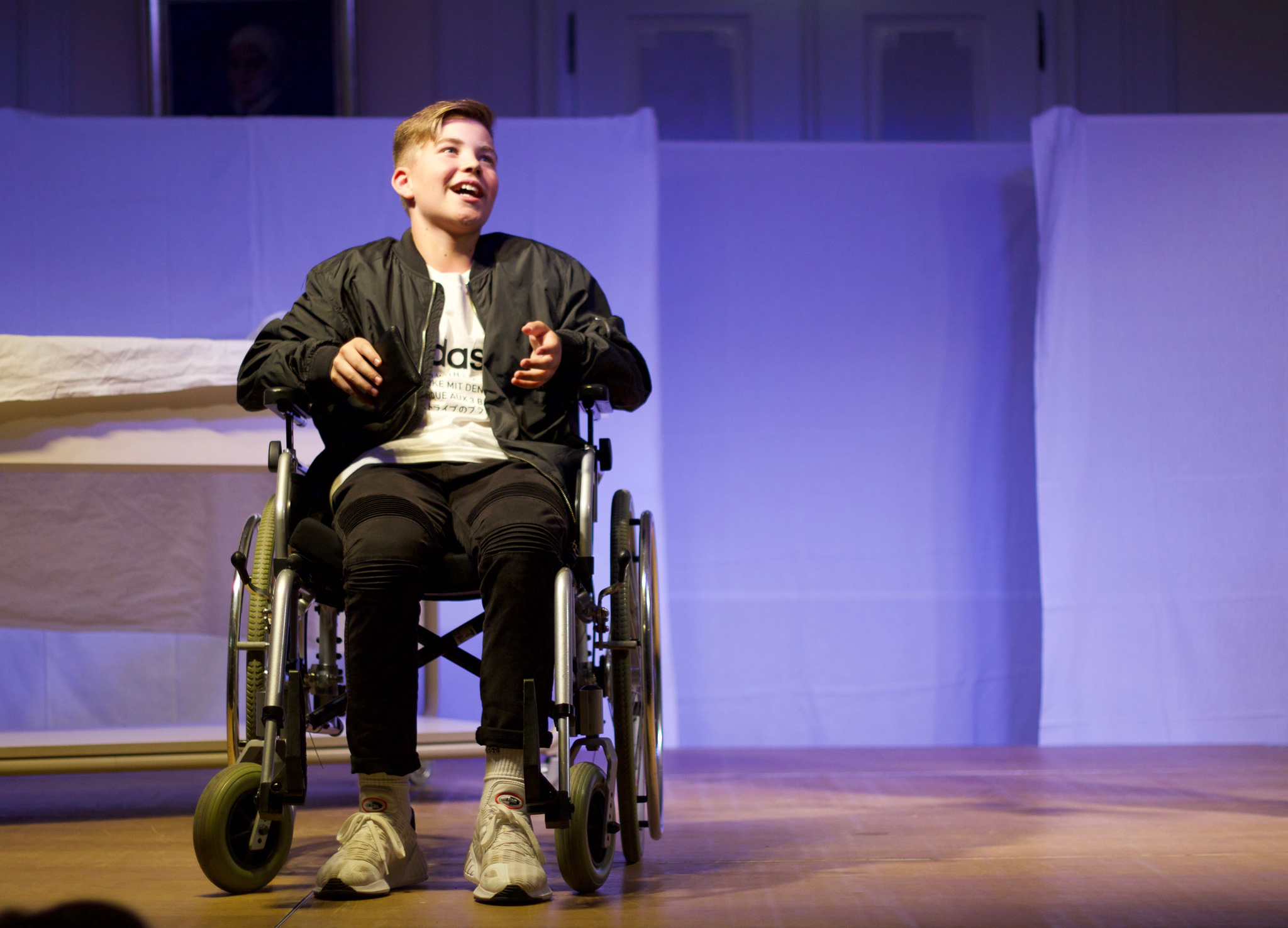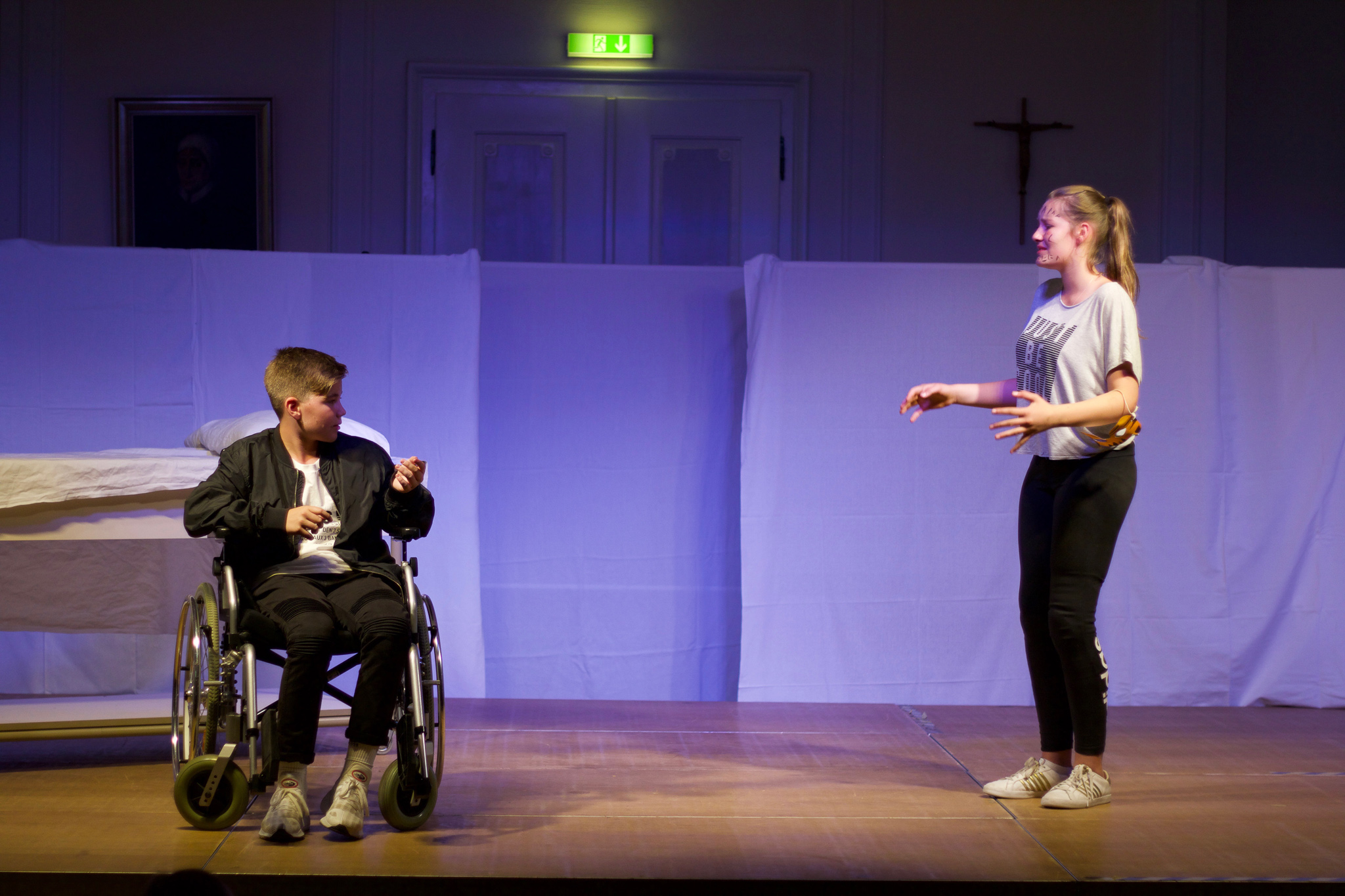 Zu Udo Lindenbergs Titel "Die Bühne ist angerichtet" über den "Lampenfieber-Vampir" vor einem Auftritt flitzten junge Schauspieler mit Requisiten auf die ganz in Weiß gehaltenen Bretter, die die Welt bedeuten. Dort spielt sich gerade ein Familiendrama ab, das die Schüler mit Pantomime und reich an Gesten darbieten. Die Mutter (Ramona Ratzinger) der 13-jährigen Hauptfigur Fitz, die Paula Englmaier gelungen darstellt, wirft ihrem Mann (Alram Bögner) nach dem Streit den Ehering vor die Füße und geht. Die erwachsene 30-jährige Fitz, die Patrizia Gordini wunderbar mimt, erscheint als Kinderärztin an einer Klinik und erzählt in einer Rückblende von ihrer Schwester Bente (Ilmira Stromberger). Sie erinnert an die schlimmen Wochen voller Emotionen, als sich die Eltern vor 15 Jahren trennten.