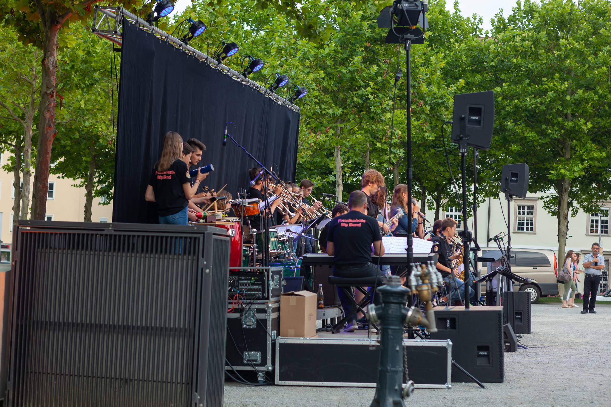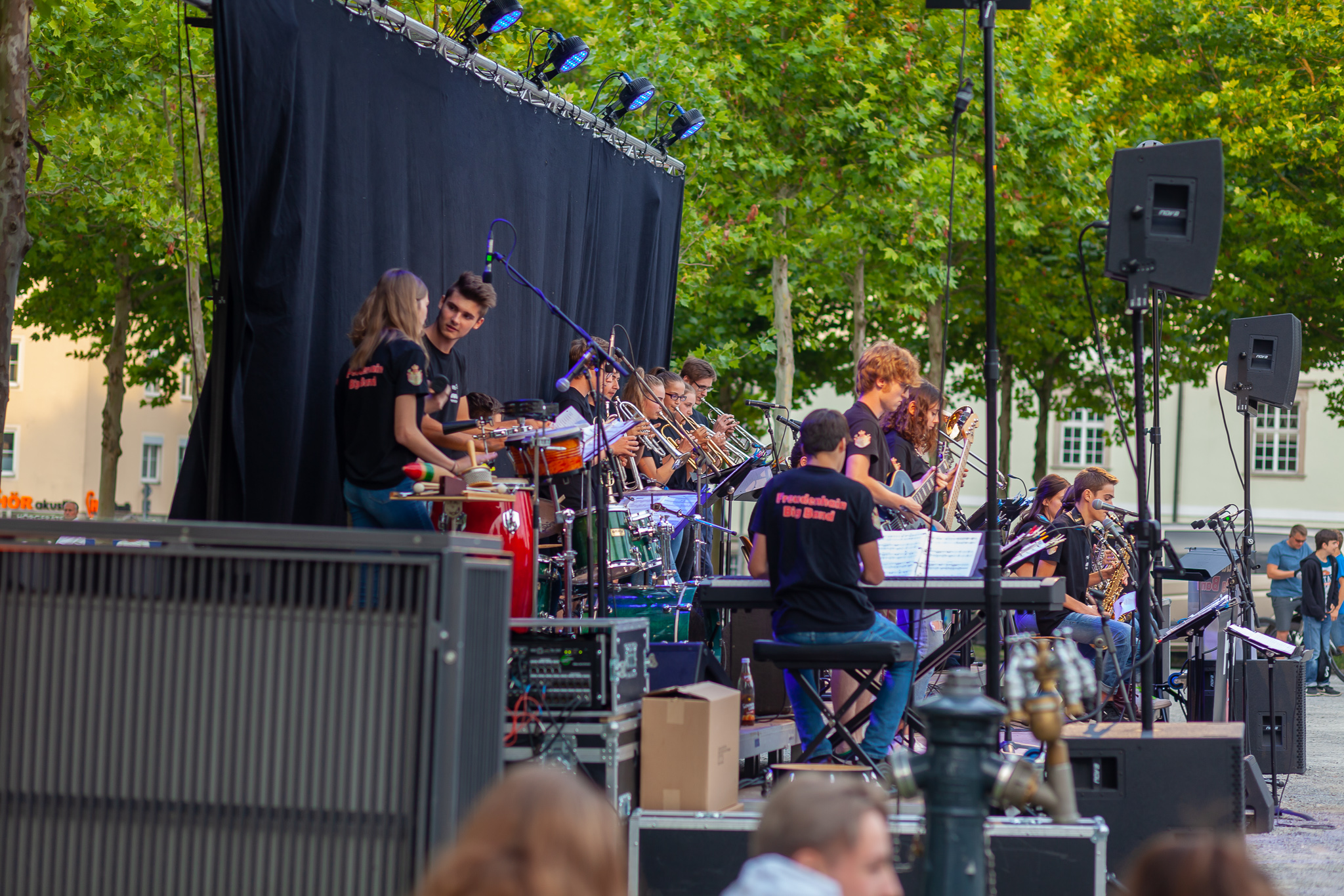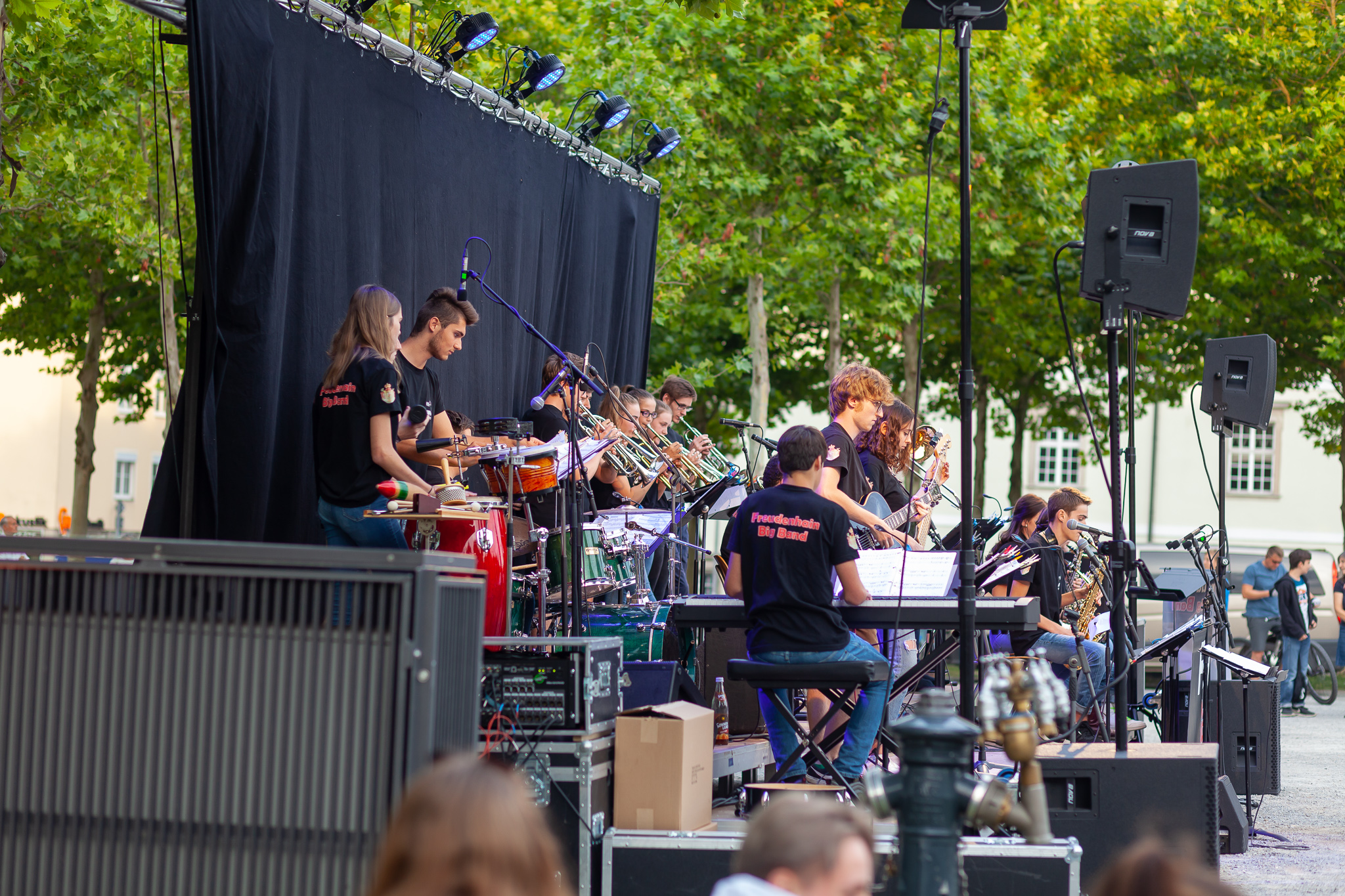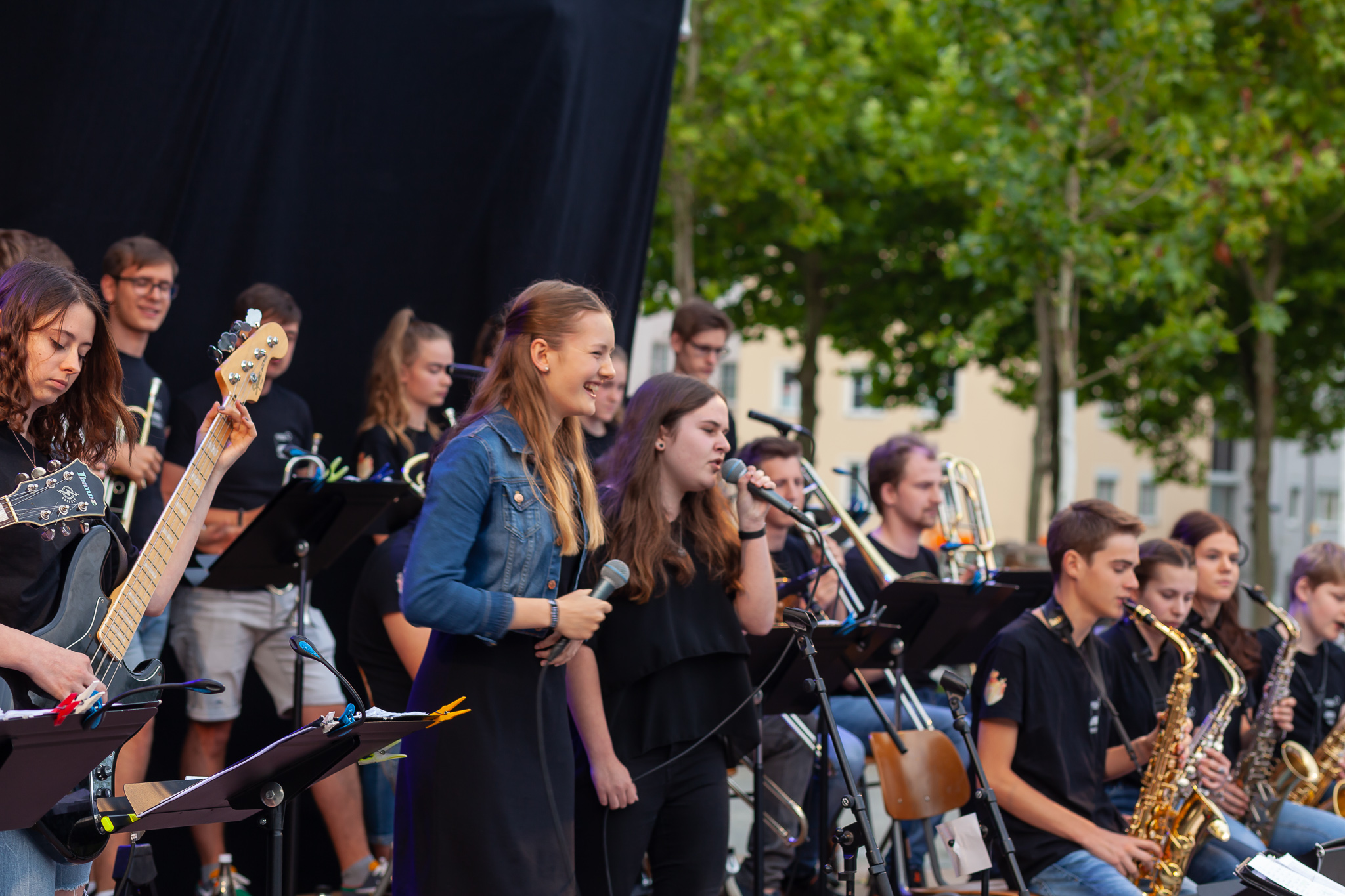 Großer Tag für die Big Band: Bei der „Blue night“ am Montagabend machte das Gymnasium Freudenhain wieder einmal seine musische Ausrichtung deutlich. Das Besondere daran ist der Ort, denn nicht hinter den schützenden Mauern des Schul-Schlosses präsentieren sich die Schüler-Musiker, sondern an einem der öffentlichsten Orte der Stadt, im Klostergarten. Damit ist klar, dass nicht nur Eltern, Geschwister und andere Angehörige im Publikum sitzen, sondern auch Passanten, fremde Zuhörer also. Umso höher steigt natürlich die Herzfrequenz bei den Schülern auf der Bühne, vor allem denen, die zum ersten Mal in der Big Band mitspielen. „Es müssen sich aber alle trauen zu improvisieren, auch die Neuen“, verrät Bandleader Christoph Rose ein Grundprinzip. Den Weg zum Selbstvertrauen meisterte denn auch jeder.