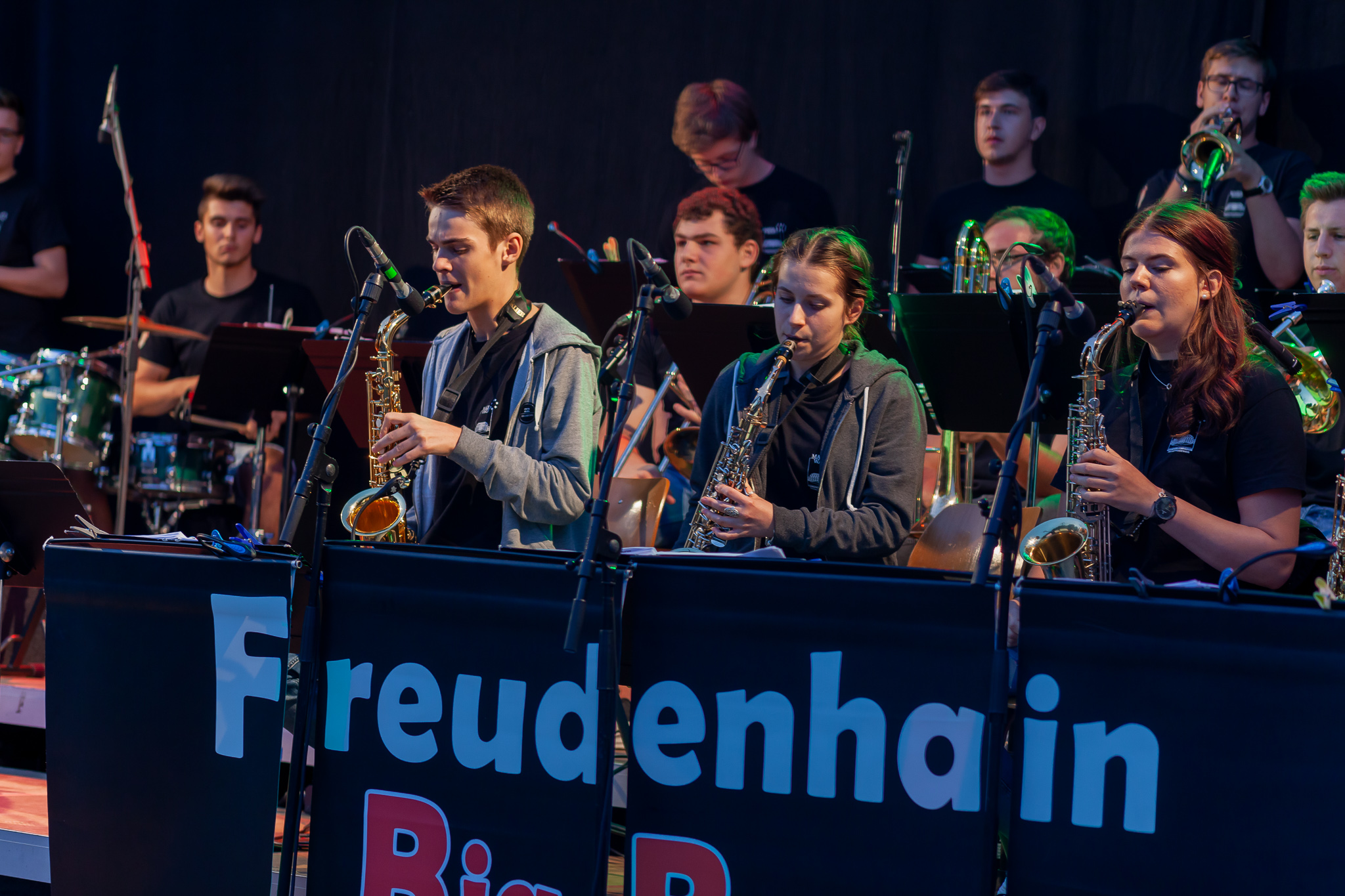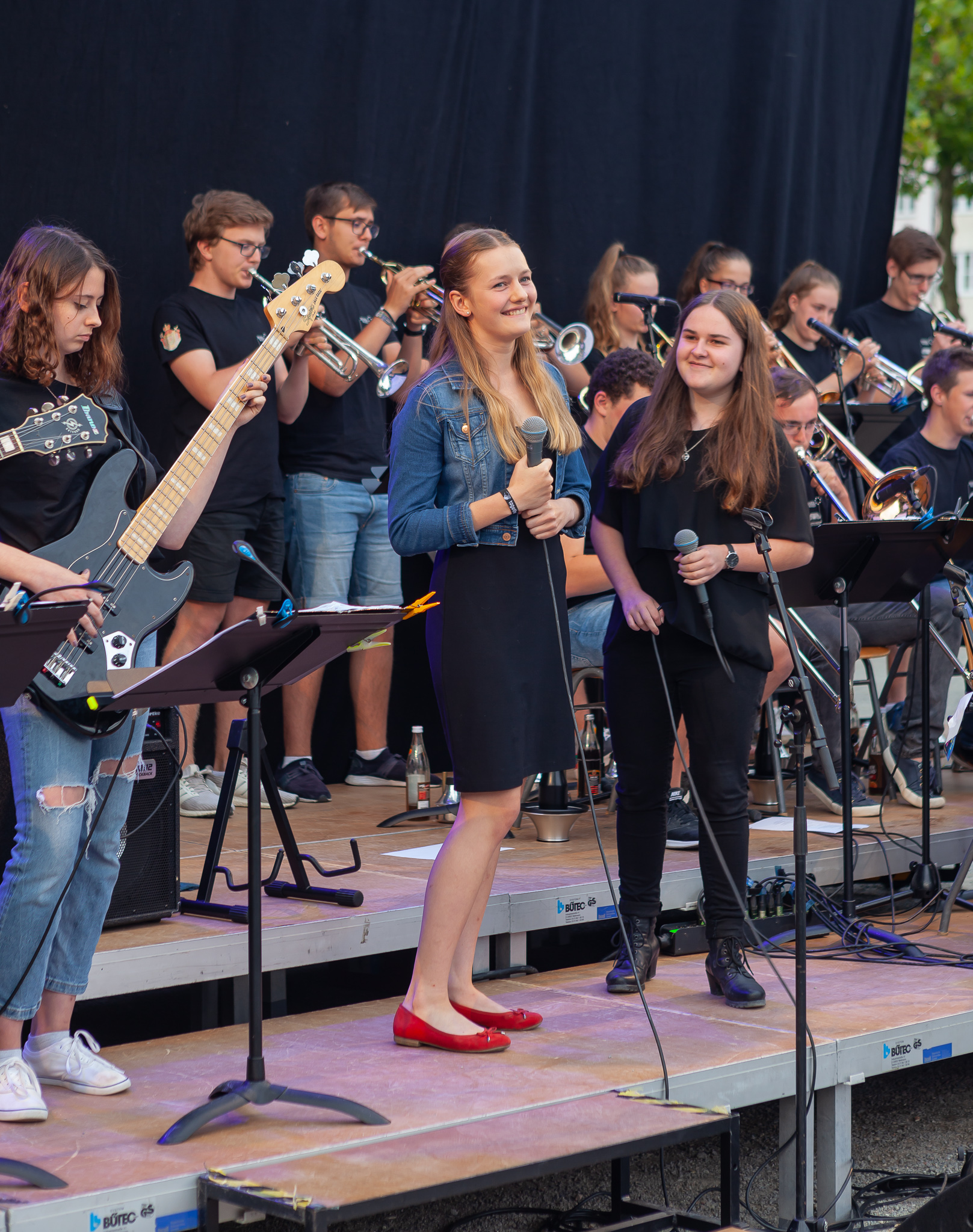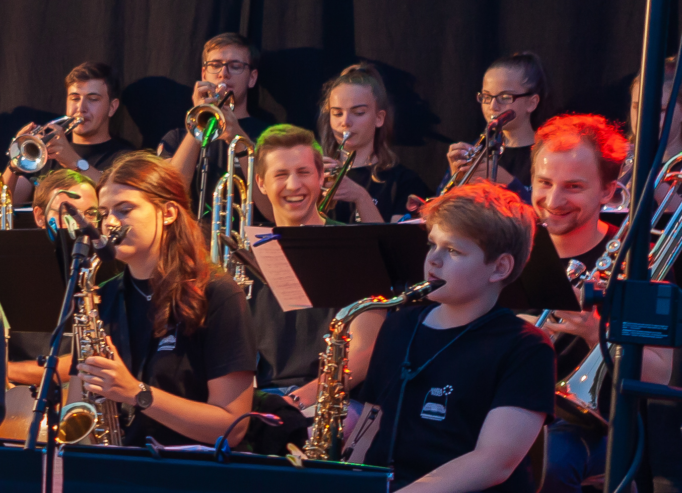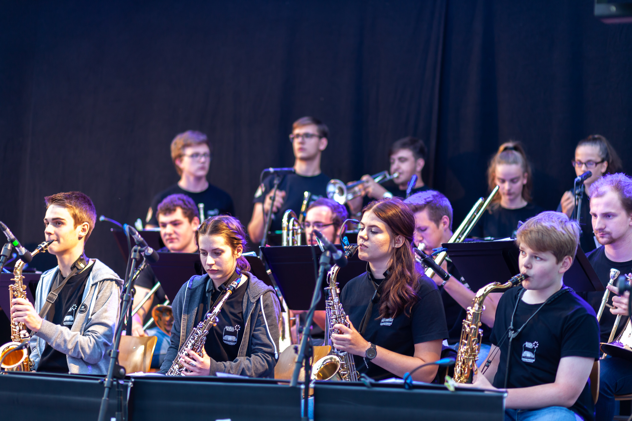 Großer Tag für die Big Band: Bei der „Blue night“ am Montagabend machte das Gymnasium Freudenhain wieder einmal seine musische Ausrichtung deutlich. Das Besondere daran ist der Ort, denn nicht hinter den schützenden Mauern des Schul-Schlosses präsentieren sich die Schüler-Musiker, sondern an einem der öffentlichsten Orte der Stadt, im Klostergarten. Damit ist klar, dass nicht nur Eltern, Geschwister und andere Angehörige im Publikum sitzen, sondern auch Passanten, fremde Zuhörer also. Umso höher steigt natürlich die Herzfrequenz bei den Schülern auf der Bühne, vor allem denen, die zum ersten Mal in der Big Band mitspielen. „Es müssen sich aber alle trauen zu improvisieren, auch die Neuen“, verrät Bandleader Christoph Rose ein Grundprinzip. Den Weg zum Selbstvertrauen meisterte denn auch jeder.