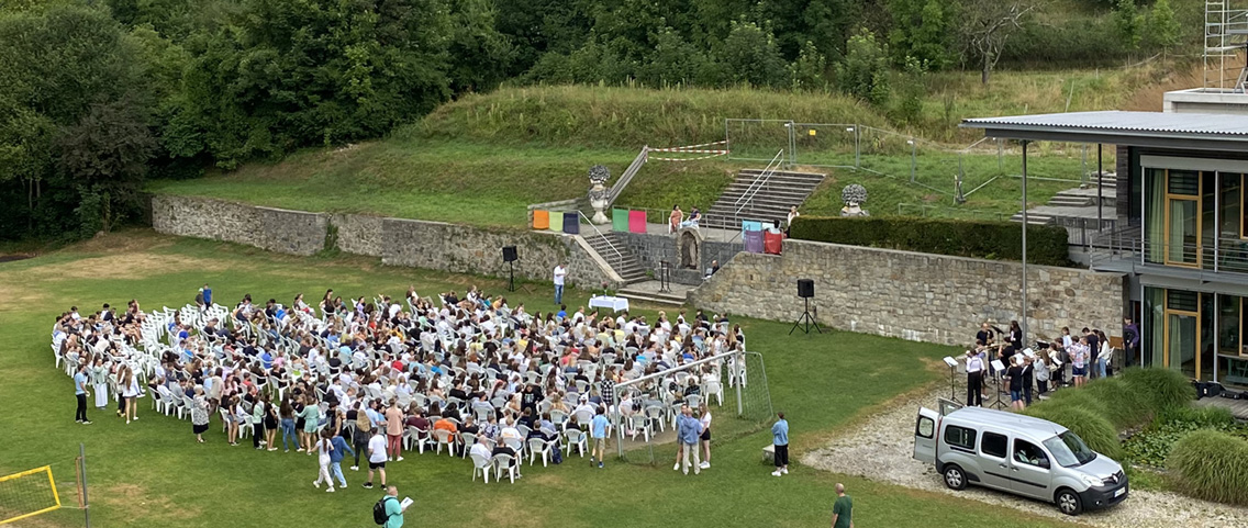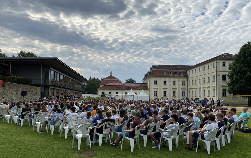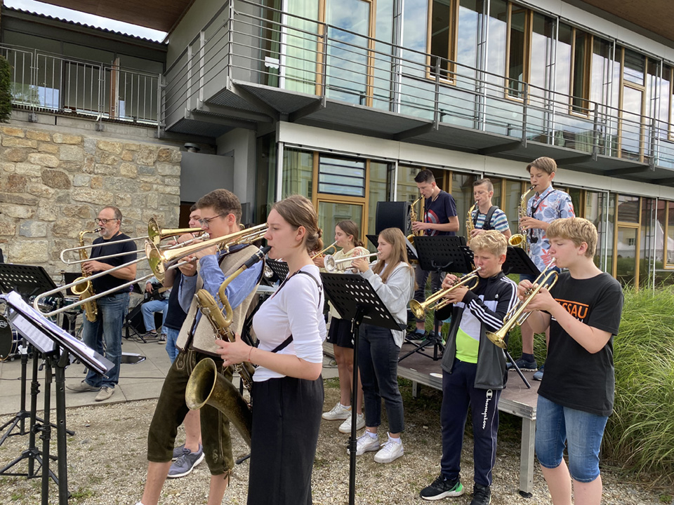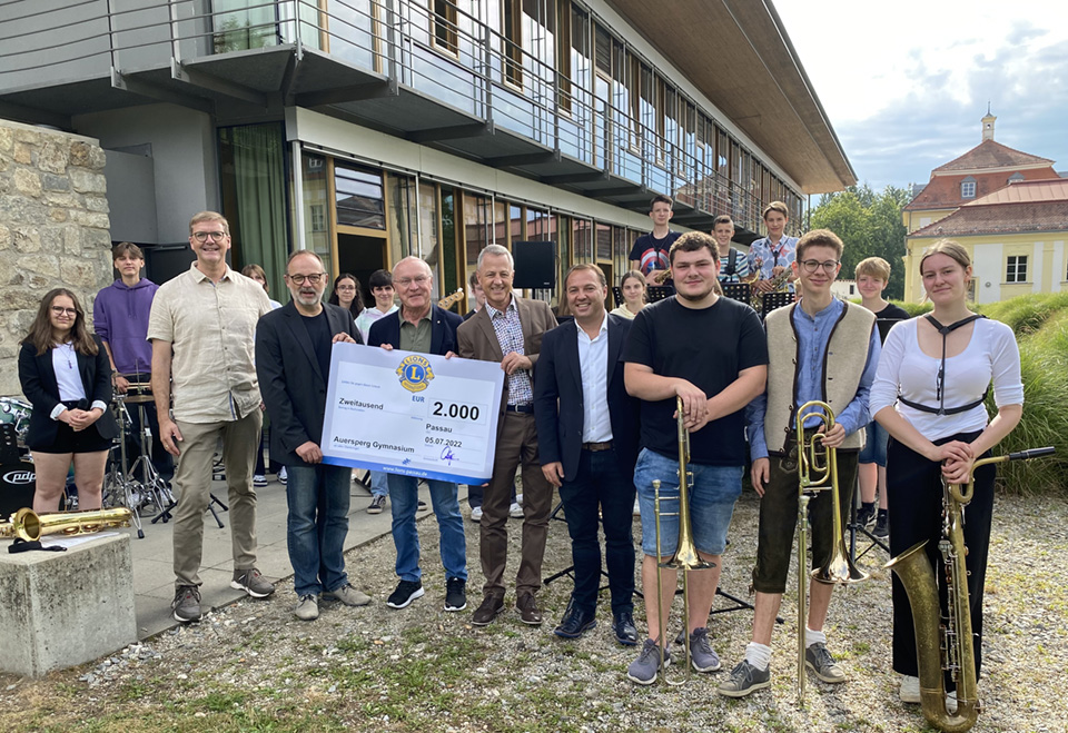 Am letzten Schultag überbrachten Johann Koller, Gernot Hein und Stefan Aigner (Mitte, v.l.) vom Passauer LIONS-Club der Freudenhainer Bigband einen Scheck über 2000 Euro als Anerkennung für ihre Teilnahme am Lions-Bigband-Benefizkonzert in der Dreiländerhalle am 5. Juli 2022. Die Lions-Mitglieder kamen genau im richtigen Moment nach dem Freiluft-Gottesdienst, den Christoph Rose mit einer kleinen Besetzung der Bigband musikalisch umrahmt hatte. Das Geld wird verwendet für die Neuanschaffung und Reparatur von Instrumenten. Die Schulleitung dankte dem Lions-Club ebenfalls herzlich für das Sponsoring.