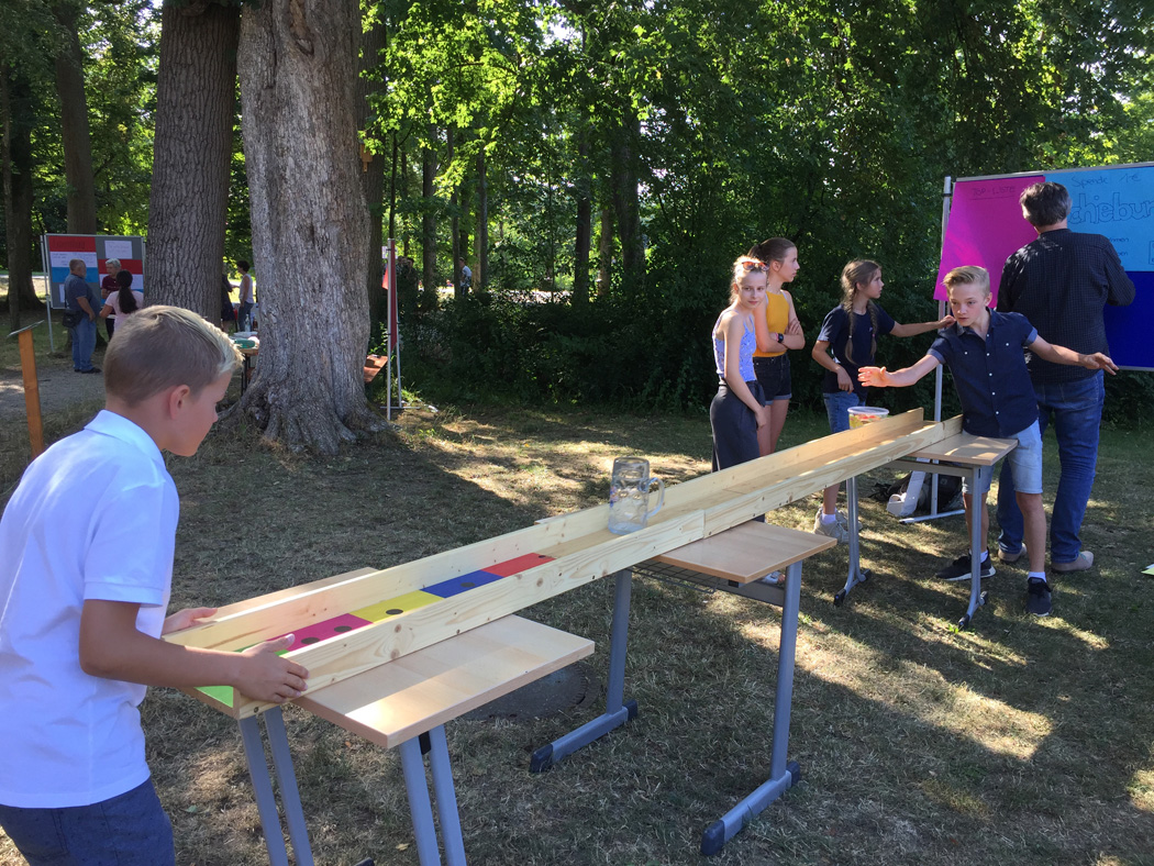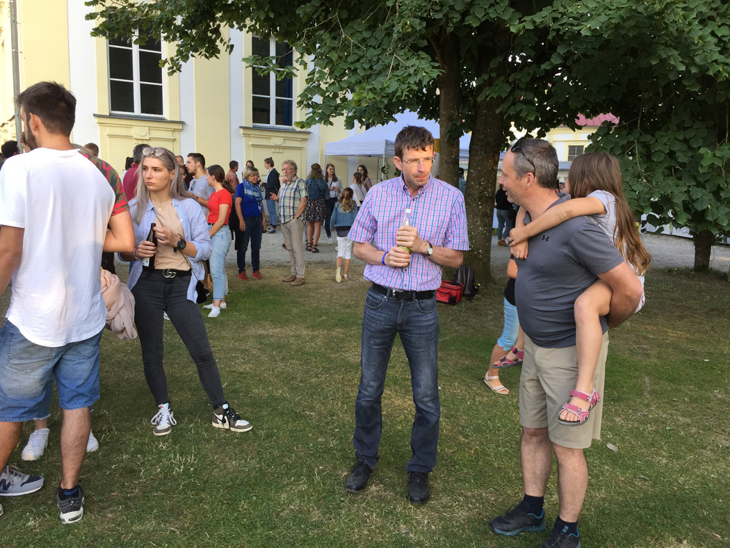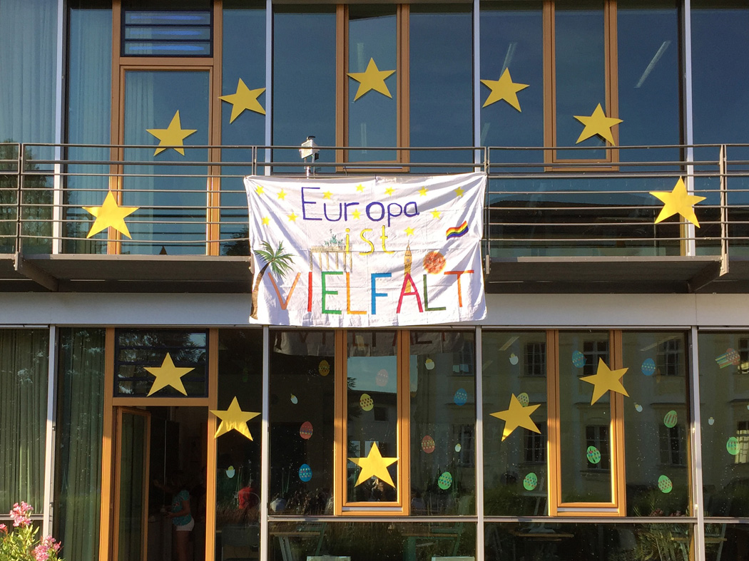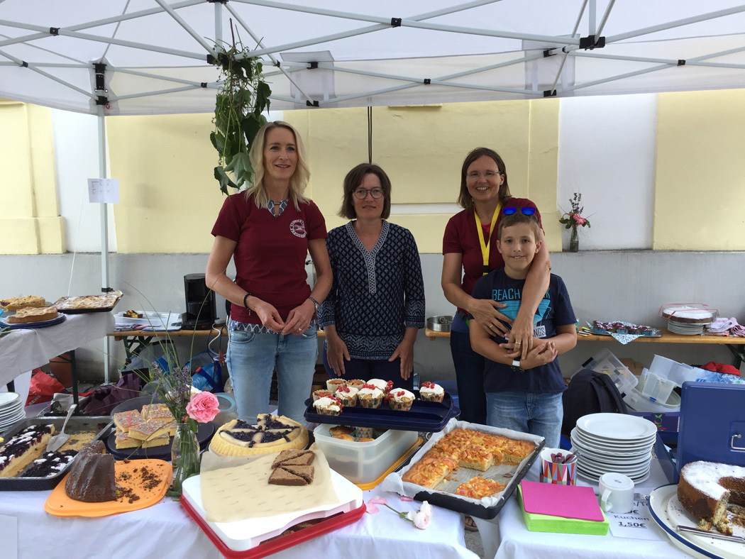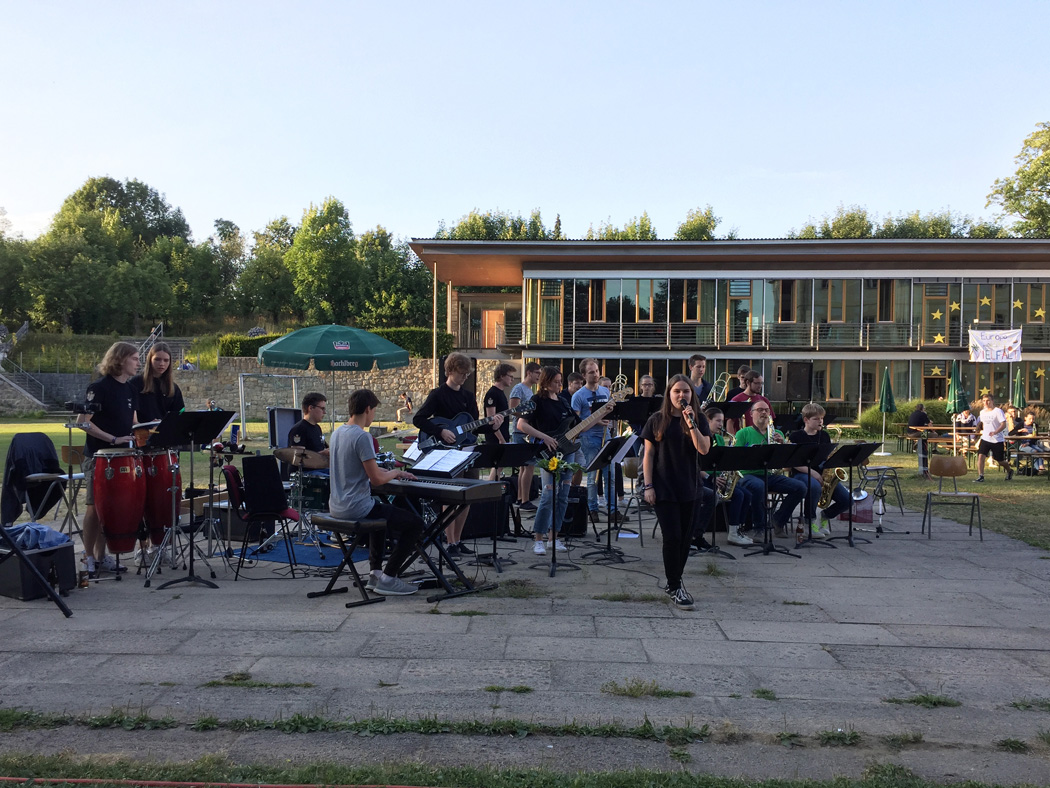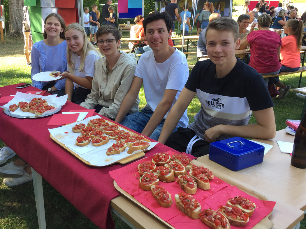 Nachdem die meisten Schüler ihre Schulaufgaben nun hinter sich haben, herrschte auf dem Sommerfest am Mittwoch, den 10. Juli eine gelöste Stimmung. Eltern, Lehrer, Schüler und auch viele Ehemalige begegneten und tauschten sich in zwangloser Atmosphäre aus, bei angenehmen Temperaturen und dem swingenden Sound der Freudenhain Bigband. Passend zum Motto "Europa ist Vielfalt" präsentierte jede Klasse an einem Stand ein Land ihrer Wahl. Der Spaziergang durch den Park glich so einer Reise durch Europa, auf der man sich zum Beispiel mit ungarischem Kuchen, italienischer Bruschetta, englischem Käsetoast oder russischen, alkoholfreien Cocktails stärken konnte. Der Großteil der eingenommenen Spenden an diesen Ständen wurde auf Initiative der SMV an das Passauer Frauenhaus weitergeleitet (siehe extra Artikel).