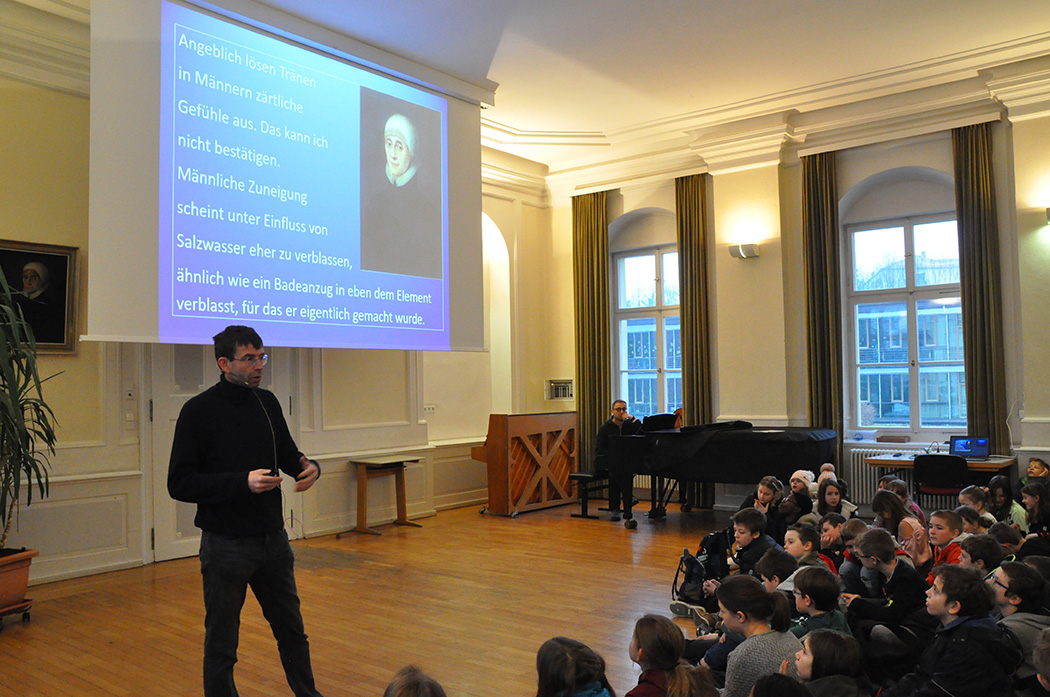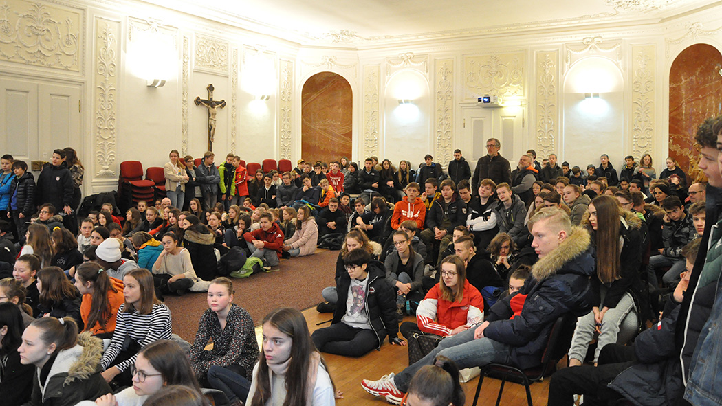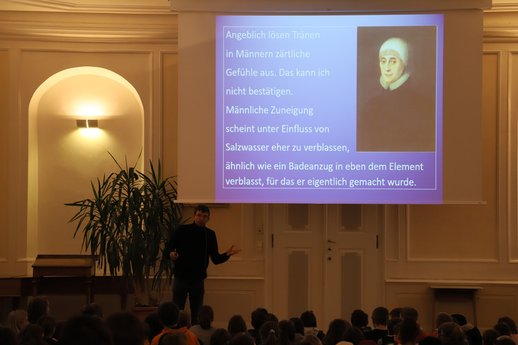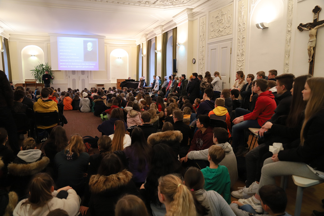 Ein wenig innehalten im Lauf des Schuljahrs hieß es am letzten Freitag im Januar, dem Maria-Ward-Gedenktag, für die Schulfamilie des Auersperg-Gymnasiums. In einer morgendlichen Meditation im Festsaal stellte Herr Zitzl den 5. bis 10. Klassen einige Anliegen der Ordensgründerin Mary Ward vor, die mit ihrem Einsatz für den katholischen Glauben und Benachteiligte auch heute noch ein Vorbild sein kann. Durch das Bemühen um die kleinen Dinge in der Welt könne man diese besser machen. So dankte der Schulleiter allen Schülern für die Spenden der Weihnachtsaktionen, die der Passauer Tafel und Patenkindern der SOS-Kinderdörfer zugutekamen.