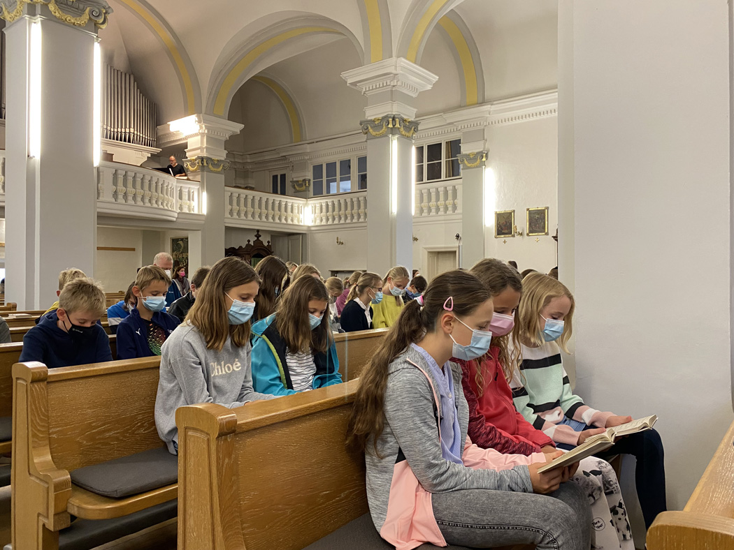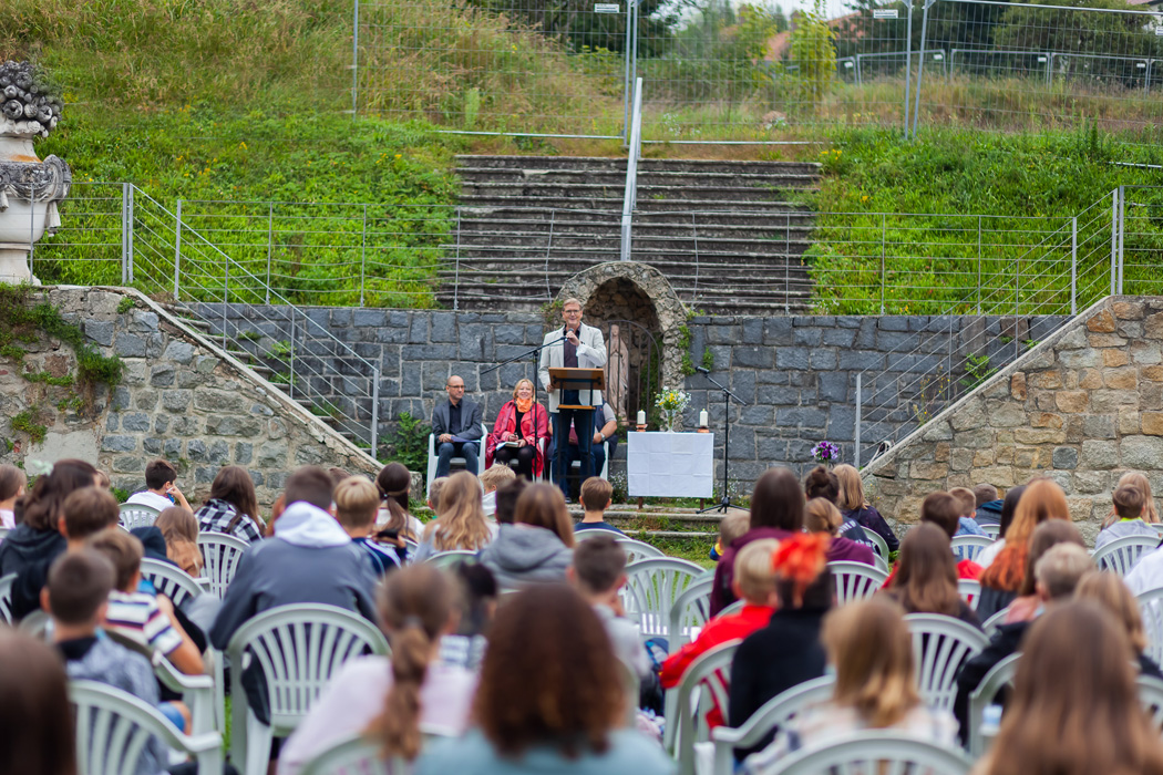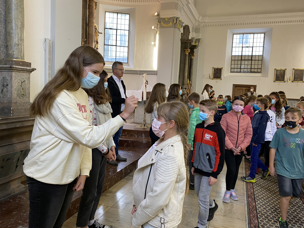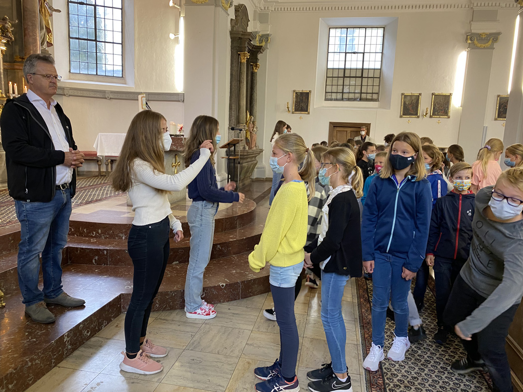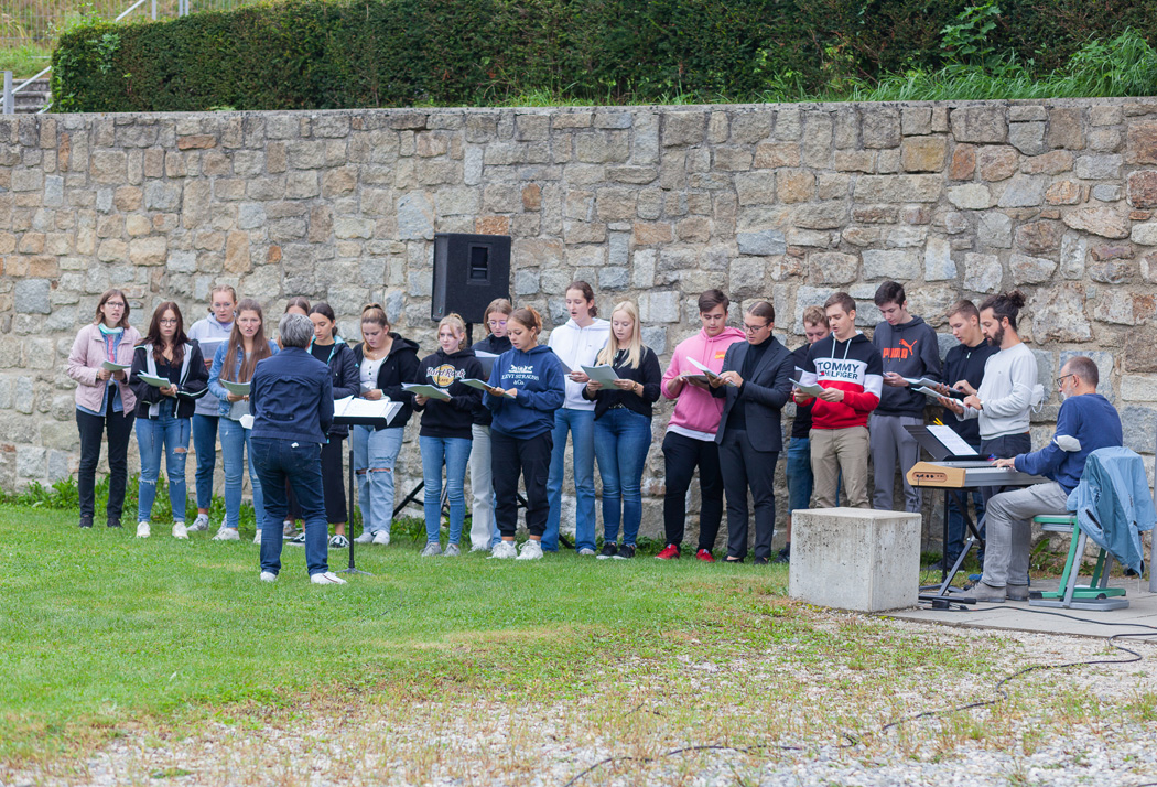 Ein Höhepunkt des Anfangsgottesdienstes war die Segnung der Kinder durch ihre TutorInnen. Dazu durften sie nach vorne kommen und sich das Kreuzzeichen – wegen Corona natürlich ohne direkten Körperkontakt – abholen. Auch die Eltern waren bei der Feier willkommen, die von Margit Weinberger und Christoph Rose musikalisch umrahmt wurde. Für die SchülerInnen der 5. bis 12. Klassen gab es als religiösen Einstieg ins neue Schuljahr am selben Tag einen extra Gottesdienst im Freien, vorbereitet von Monika Fecher und Bernhard Haberl und musikalisch umrahmt von einem kleinen Chor unter der Leitung von Claudia Seibold.