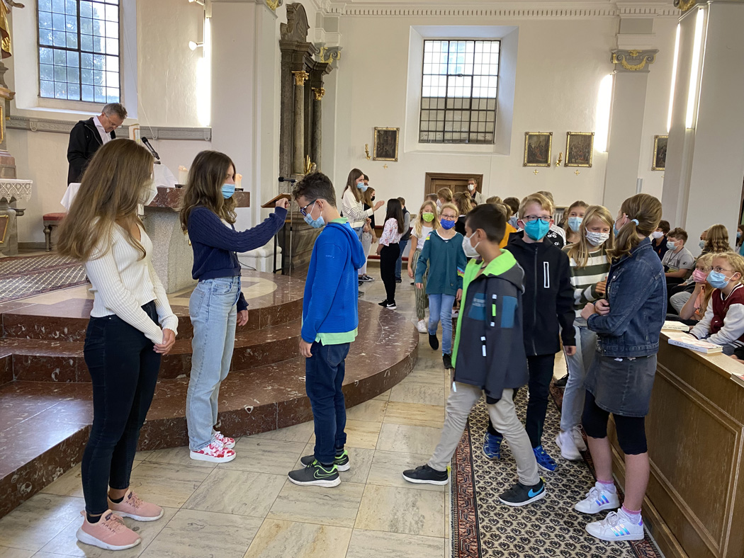 über die Ankunft von 104 neuen SchülerInnen der 5. Klassen. Ihre Aufnahme in die Schulfamilie wurde am Freitag der ersten Schulwoche durch einen sehr persönlichen Gottesdienst speziell für die FünftklässlerInnen in der Schlosskirche St. Josef gefeiert, den Stefan Kamper zusammen mit André Urbanczyk zelebrierte. Damit der Übergang von der Grundschule zum Gymnasium leichter fällt und sie sich an der neuen Schule schneller zurechtfinden, stehen den vier neuen fünften Klassen jeweils zwei Tutoren aus der 10. Klasse zur Seite.