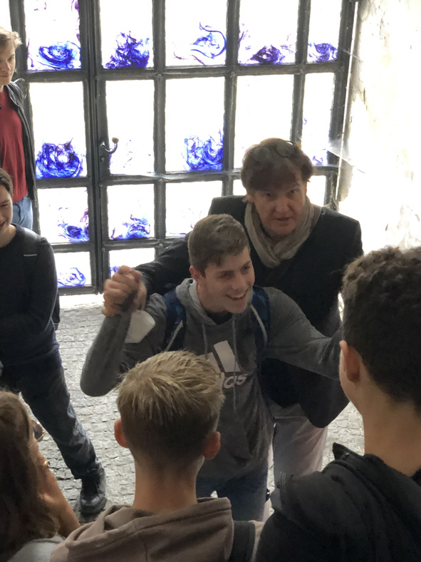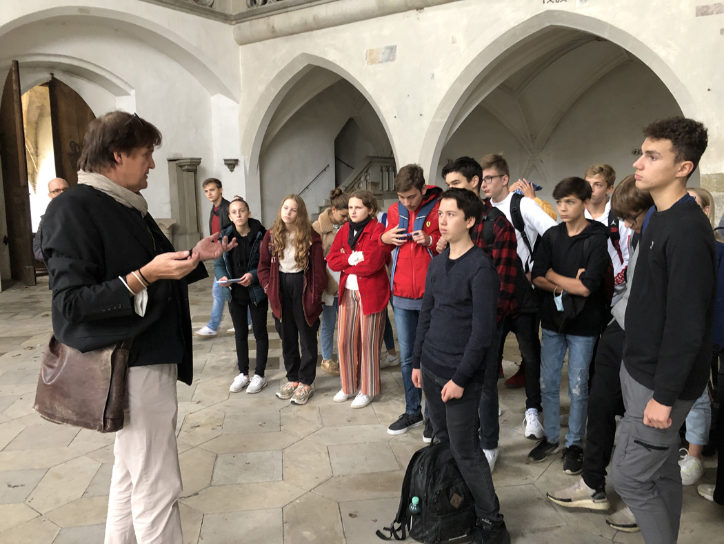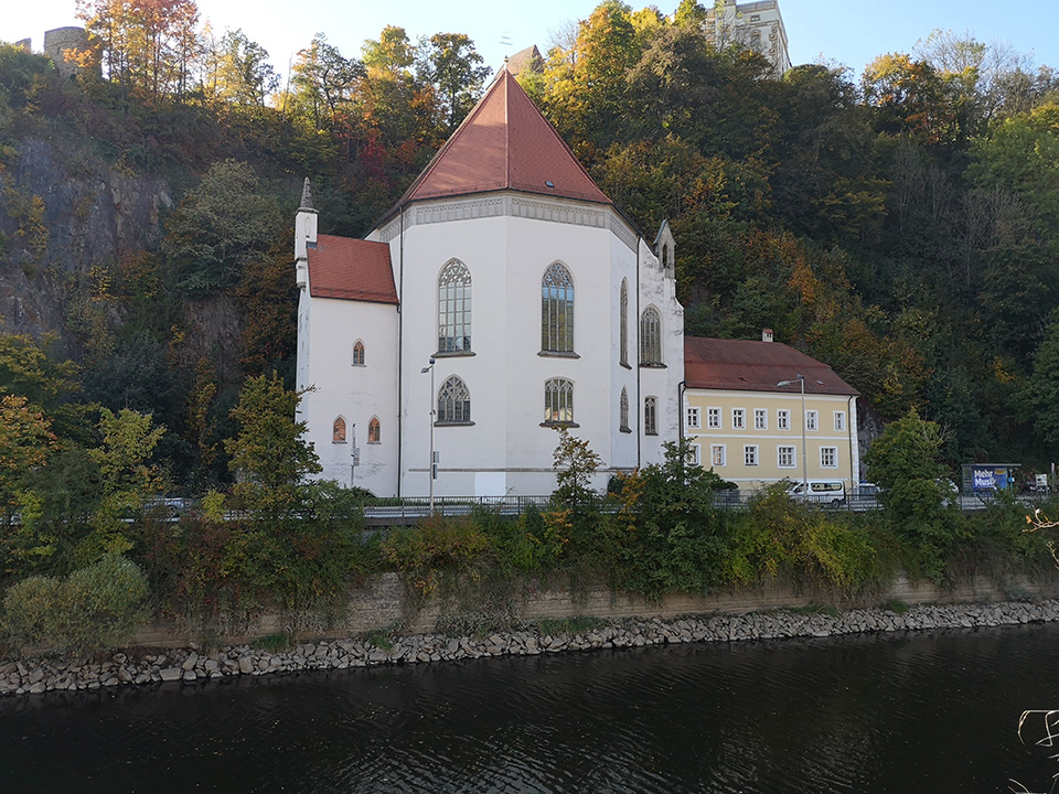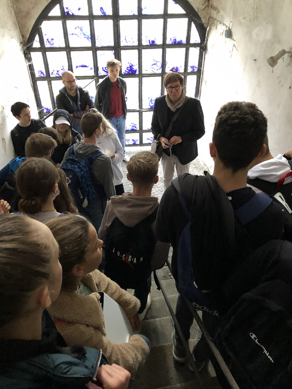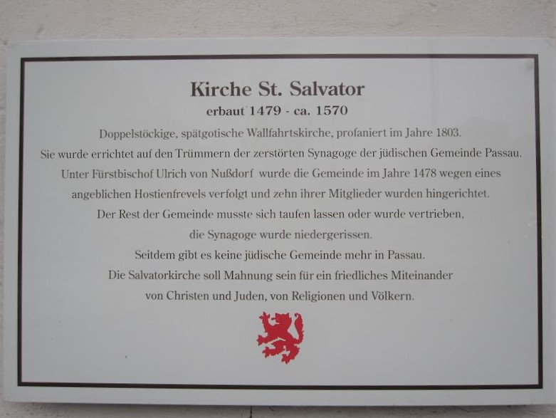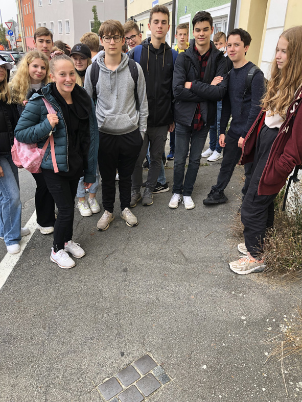 Am 5. Oktober begaben sich die 9. Klassen im Rahmen des Religionsunterrichts zu Fuß zur St.-Salvator-Kirche in der Ilzstadt. Ihr Weg führte am Anger entlang, wo man vor der ehemaligen Wohnstätte der jüdischen Familie Burian innehielt. Fünf sogenannte "Stolpersteine" erinnern an das traurige Schicksal der fünfköpfigen Familie in der Zeit des Nationalsozialismus. Stadtfuchs Matthias Koopmann zeigte den Klassen die seit 1803 profanierte und normalerweise geschlossene St.-Salvator-Kirche am Fuß des Oberhausberges, die 1479 bis 1495 an der Stelle eines Hauses mit Synagoge erbaut wurde und die Tötung und Vertreibung der Juden aus Passau im 15. Jahrhundert infolge eines angeblichen Hostienfrevels sühnen sollte. Der Bau ist bis heute eine "Mahnung für ein friedliches Miteinander von Christen und Juden, von Religionen und Völkern", wie es auf einer Gedenktafel heißt.