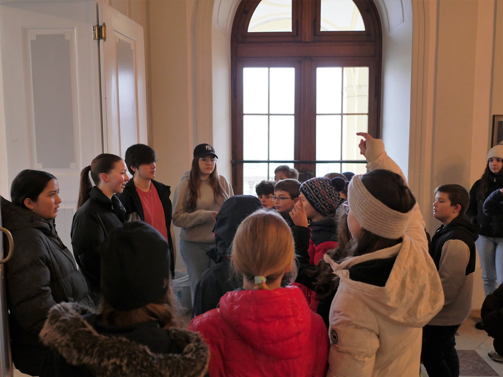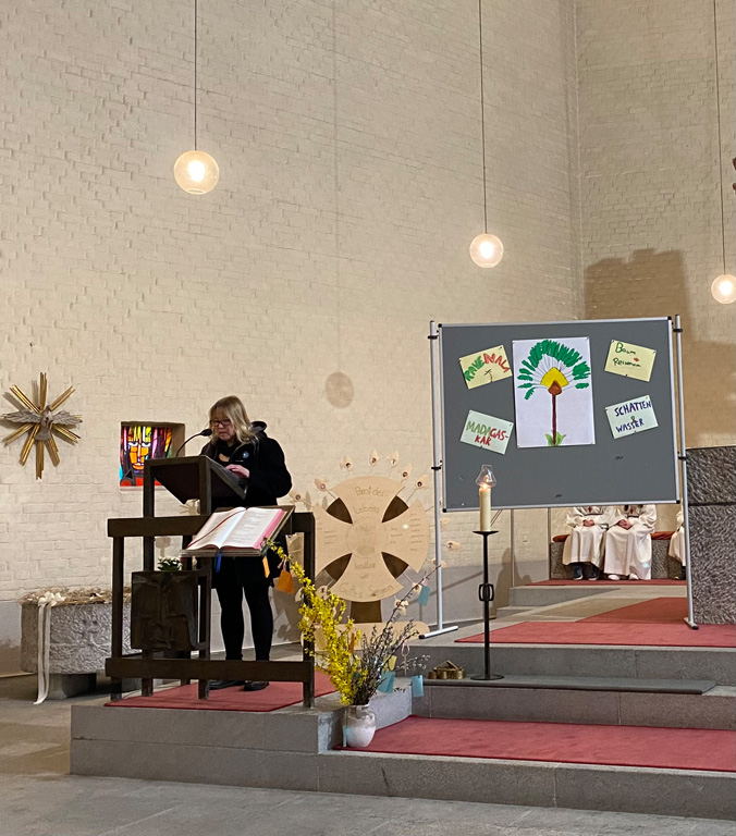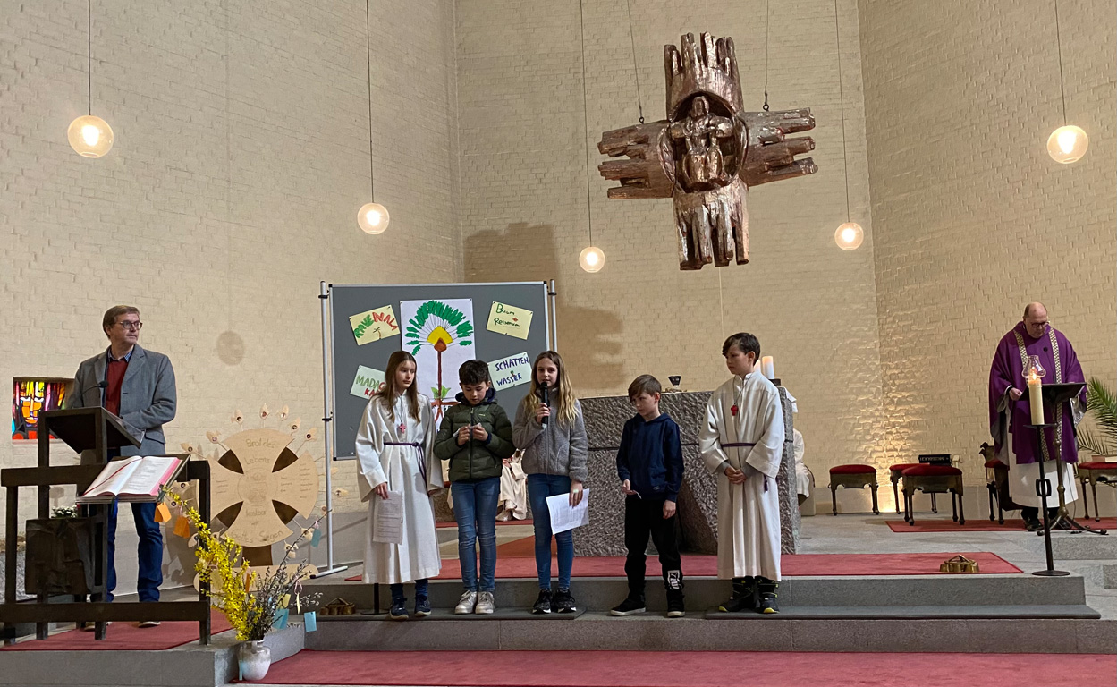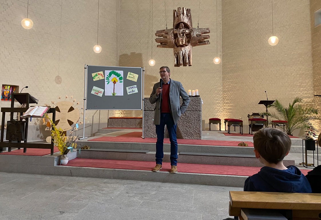 Nach der Pause machten sich alle Schüler/-innen zusammen mit ihren Lehrer/-innen auf den Weg in die Ostergottesdienste. Die evangelischen Schüler/-inner feierten in der Schlosskirche St. Josef, wo André Urbanczyk eine Osterfeier gestaltete, die Elmar Slama musikalisch umrahmte. In der Hacklberger Kirche St. Konrad besannen sich die katholischen Schüler/-innen auf Ostern bei einer Eucharistiefeier, die Pfarrer Christoph Fuchs zelebrierte. Vorbereitet hatte den Wortgottesdienst unser Schulleiter Johannes Fuchs mit der Klasse 5b. Christoph Rose begleitete mit einem Team, bestehend aus einem kleinen Chor und verschiedenen Instrumentalisten, den Gottesdienst musikalisch.