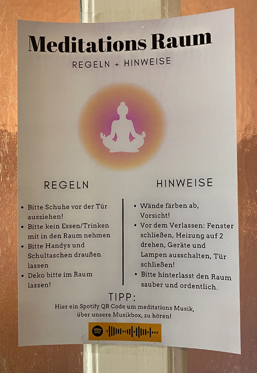 Der Raum, der sich in ganz ruhiger Lage oberhalb der Schlosskapelle befindet, bietet einen Rückzugsort für alle Mitglieder der Schulfamilie. In einer Welt, die ständig in Bewegung ist, soll er die Möglichkeit bieten, innezuhalten und Körper und Geist in Einklang zu bringen und neue Energie zu schöpfen. Die Fachschaft Religion wird in den kommenden Monaten ein Programm erarbeiten, das viele Gelegenheiten zum Kraftholen im neuen Meditationsraum bietet und hofft auf regen Zuspruch.