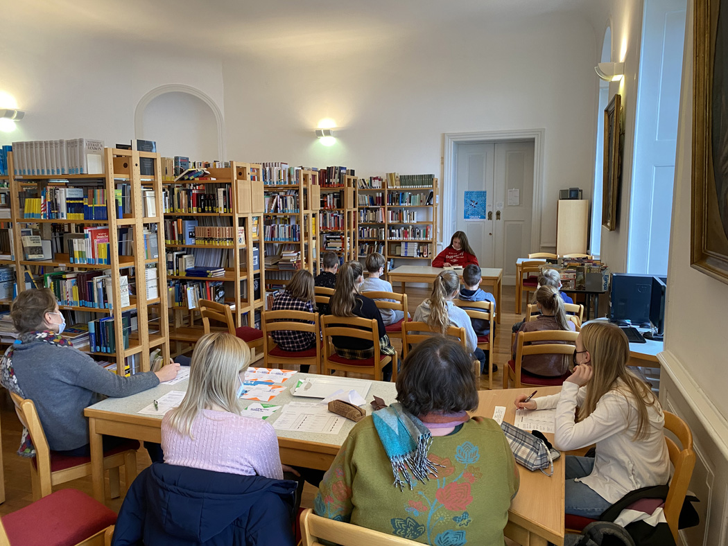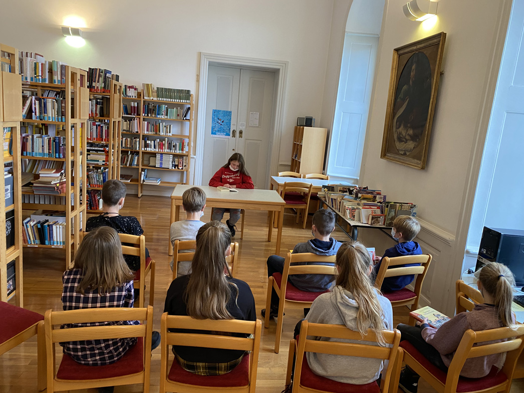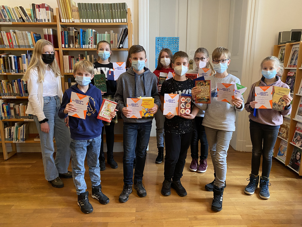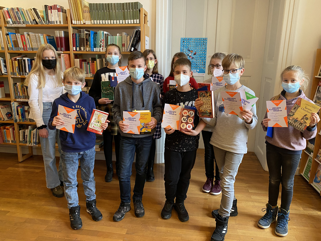Die jeweils drei bester Leser/-innen der drei sechsten Klassen, fünf Mädchen und vier Buben, traten am 13. Dezember in einem Wettlesen in der Bibliothek gegeneinander an. Leider musste man in diesem Jahr coronabedingt auf ein anfeuerndes Publikum verzichten. So lasen sie nur für die fünfköpfige Jury, bestehend aus den drei Deutschlehrerinnen der sechsten Klassen, der Deutsch-Fachbetreuerin und Organisatorin des Wettbewerbs Katharina Martin und der Siegerin des Wettbewerbs von 2019 Paulina Baumann aus der 8a.