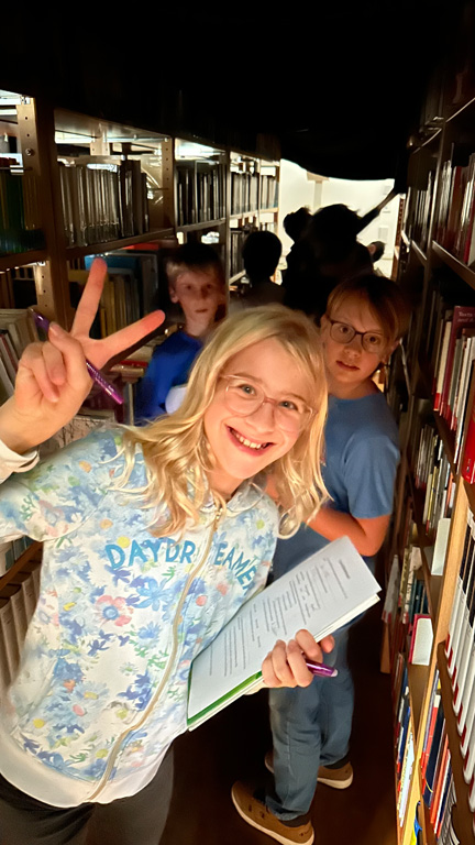 Schlussendlich wurde den Schülern die Schulbibliothek nähergebracht, die an diesem Tag in eine düstere Atmosphäre gehüllt war. Die 6.-Klässler erkundeten die Bücherregale und enthüllten ein spannendes Quiz— natürlich passend zum Gruselthema. Dies soll die Kinder dazu anregen, öfter die Bibliothek aufzusuchen, um viele spannende Bücher entdecken zu können. Später durften die Schüler-innen noch die selbst gebackenen Muffins der P-Seminar Mitglieder genießen.