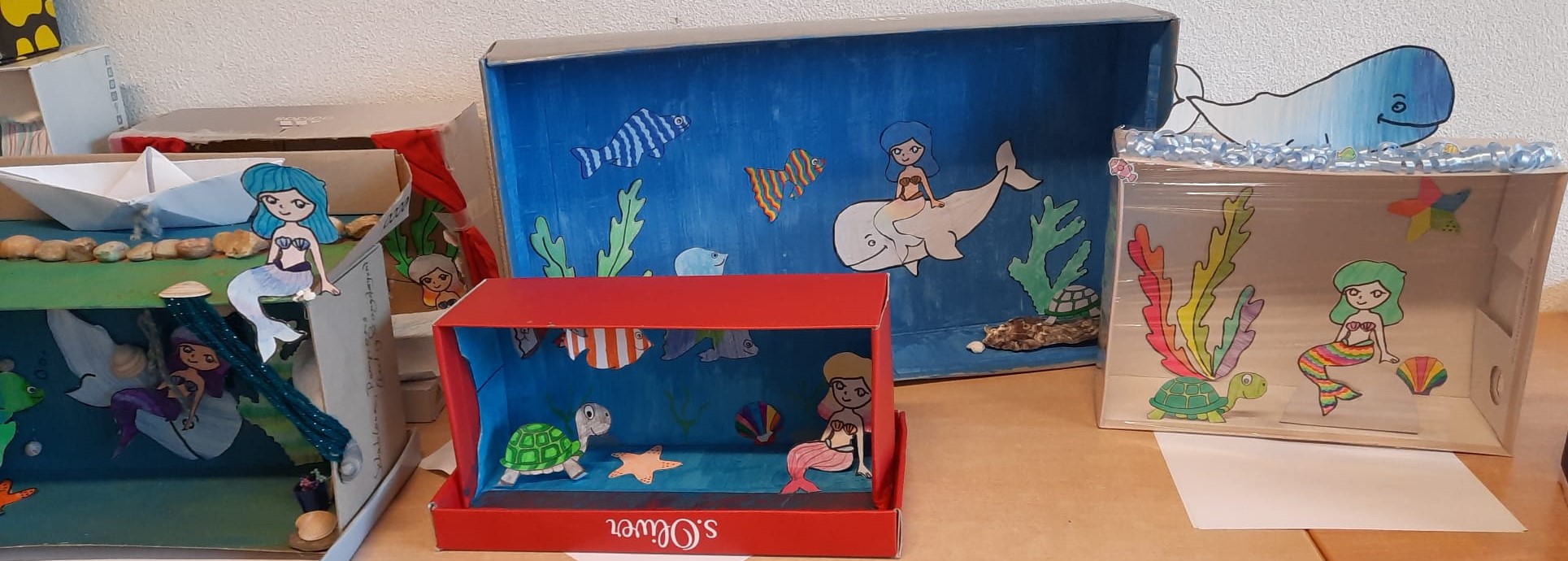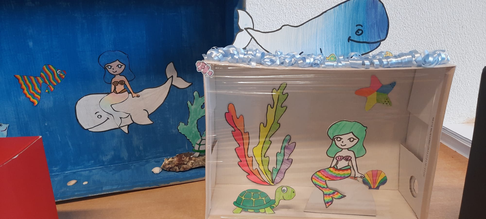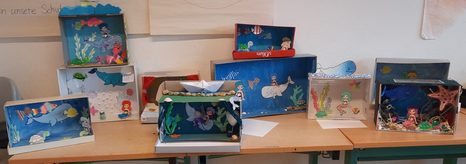 Anschließend durften wir jeder unsere eigene kleine Meerjungfrau und ihre Unterwasserwelt in einem Schuhkarton gestalten (siehe Fotos).