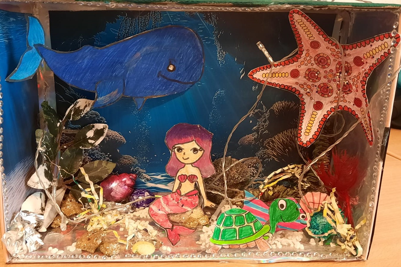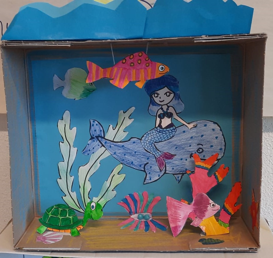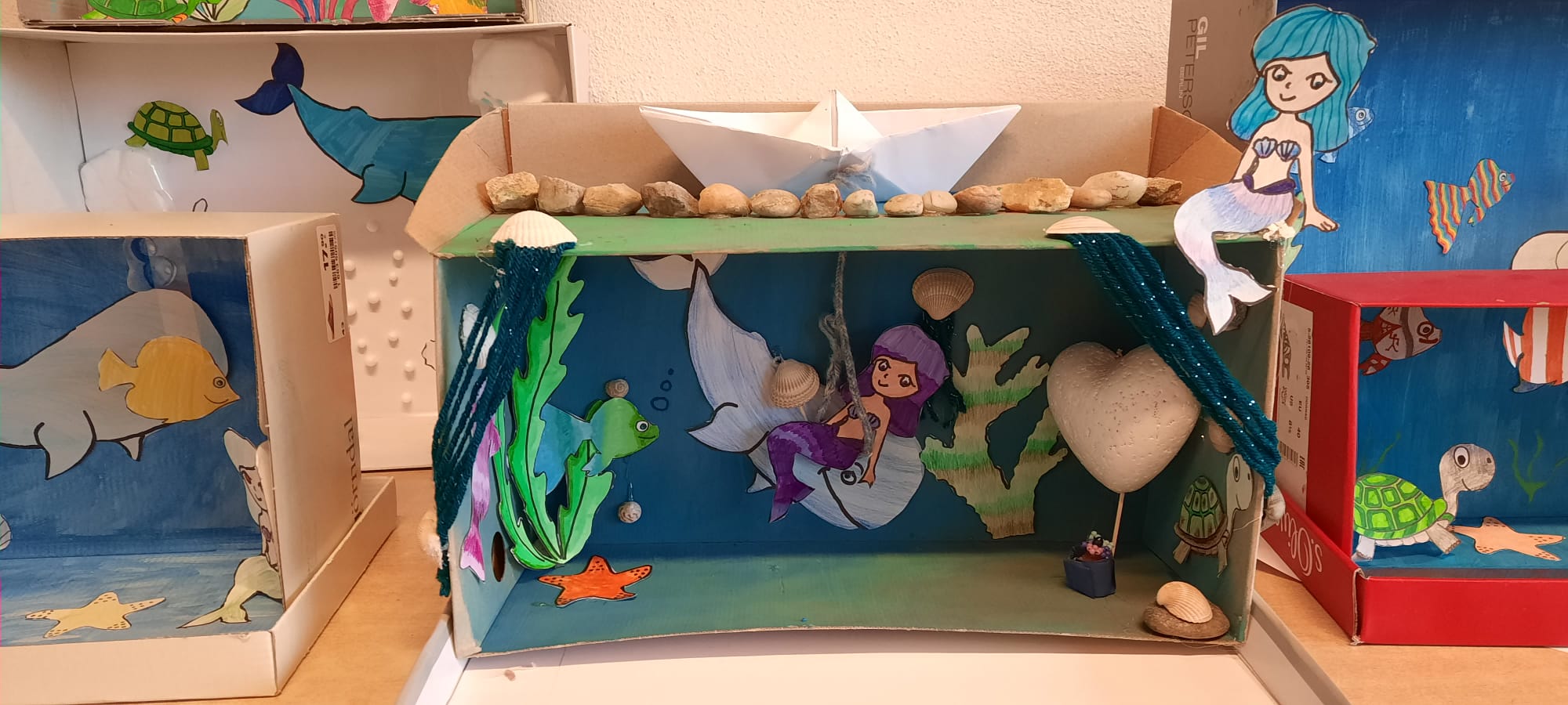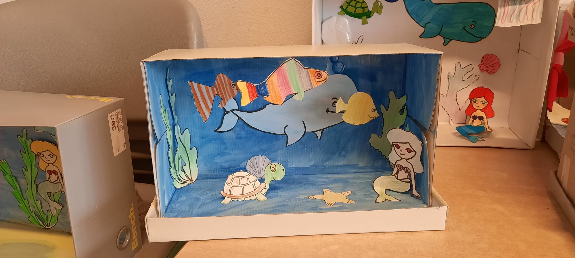 Anschließend durften wir jeder unsere eigene kleine Meerjungfrau und ihre Unterwasserwelt in einem Schuhkarton gestalten (siehe Fotos).
