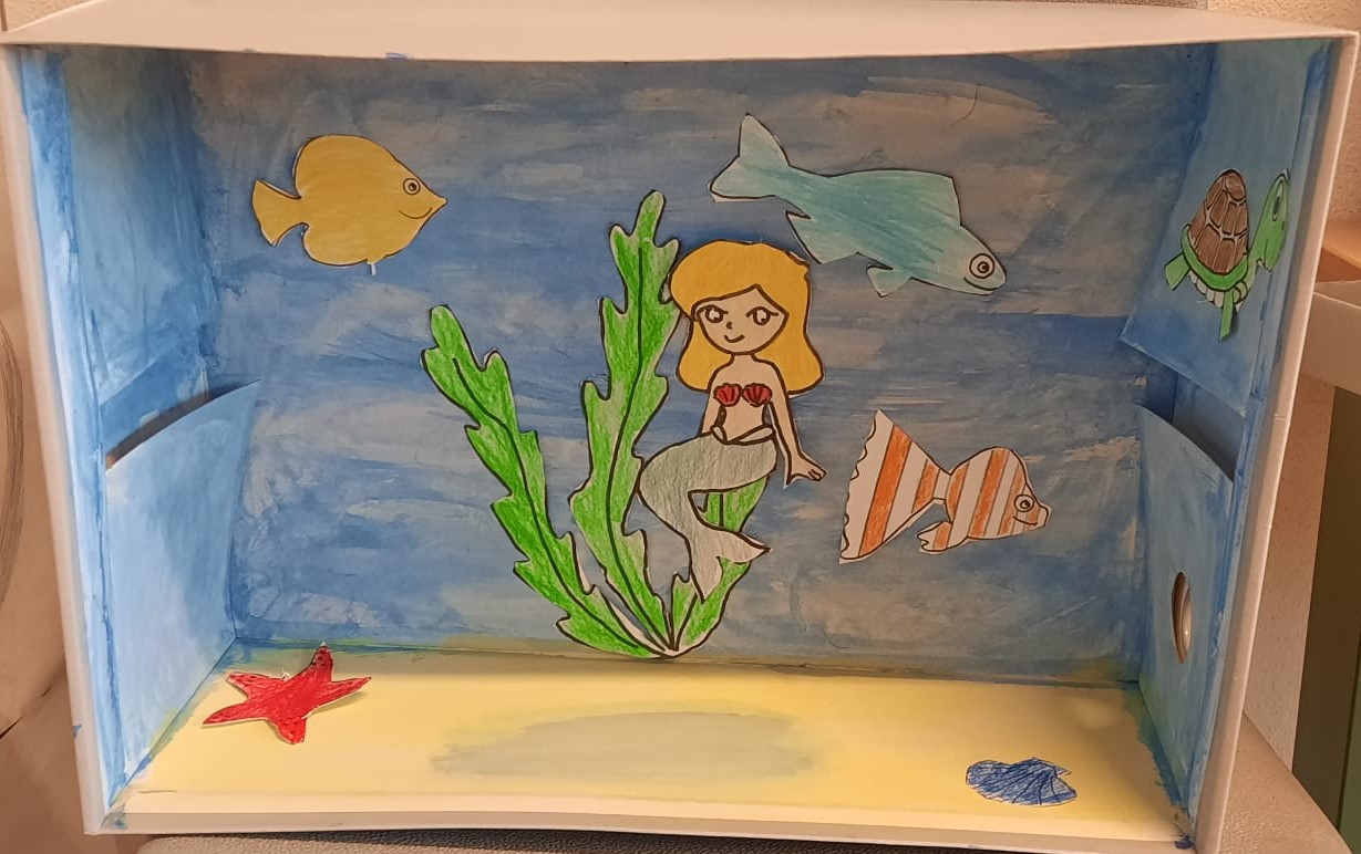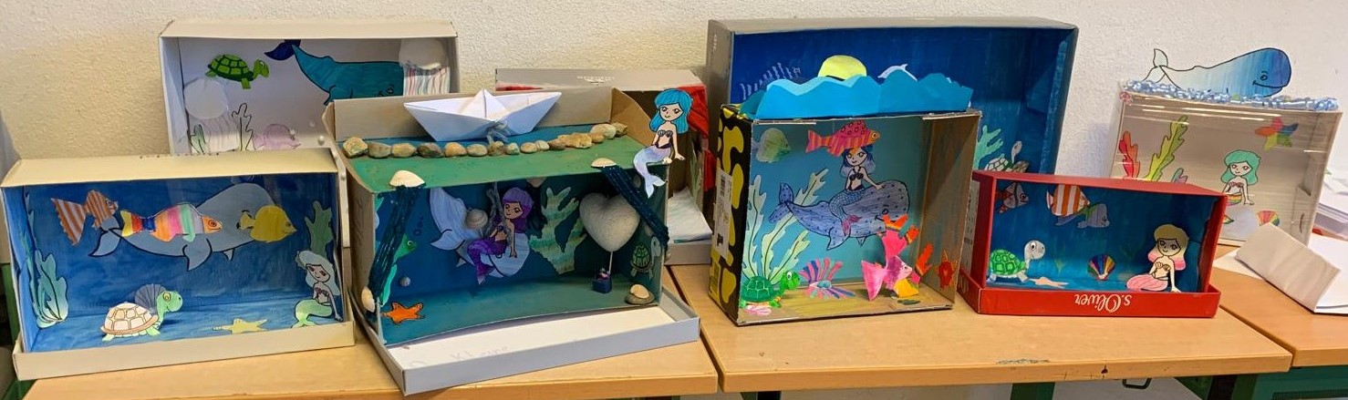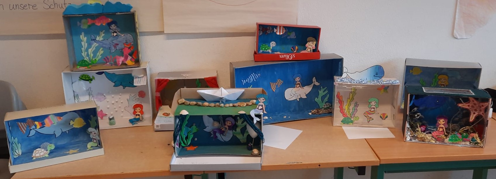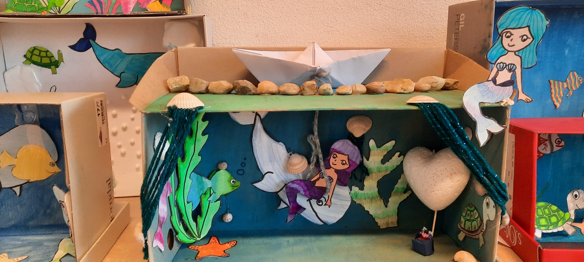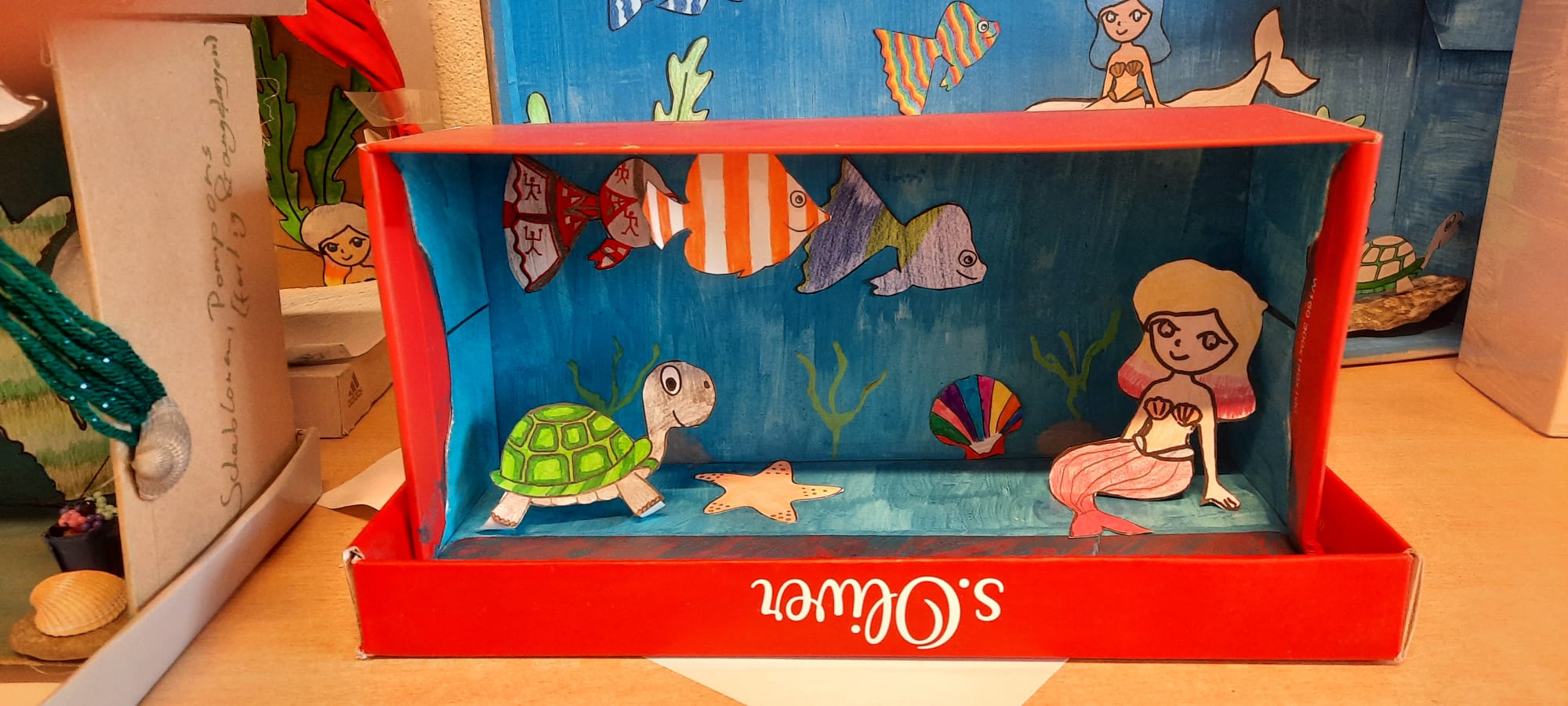 Anschließend durften wir jeder unsere eigene kleine Meerjungfrau und ihre Unterwasserwelt in einem Schuhkarton gestalten (siehe Fotos).