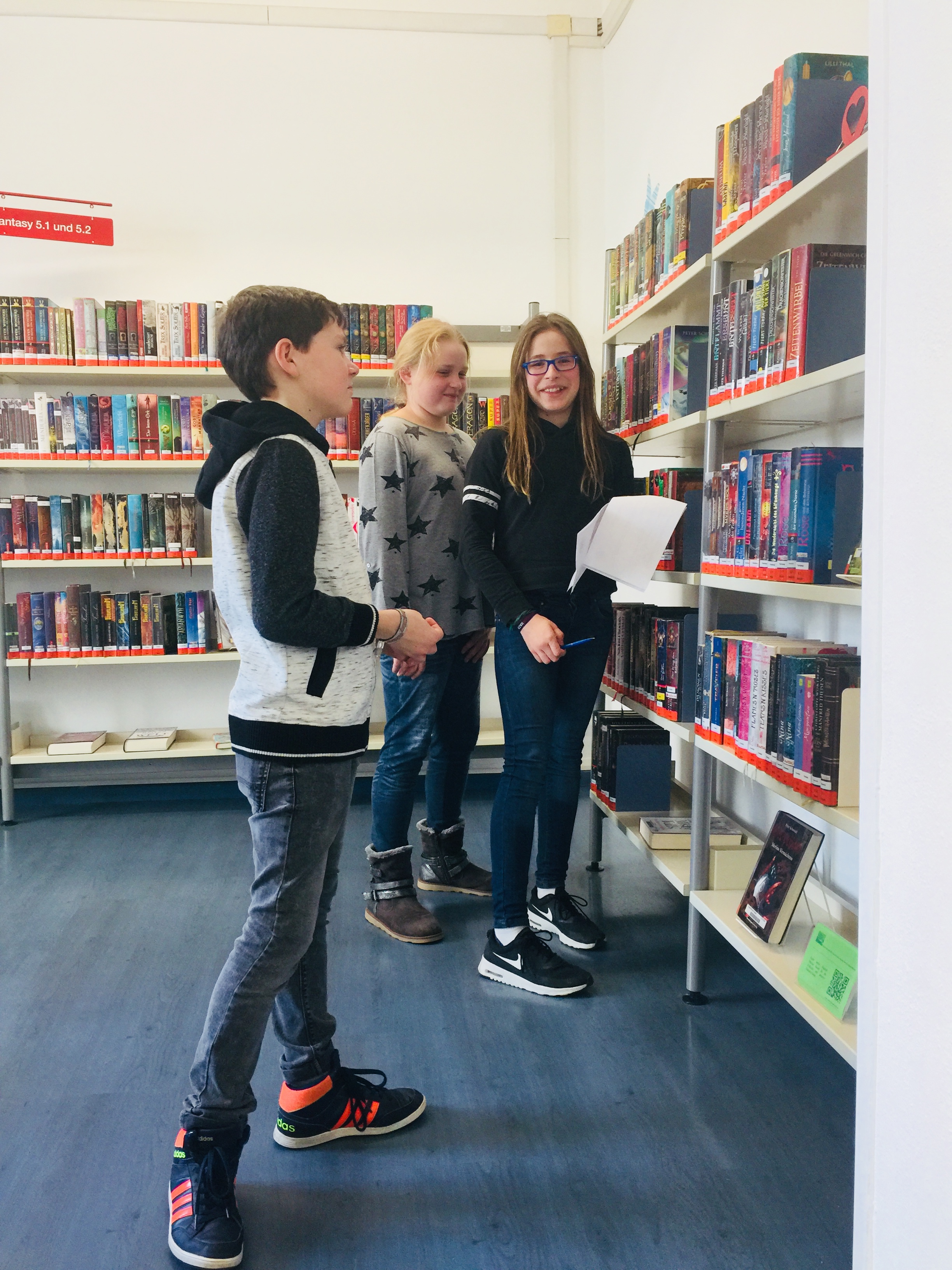 Nach zwei Stunden fanden sich alle Schülerinnen und Schüler dank der einleuchtenden Erklärungen von Herrn Kollmorgen und Lena Lotter bestens im Haus zurecht, sodass jede Gruppe die Rätsel der Hausralley lösen konnte. Kurz vor Schluss durften sich die Schüler, welche schon einen Büchereiausweis hatten, noch Lesefutter ausleihen.