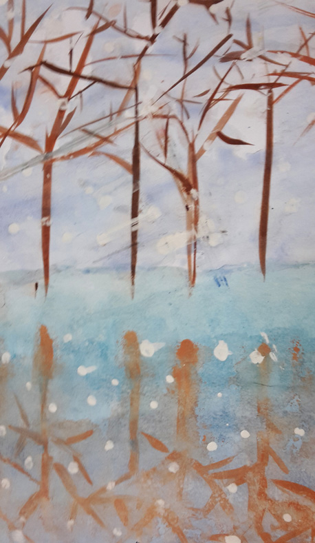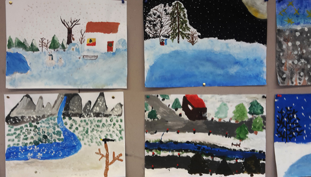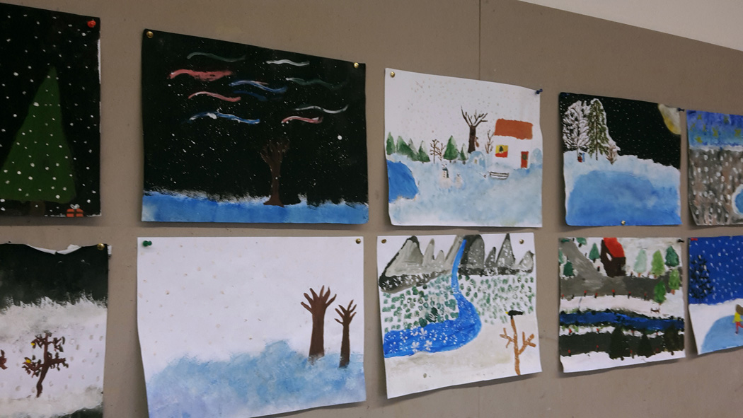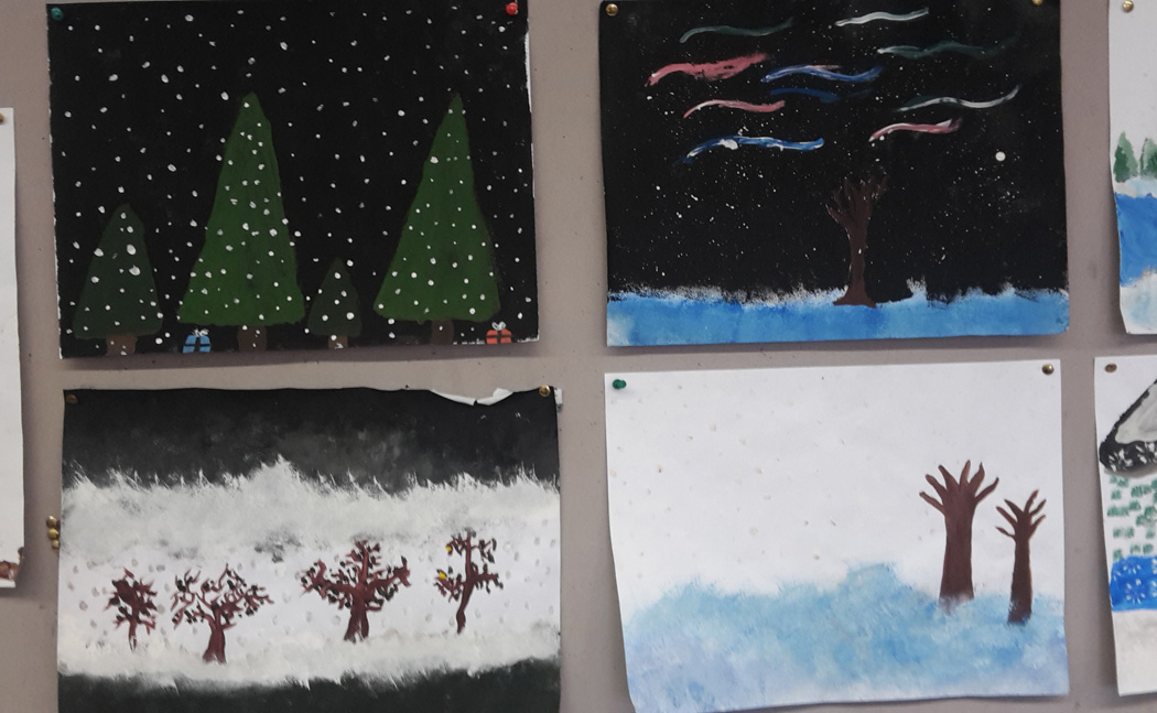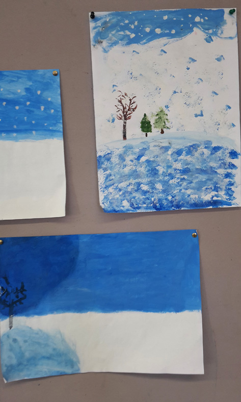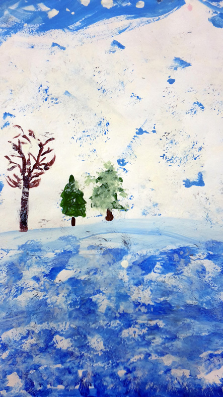 Die Schüler/-innen gestalteten ihre Bilder in Acryl und experimentierten hierbei mit Schwamm- und Tupftechnik . Obwohl es für die meisten aus dem Kurs das erste Mal war, dass sie mit dieser Art von Farben malten, mischten die Schüler mit großer Experimentierfreude und verblüffender Leichtigkeit die Farben - ausgegeben wurden nämlich nur die drei Grundfarben plus Weiß und Schwarz - und fast im Handumdrehen entstanden diese stimmungsvollen Winterlandschaften.