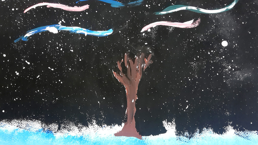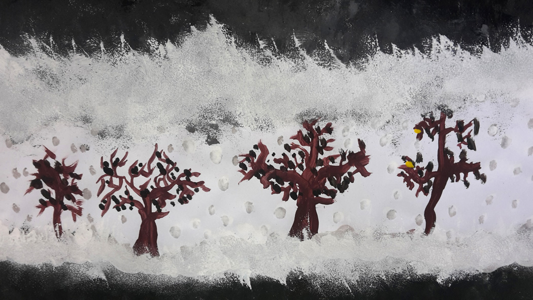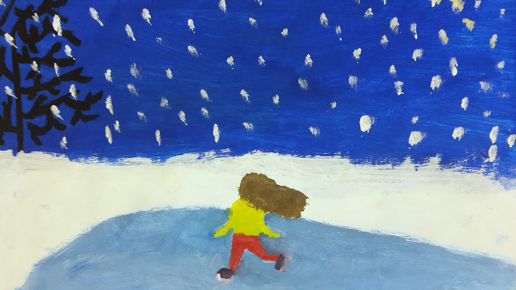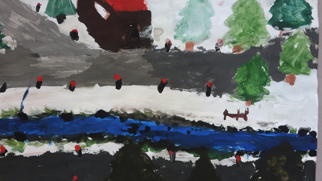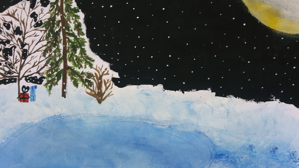 Die Schüler/-innen gestalteten ihre Bilder in Acryl und experimentierten hierbei mit Schwamm- und Tupftechnik . Obwohl es für die meisten aus dem Kurs das erste Mal war, dass sie mit dieser Art von Farben malten, mischten die Schüler mit großer Experimentierfreude und verblüffender Leichtigkeit die Farben - ausgegeben wurden nämlich nur die drei Grundfarben plus Weiß und Schwarz - und fast im Handumdrehen entstanden diese stimmungsvollen Winterlandschaften.