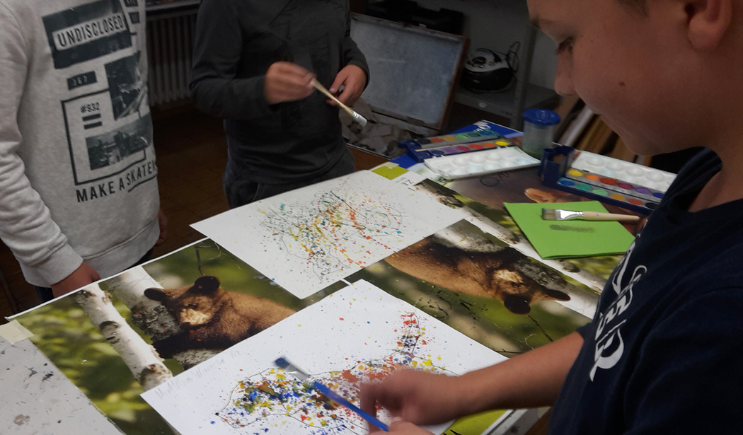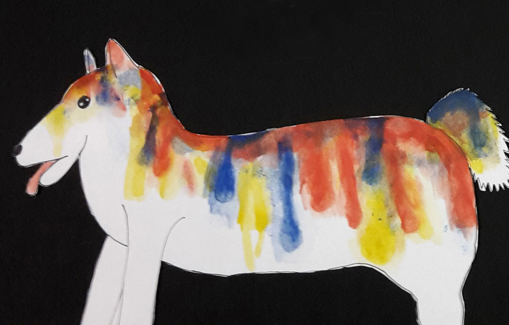 Drei Farbeimer in Rot, Gelb und Blau auf einer Leiter vor einer Passauer Metzgerei, eine Passantin mit einem großen weißen Hund, und ein kleiner Junge, der mit Leberkassemmel aus der Tür kommt ... Können Sie sich denken, wie es weitergeht ...? Die Schüler/-innen der 7a hatten da so einige Ideen, wie der große weiße Hund am Ende der Geschichte aussehen könnte, und setzten diese mit viel Fantasie und Farbe um. Nebenbei bot das Thema einen wunderbaren Einstieg für das Thema Farbe, da die subtraktive Farbmischung der Grundfarben hier ganz praktisch erlebt werden konnte.