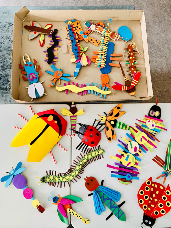 Wenn es draußen kälter wird, dann krabbeln sie bevorzugt in unsere Wohnungen. Wenn man aber Glück hat, bleiben ein paar von ihnen draußen im Freien und fliegen noch eine Runde, sofern sie Flügel haben. Mit allem, was kriecht und fliegt, haben wir uns in Kunst die ersten Wochen beschäftigt. Aus Karton und Tonpapier sind so Käfer, Libellen, Schaben und Tausendfüßler entstanden. Auch wenn wir sie in unseren vier Wänden nicht so gerne haben, so werden sie nachgebildet und in Farbe fast zum Schmuckstück. Und dann ist es auch gar nicht „ekelig“, sie mal im Haar oder auf der Schulter rasten zu lassen… doch jetzt lassen wir sie wieder frei… Ursel Kraft