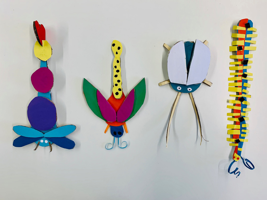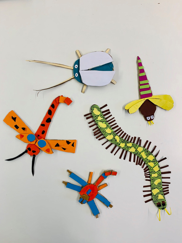 Wenn es draußen kälter wird, dann krabbeln sie bevorzugt in unsere Wohnungen. Wenn man aber Glück hat, bleiben ein paar von ihnen draußen im Freien und fliegen noch eine Runde, sofern sie Flügel haben. Mit allem, was kriecht und fliegt, haben wir uns in Kunst die ersten Wochen beschäftigt. Aus Karton und Tonpapier sind so Käfer, Libellen, Schaben und Tausendfüßler entstanden. Auch wenn wir sie in unseren vier Wänden nicht so gerne haben, so werden sie nachgebildet und in Farbe fast zum Schmuckstück. Und dann ist es auch gar nicht „ekelig“, sie mal im Haar oder auf der Schulter rasten zu lassen… doch jetzt lassen wir sie wieder frei… Ursel Kraft