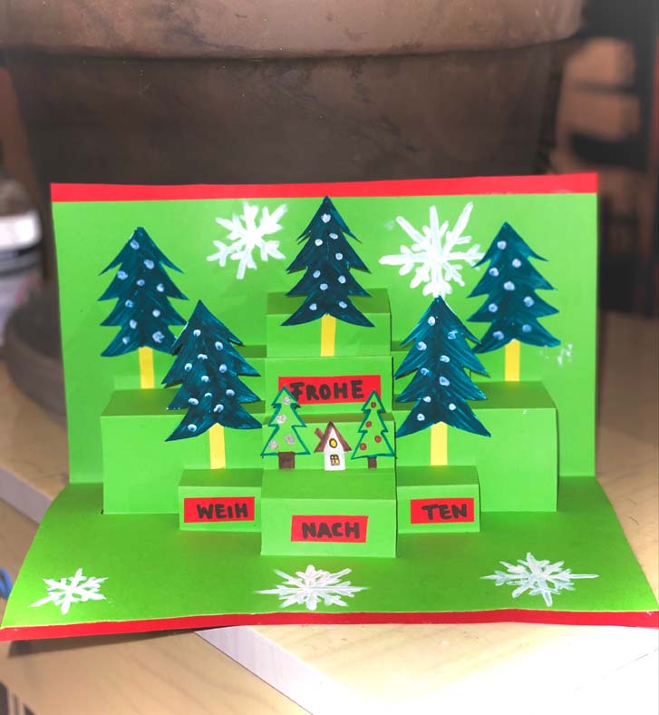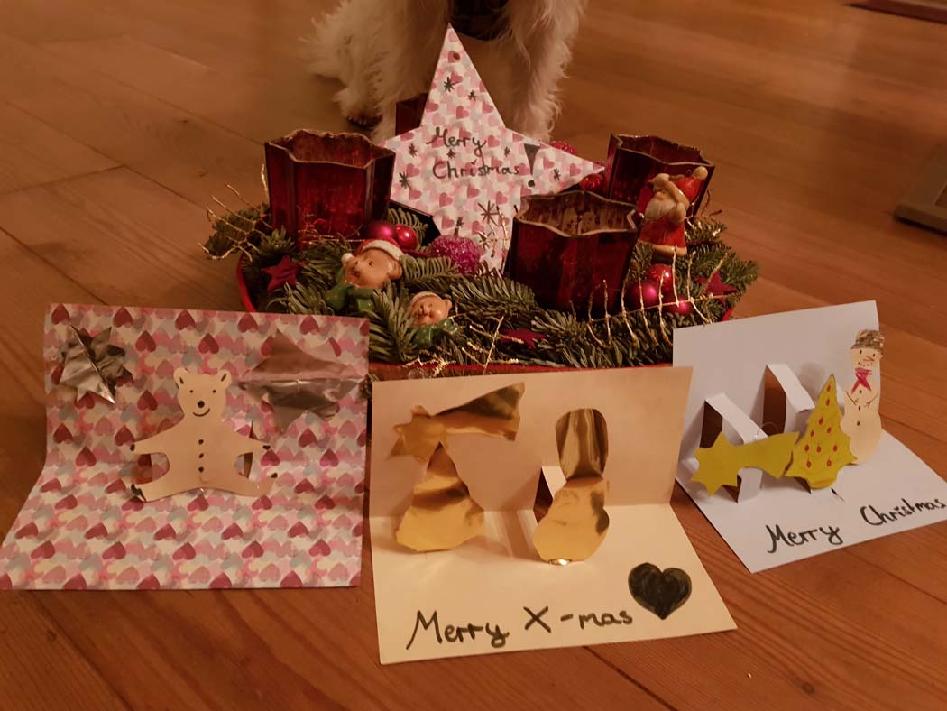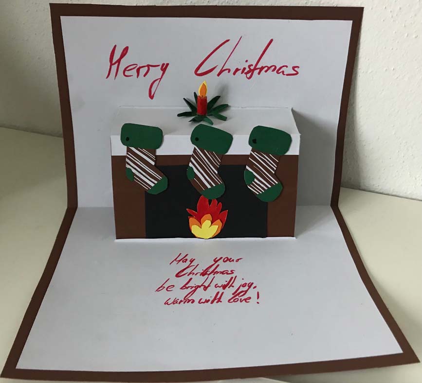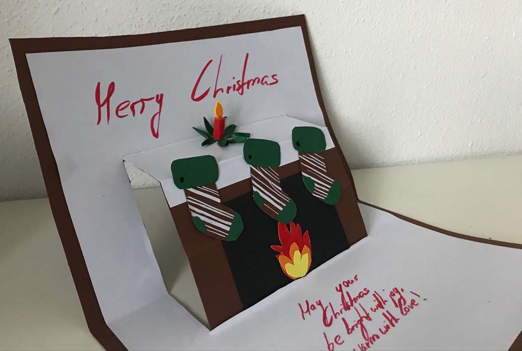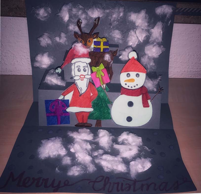 gestalteten unsere Schüler/-innen aus dem Distanzunterricht: Beim Auffalten der Weihnachtskarten öffnet sich jeweils etwas Dreidimensionales - ein Geschenk, ein gemütlicher Kamin, oder sogar ein ganzes Weihnachtsdorf.