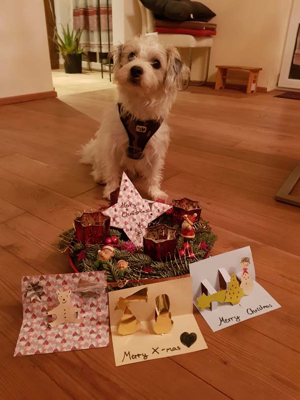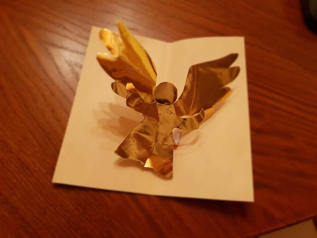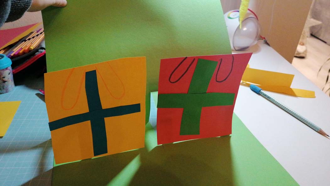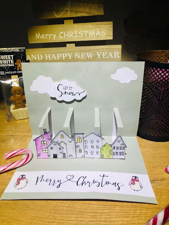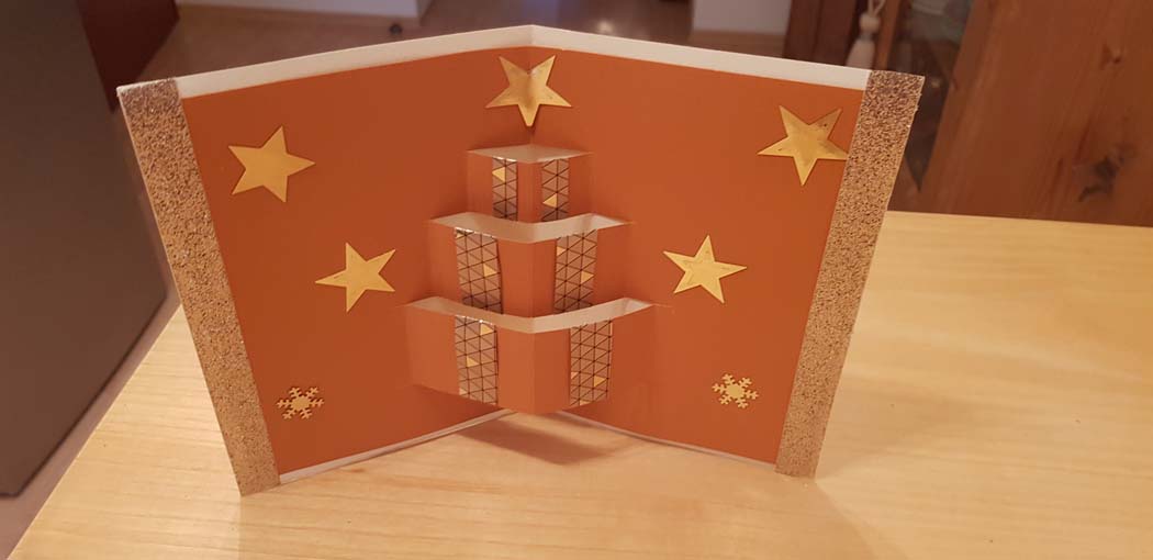 gestalteten unsere Schüler/-innen aus dem Distanzunterricht: Beim Auffalten der Weihnachtskarten öffnet sich jeweils etwas Dreidimensionales - ein Geschenk, ein gemütlicher Kamin, oder sogar ein ganzes Weihnachtsdorf.