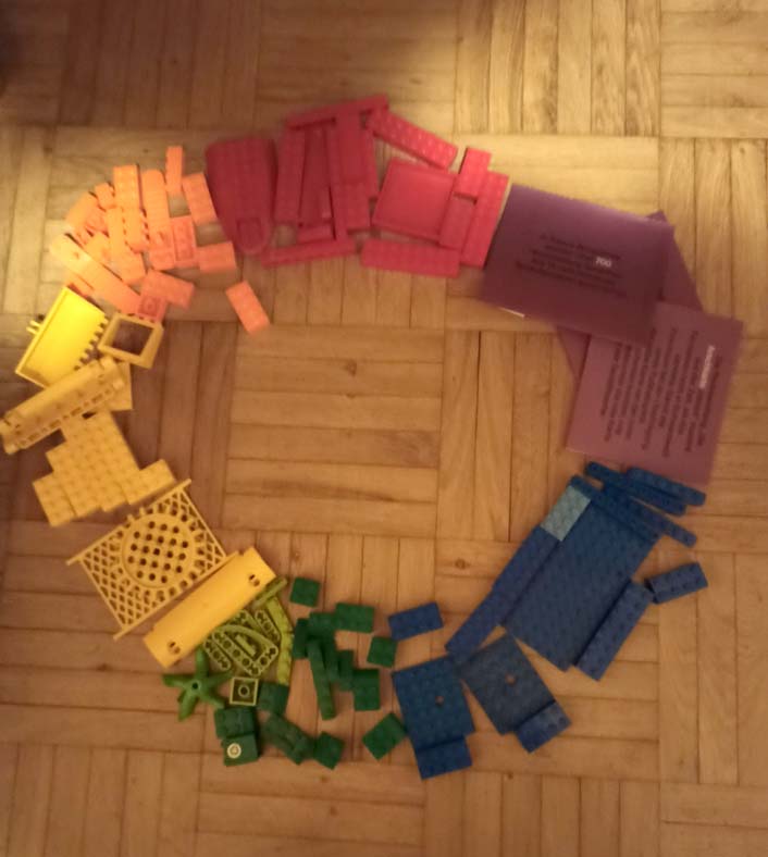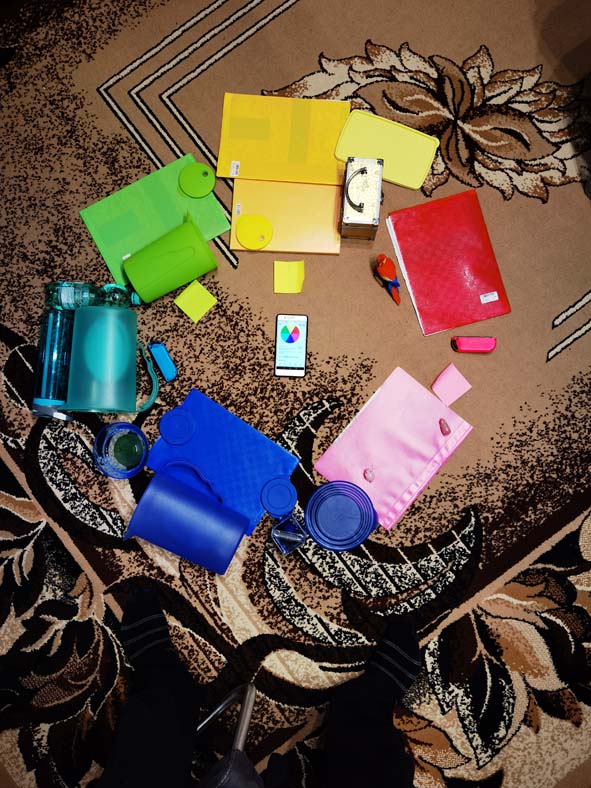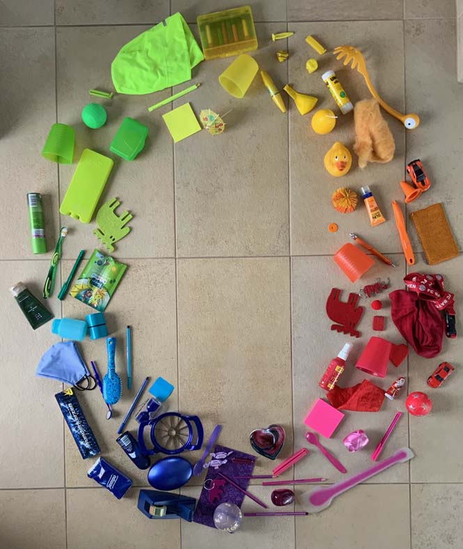 ging's im Distanzunterricht der Gruppe 7abc. Die Schüler zeigten viel Einfallsreichtum, um Ittens Farbkreis auf ihre ganz eigene Art und Weise umzusetzen, ob durch Plündern des Kühlschrankes oder Durchforsten des Spielzeugvorrats. Und Vierbeiner "Paula" setzte nebenbei noch ihr eigenes Statement zu den "unbunten" bzw. "Nicht-Farben" Schwarz und Weiß.