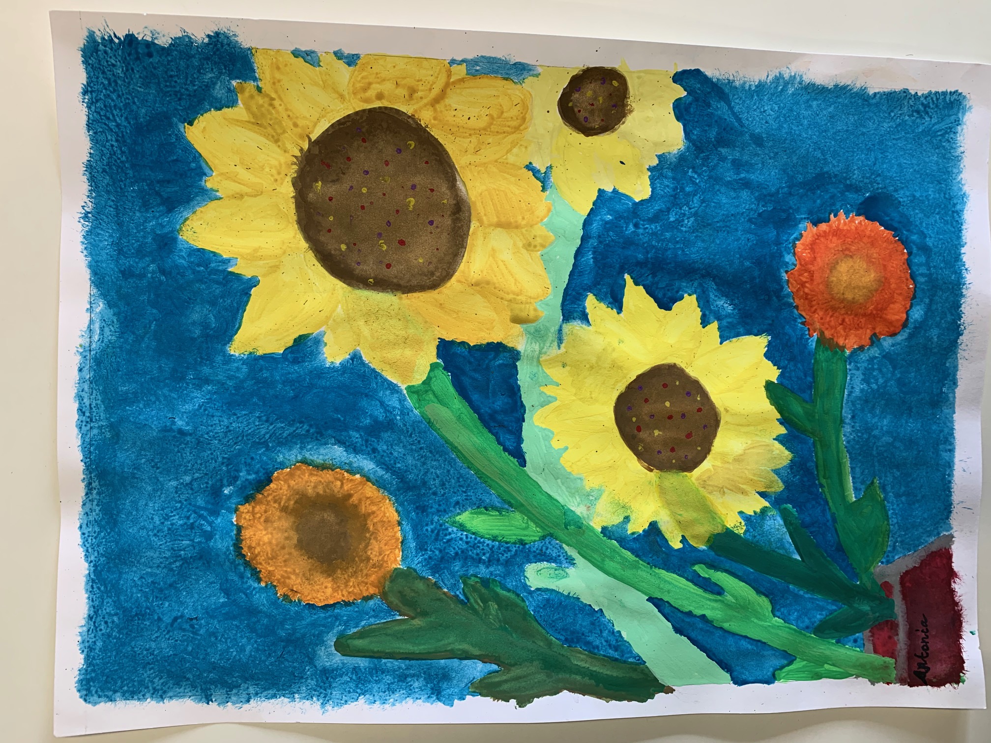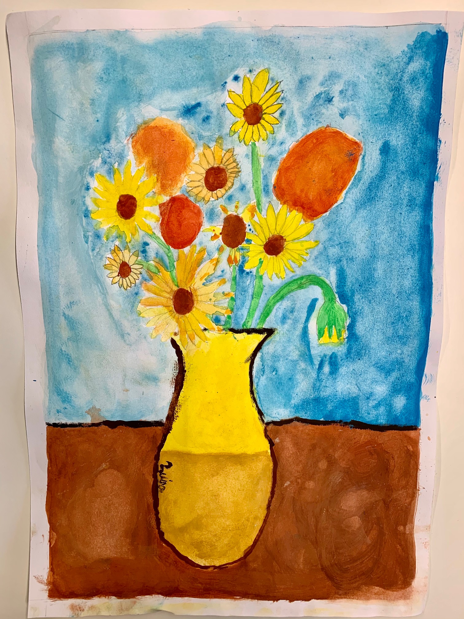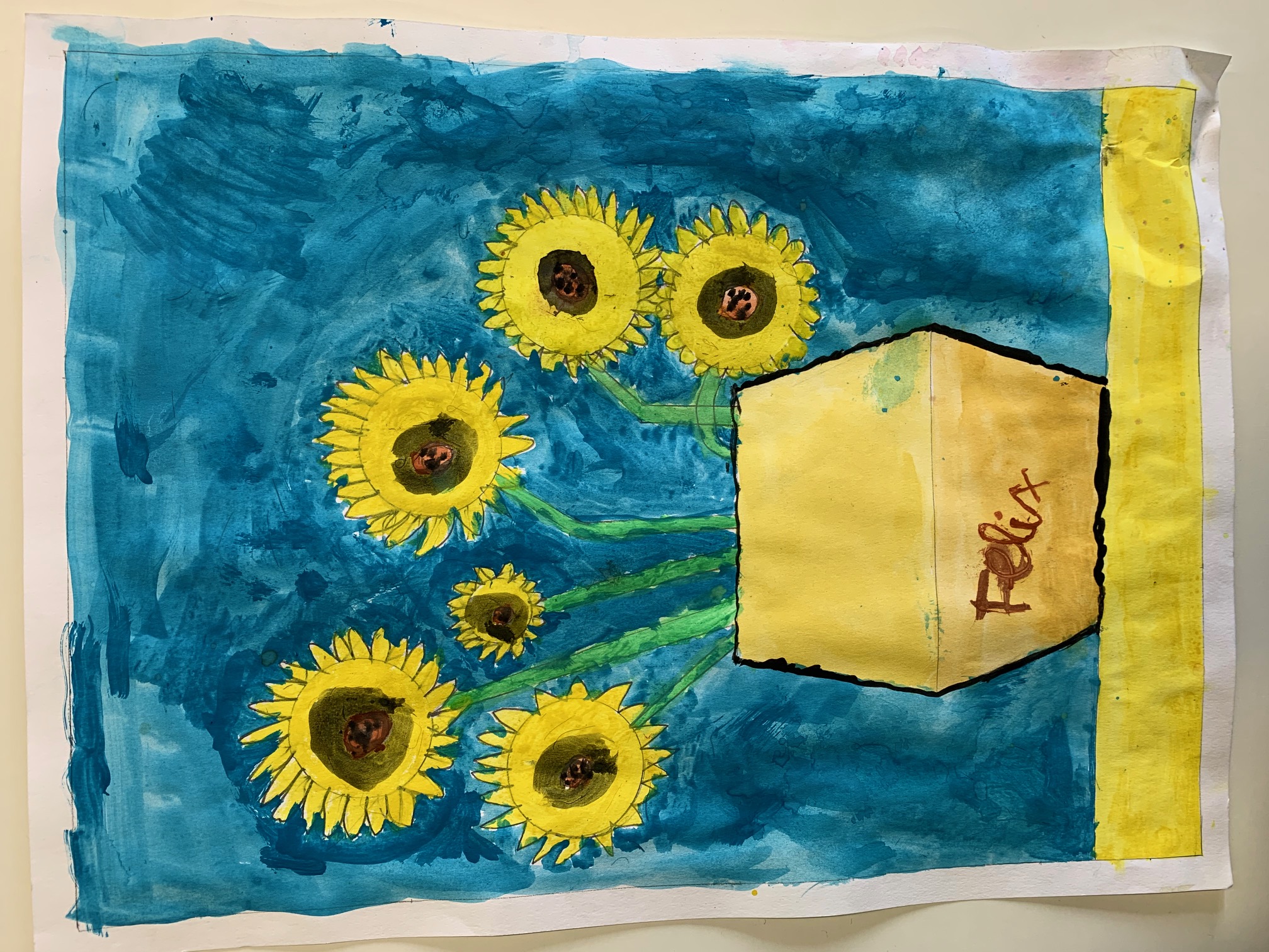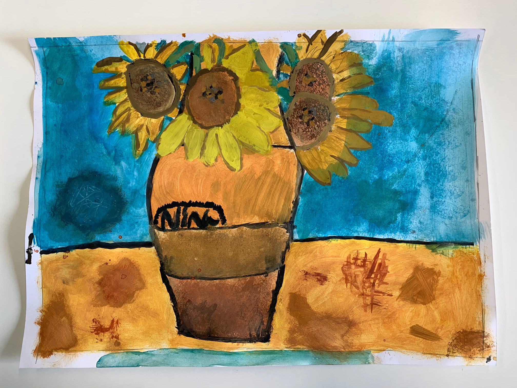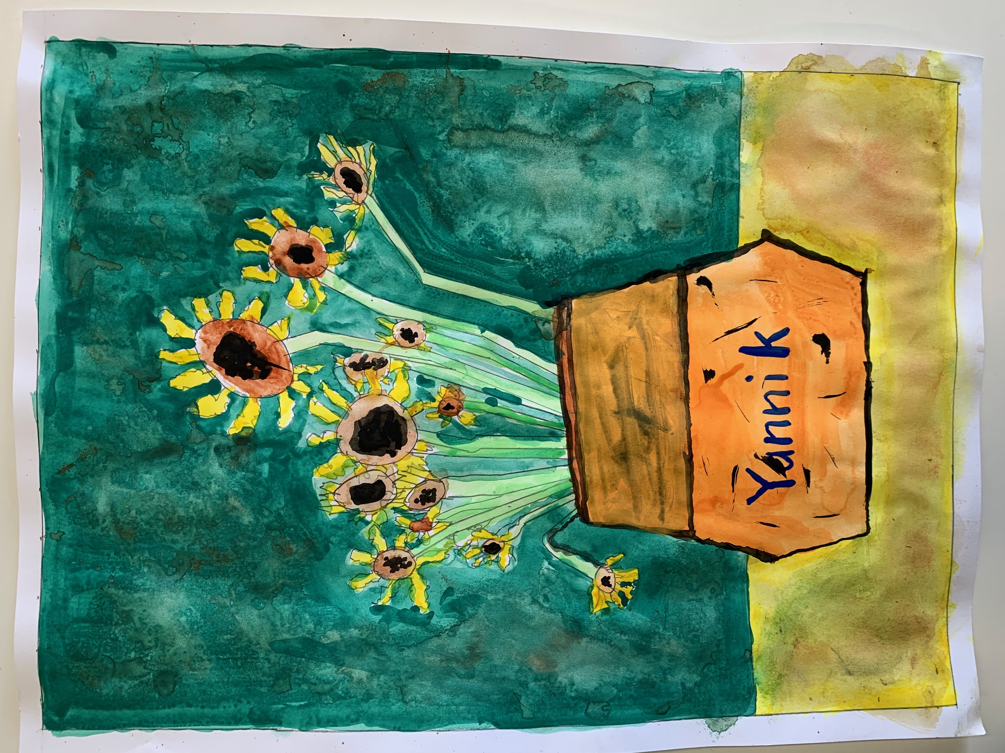 Sonniges Gelb, sattes Braun und frisches Türkis! So stellen wir uns doch den Sommer vor, oder? Gerade diese Phantasie hat die Kunstklassen 6ac und 6bd ein bisschen durch die tristen Herbst- und Winterwochen (vor dem Lockdown) retten können. Auf diese Weise sind nämlich sowohl die nachgemalten Sonnenblumen van Goghs als auch wir zu glühendem Leben erweckt worden, als wir noch zusammen im Kunstsaal die Pinsel schwingen konnten. Nicht nur für van Gogh selbst, auch für uns, versinnbildlicht das Gelb der Sonnenblumen das pralle Leben und da wir dieses momentan nur eingeschränkt genießen können, ist es Zeit - zumindest in Bildern - ein bisschen Lebensfreude zu schenken. Darum kommt jetzt jenseits von AHA eine kleine Sommerparty mit Sonnenblumen aus schwungvollen Schülerhänden ohne jegliche Ansteckungsgefahr... einzig zu erwartende Nebenwirkung ist eventuell großes Malfieber...