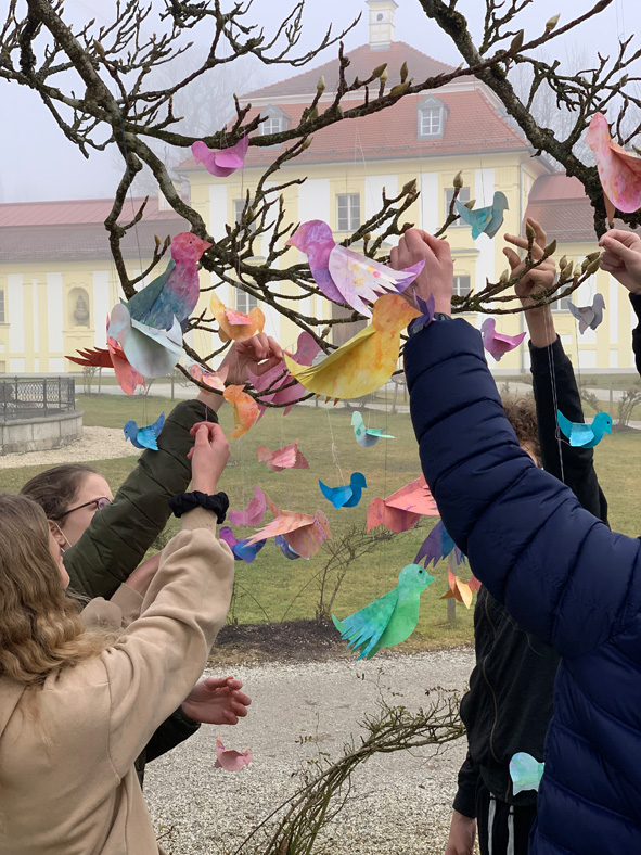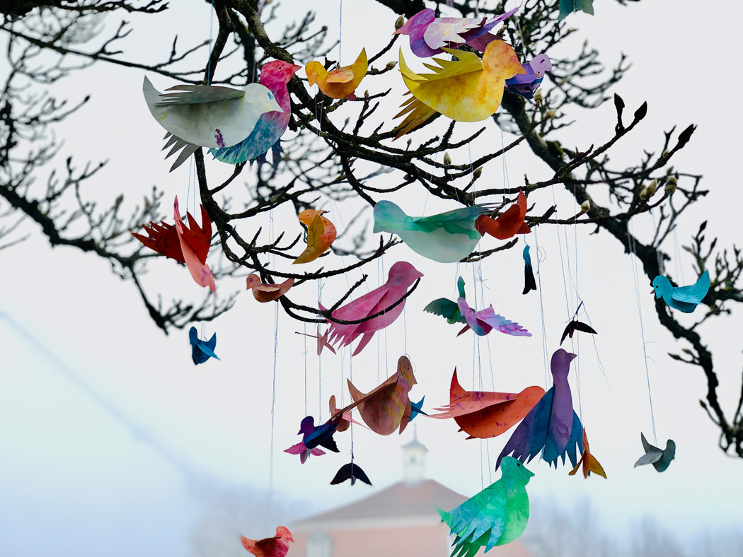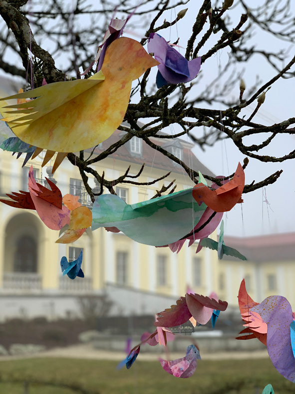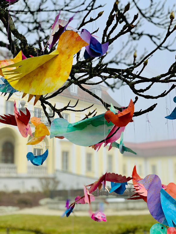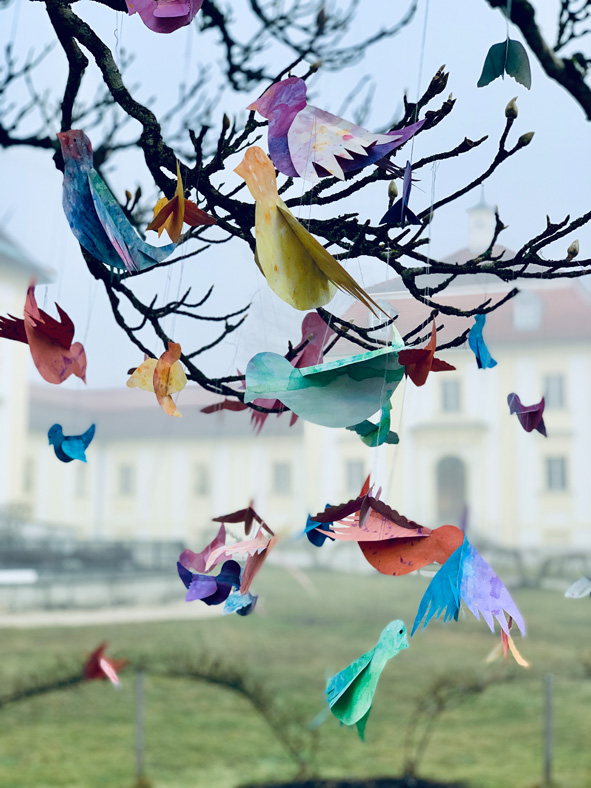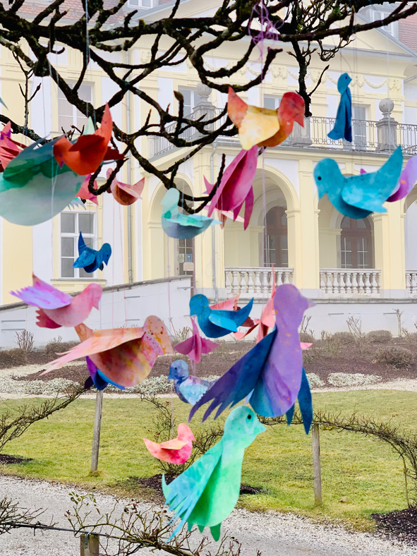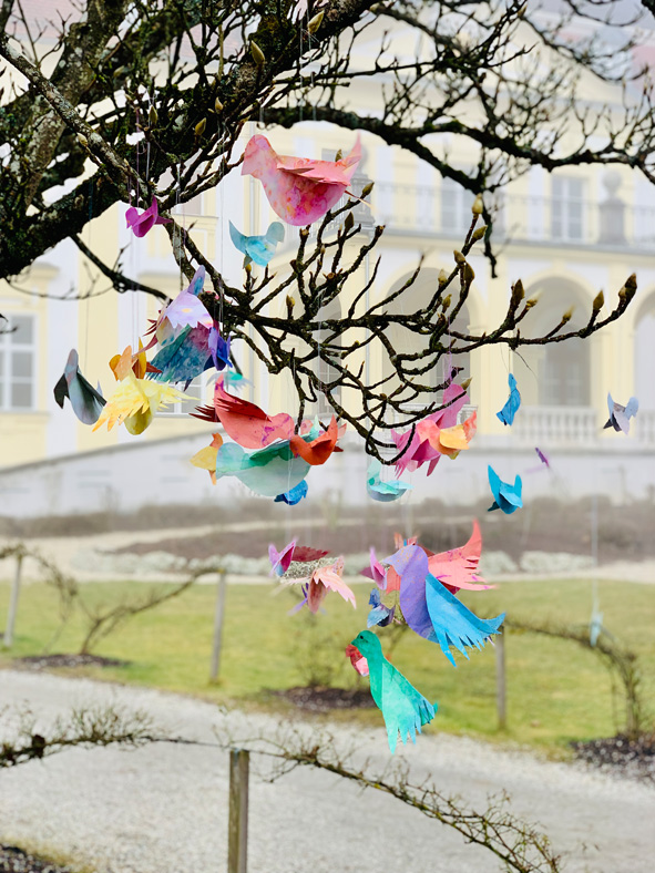 Der Winter war lang und grau. Wir brauchen wieder Farbe. Wir haben uns eine Schar bunter Zugvögel gebastelt. Papier marmoriert. Schablonen entworfen. Zwei Größen geschnitten. Alles zusammengeklebt. Mit Aufhängern versehen. Die Magnolie geschmückt. So ein Gezwitscher! Das hört sich nach Frühling an. Und so sieht es auch aus.