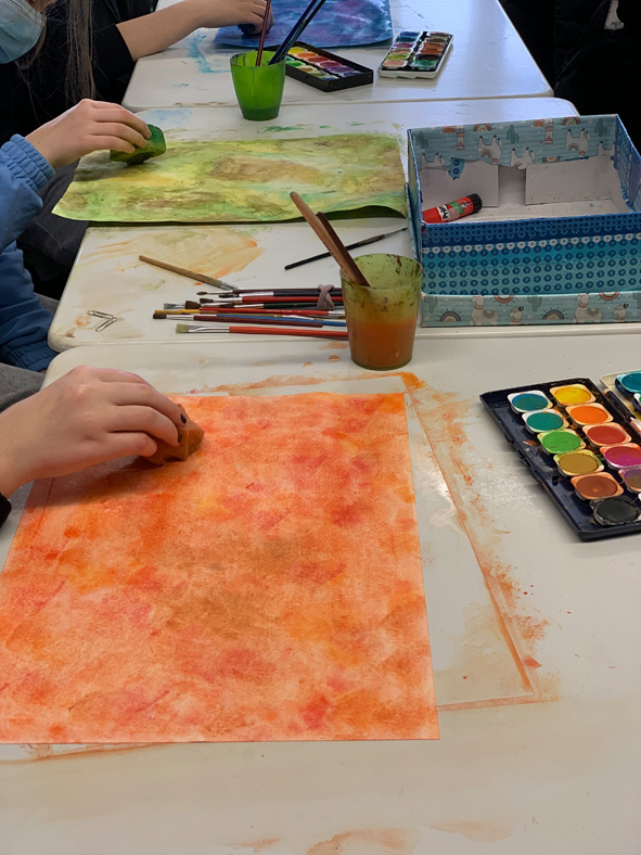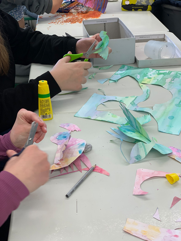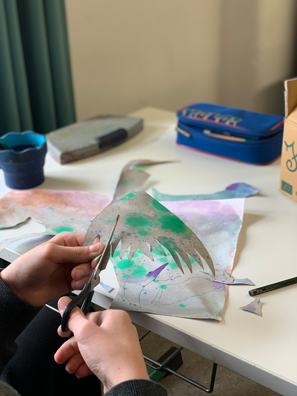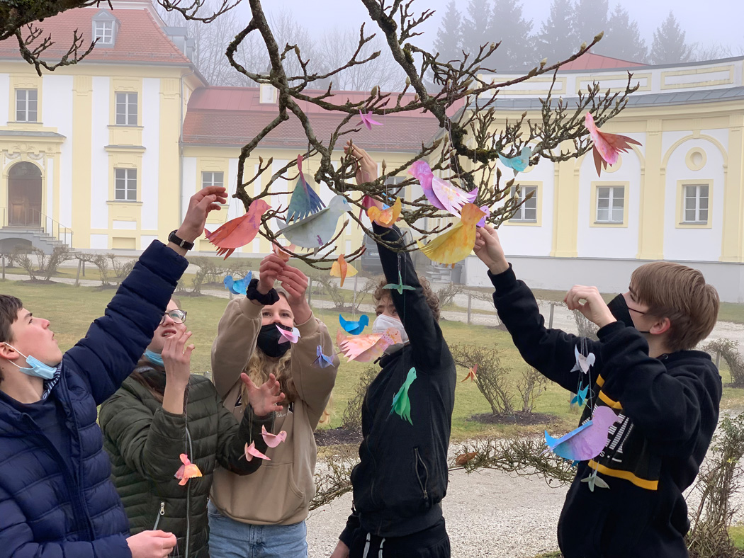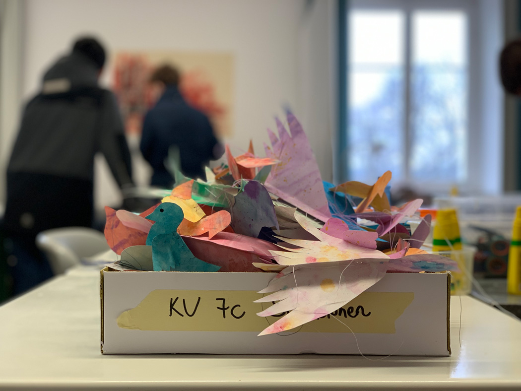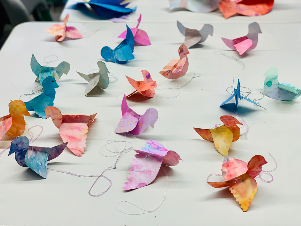 Der Winter war lang und grau. Wir brauchen wieder Farbe. Wir haben uns eine Schar bunter Zugvögel gebastelt. Papier marmoriert. Schablonen entworfen. Zwei Größen geschnitten. Alles zusammengeklebt. Mit Aufhängern versehen. Die Magnolie geschmückt. So ein Gezwitscher! Das hört sich nach Frühling an. Und so sieht es auch aus.