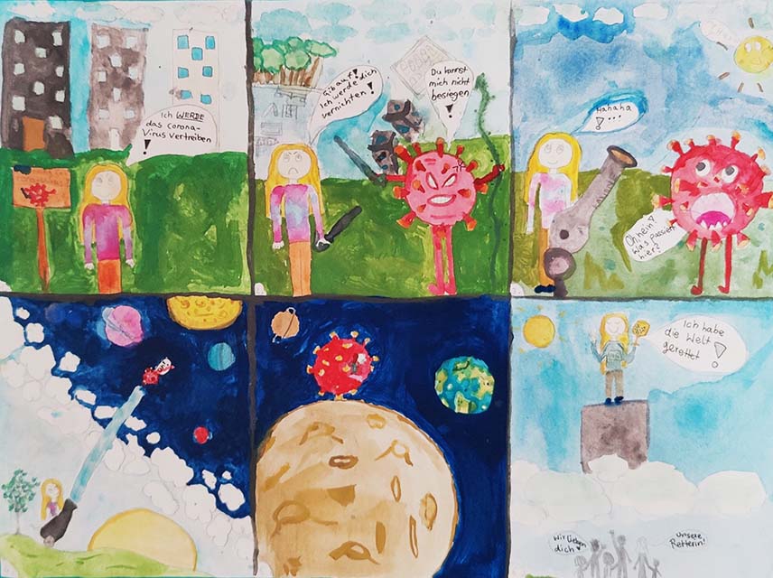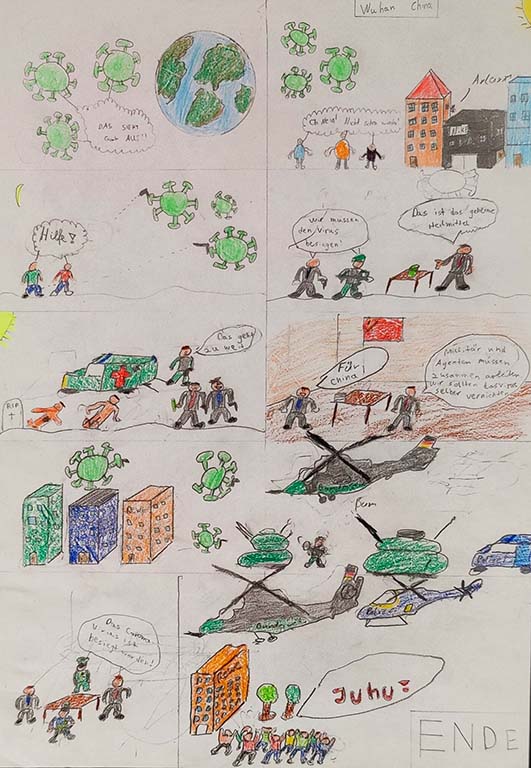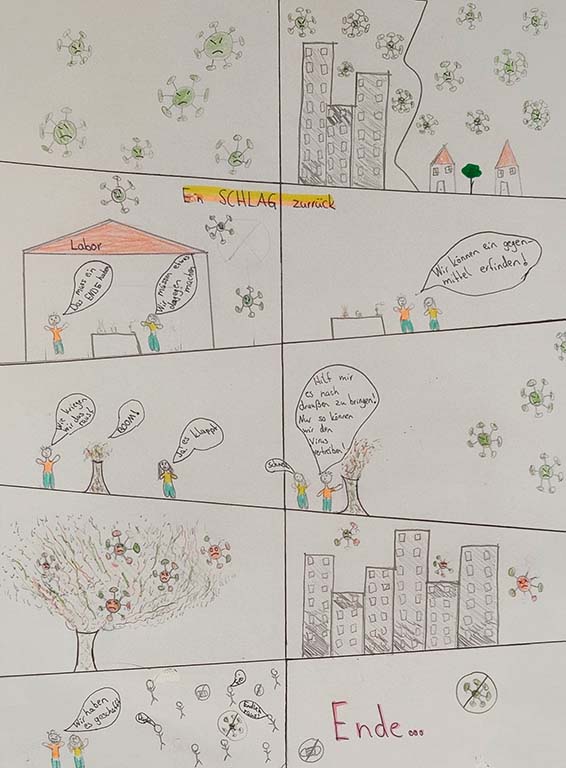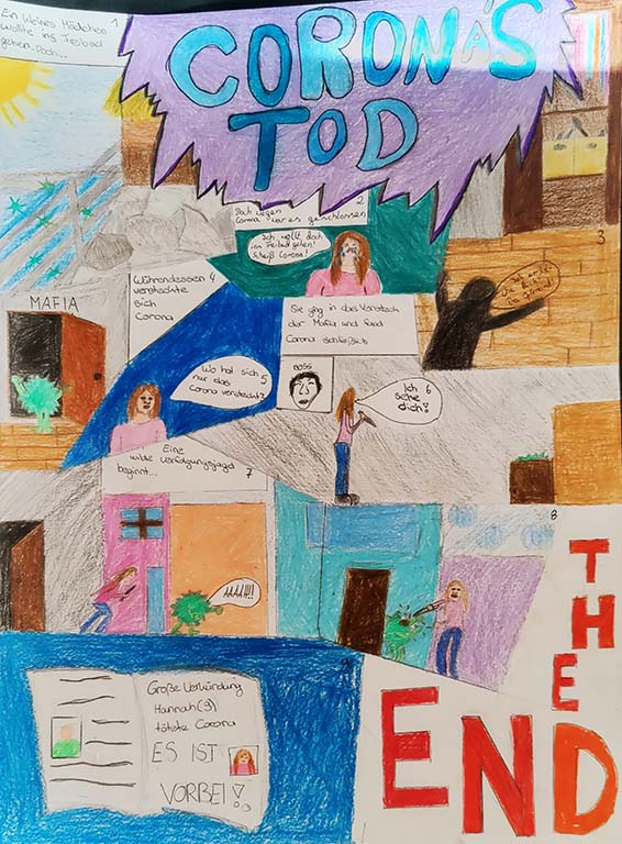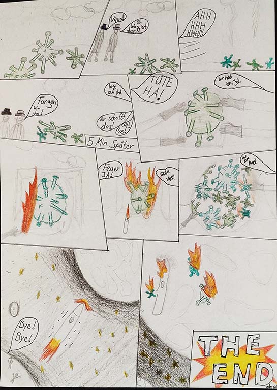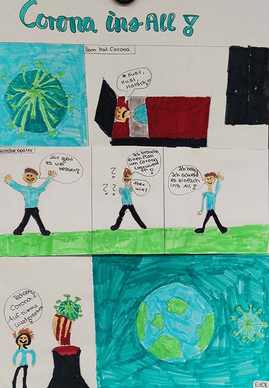 Alle hoffen auf ein Ende der Corona-Epidemie. Die 7b ließ ihrer Fantasie freien Lauf und löschte diesen Lästling auf elegante Weise aus! Ab ins All mit ihm! Eifrig wurde an Comics geschrieben und gezeichnet, teilweise als Patchwork-Arbeit. Viel Spaß beim Anschauen!