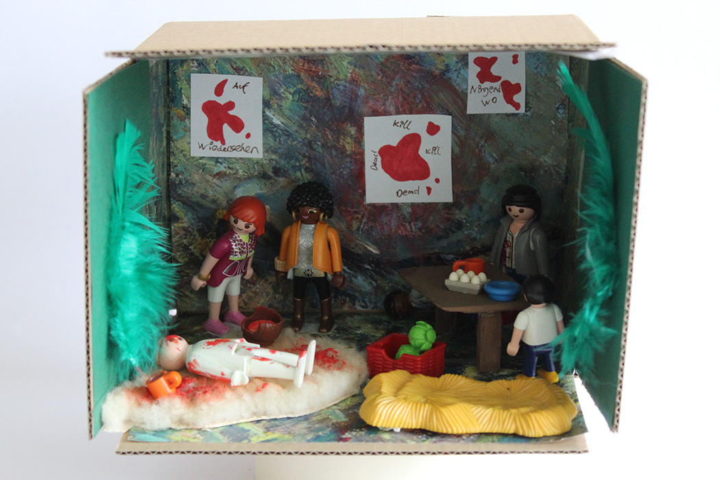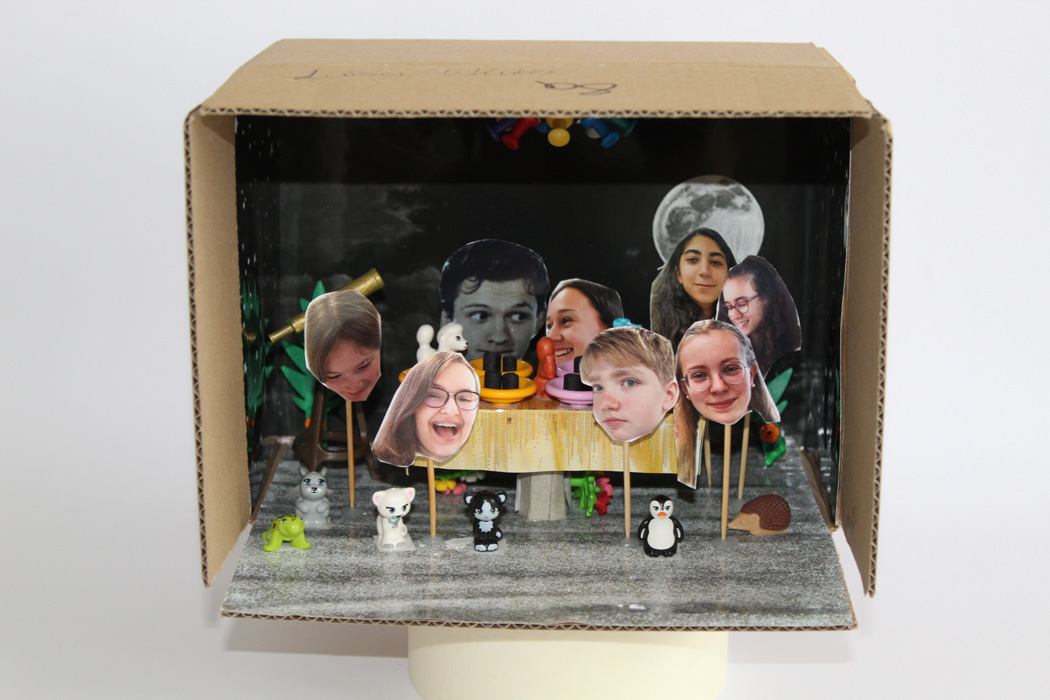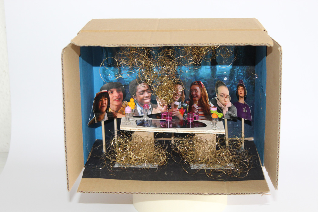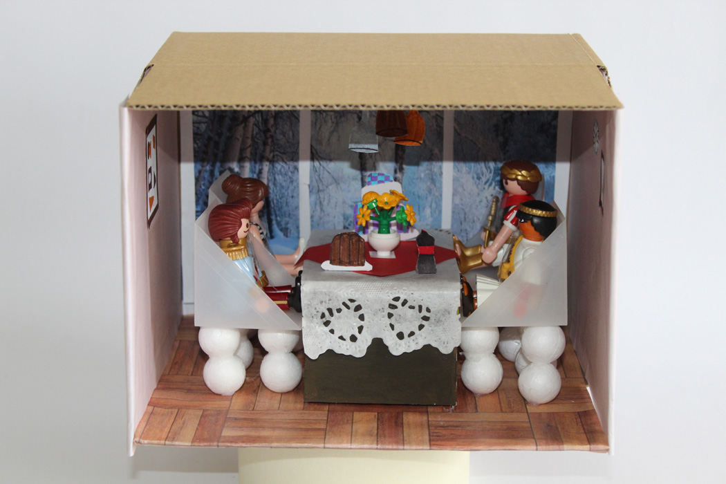 Die Klasse 8a hatte sich im Kunstunterricht zunächst mit unterschiedlichen Versionen des berühmten Bildmotives „Das Letzte Abendmahl“ beschäftigt, mit dem sich unterschiedliche Künstler/-innen immer wieder auseinandergesetzt haben - eines der bekanntesten Werke stammt von Leonardo da Vinci. Hierbei stellten die Schüler/-innen fest, dass unterschiedliche Anordnungen der Personen auch ganz unterschiedliche Bildwirkungen ergeben können. Ausgehend von da Vincis Werk erlernten die Schüler/-innen die Zentralperspektive und entwickelten davon ausgehend schließlich ihre ganz eigene Rauminszenierung – ein „Dinner in a box“.