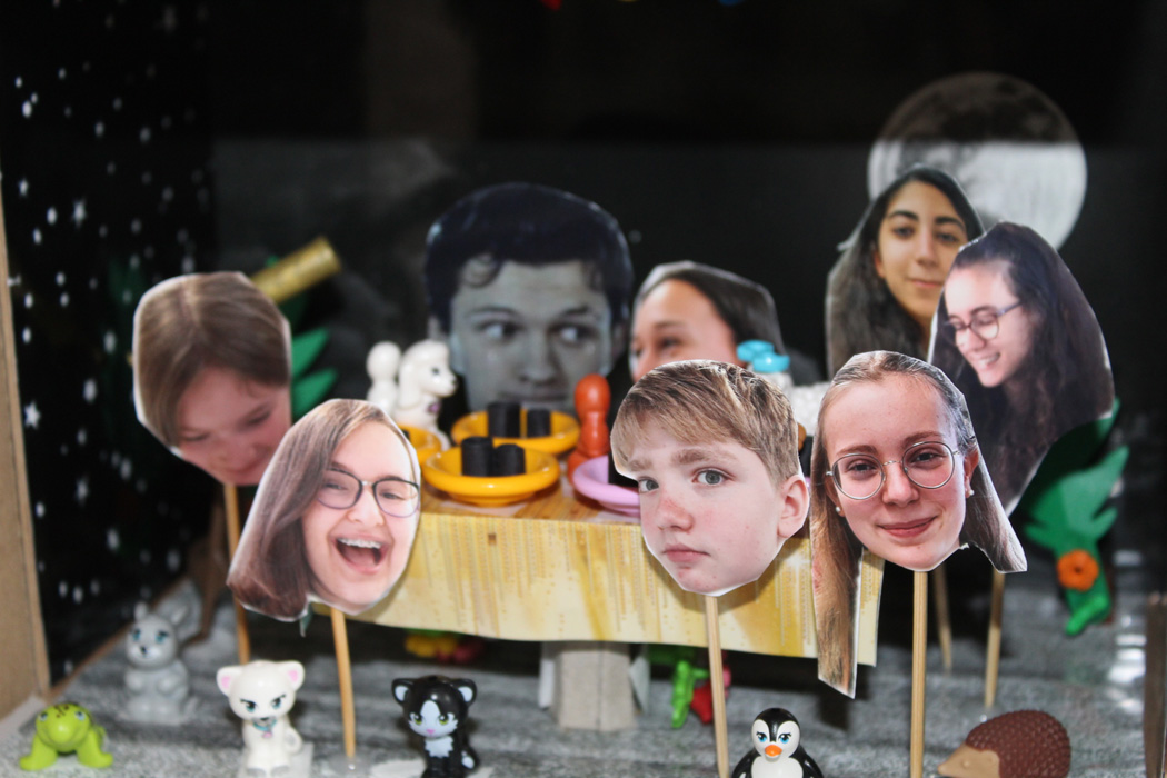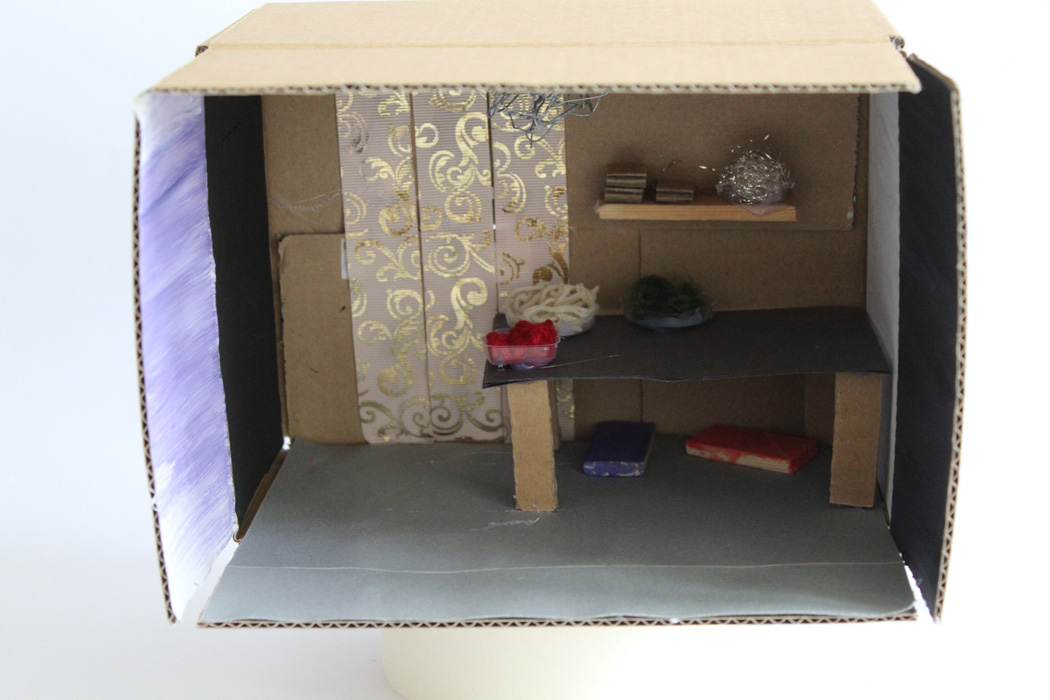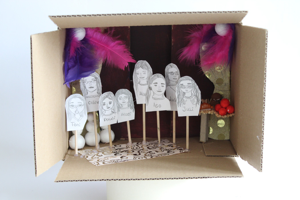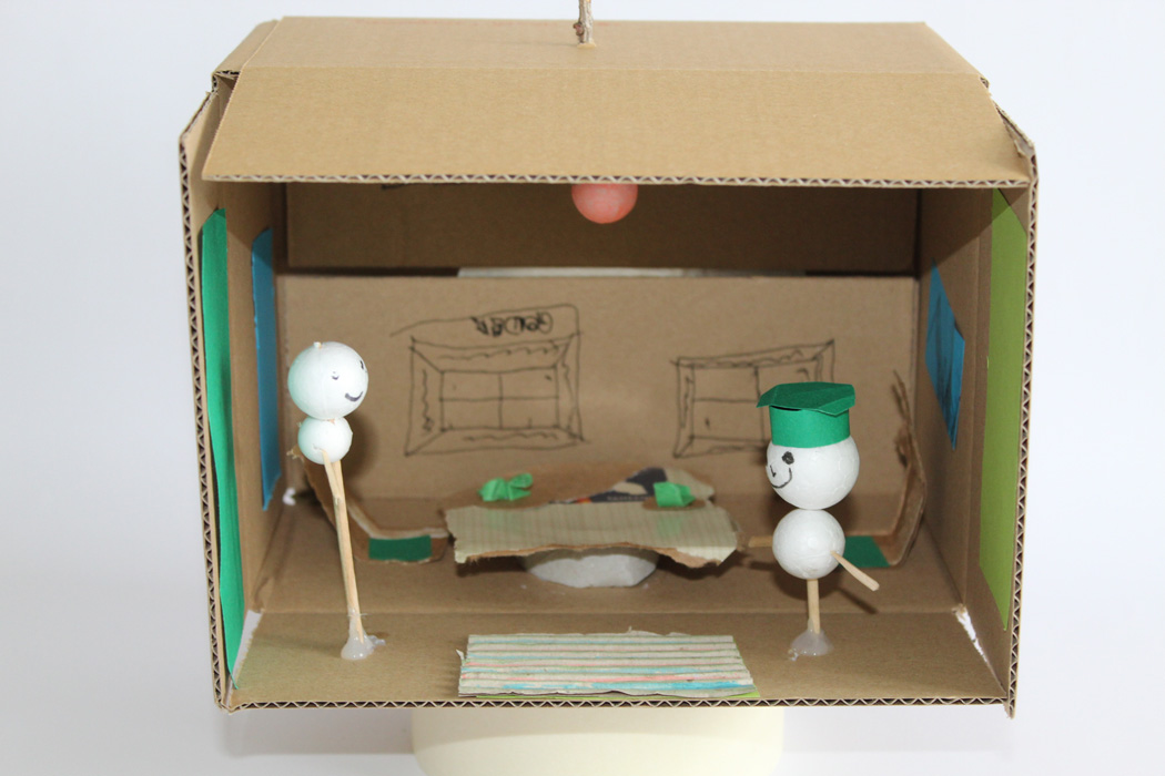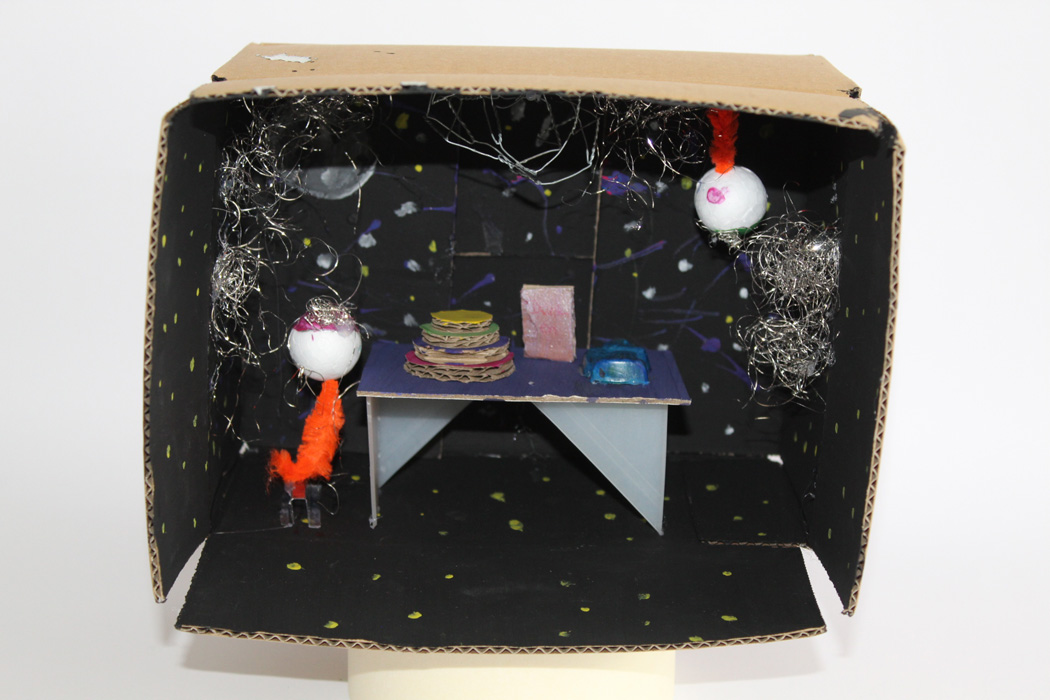 Die Klasse 8a hatte sich im Kunstunterricht zunächst mit unterschiedlichen Versionen des berühmten Bildmotives „Das Letzte Abendmahl“ beschäftigt, mit dem sich unterschiedliche Künstler/-innen immer wieder auseinandergesetzt haben - eines der bekanntesten Werke stammt von Leonardo da Vinci. Hierbei stellten die Schüler/-innen fest, dass unterschiedliche Anordnungen der Personen auch ganz unterschiedliche Bildwirkungen ergeben können. Ausgehend von da Vincis Werk erlernten die Schüler/-innen die Zentralperspektive und entwickelten davon ausgehend schließlich ihre ganz eigene Rauminszenierung – ein „Dinner in a box“.