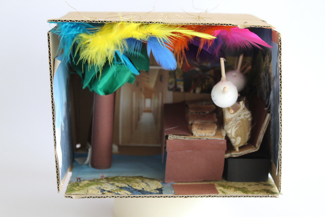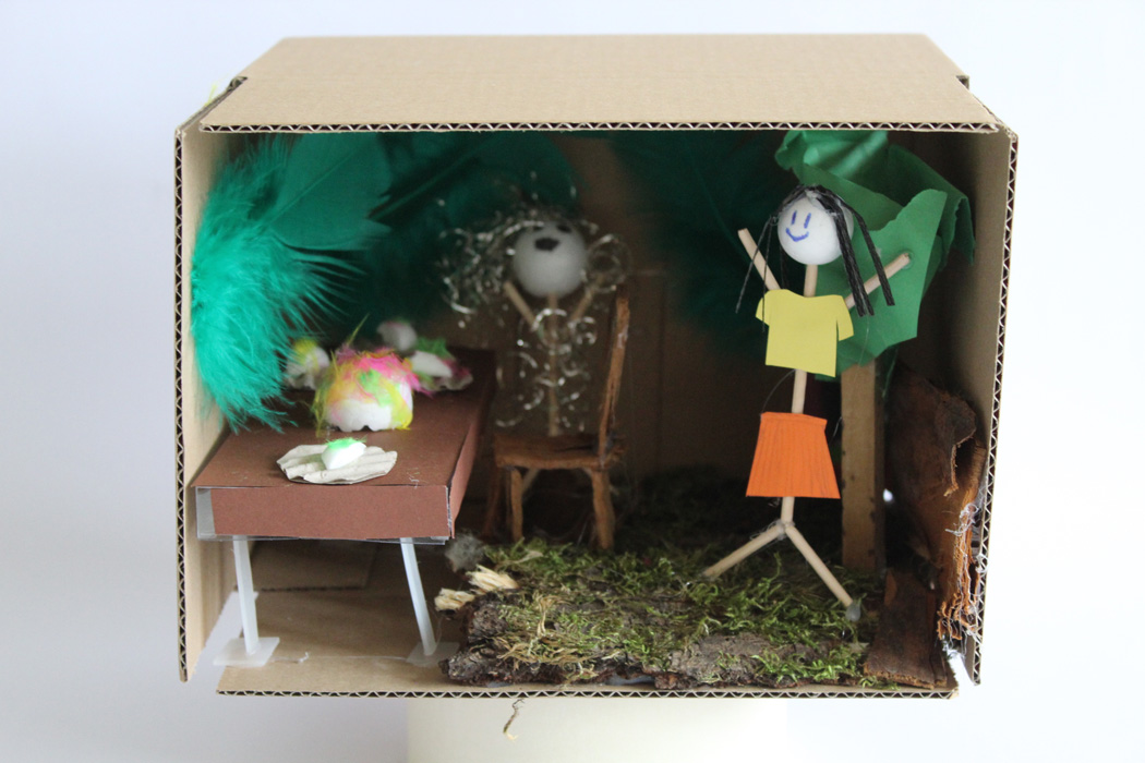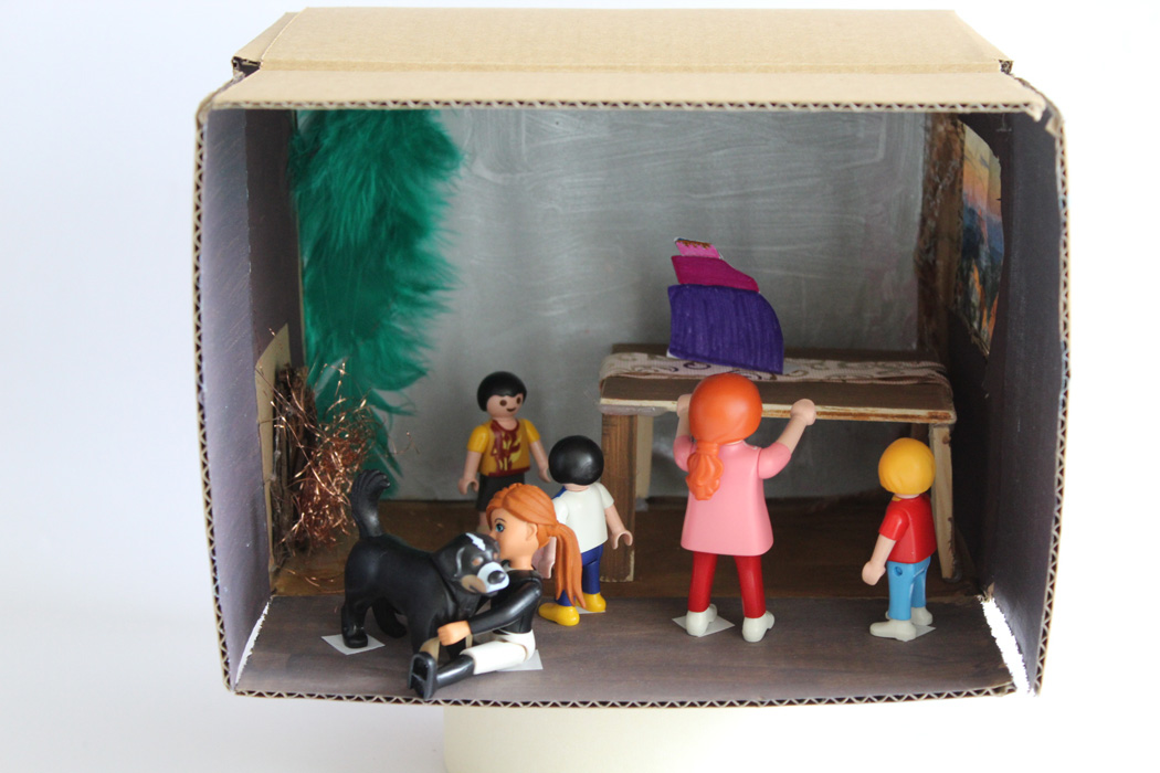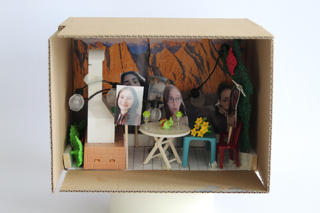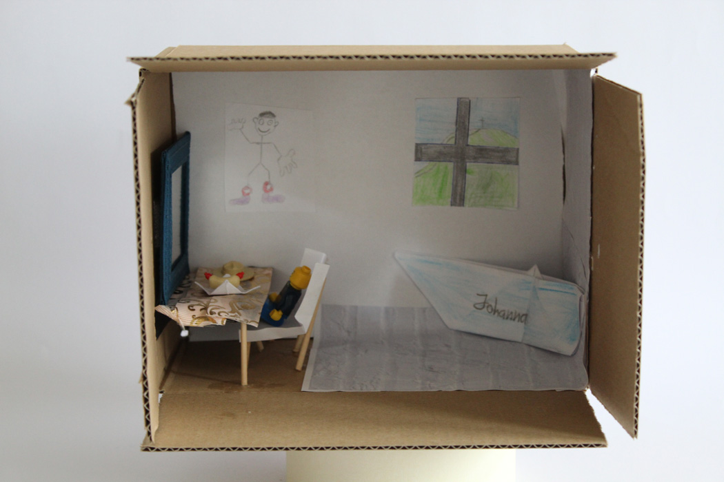 Die Klasse 8a hatte sich im Kunstunterricht zunächst mit unterschiedlichen Versionen des berühmten Bildmotives „Das Letzte Abendmahl“ beschäftigt, mit dem sich unterschiedliche Künstler/-innen immer wieder auseinandergesetzt haben - eines der bekanntesten Werke stammt von Leonardo da Vinci. Hierbei stellten die Schüler/-innen fest, dass unterschiedliche Anordnungen der Personen auch ganz unterschiedliche Bildwirkungen ergeben können. Ausgehend von da Vincis Werk erlernten die Schüler/-innen die Zentralperspektive und entwickelten davon ausgehend schließlich ihre ganz eigene Rauminszenierung – ein „Dinner in a box“.