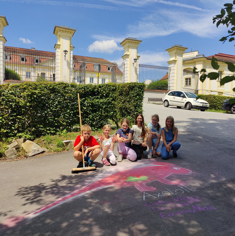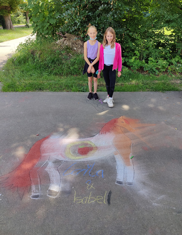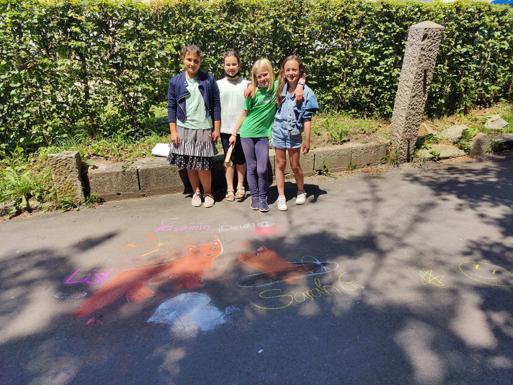 Die Klasse 5a arbeitete in Kunst an einem Street-Art Projekt. Das Thema lautete: Im Bauch des...... In der Biologie gibt es den Begriff der Nahrungskette. Hier wird dargestellt, wer auf der Speisekarte des nächsten größeren Lebewesens steht. Diese Nahrungskette lieferte die Idee, ein Kunstwerk zu schaffen, das zeigt, welche Beute im Bauch der Räuber landet. Zuerst wurden Skizzen der Schüler erstellt und dann in einem gemeinsamen Voting entschieden, welche Darstellungen ausgewählt werden. Ausgestattet mit Kreiden, Besen, um die Farbe zu verwischen, und viel Energie wurde dann das Projekt auf der Straße mit Kreide ausgeführt. Der Wal, der Fische frisst; der Axolotl, der Algen im Bauch hat; der Marder mit der kleinen Maus; das Pferd mit Gras und der Bär, der statt Honig versehentlich eine Biene erwischt hat, sind nun bei uns auf dem kleinen Gehweg unterhalb des Parkplatzes zu sehen.