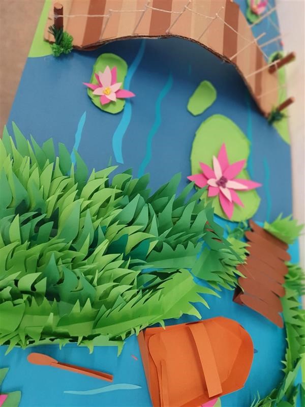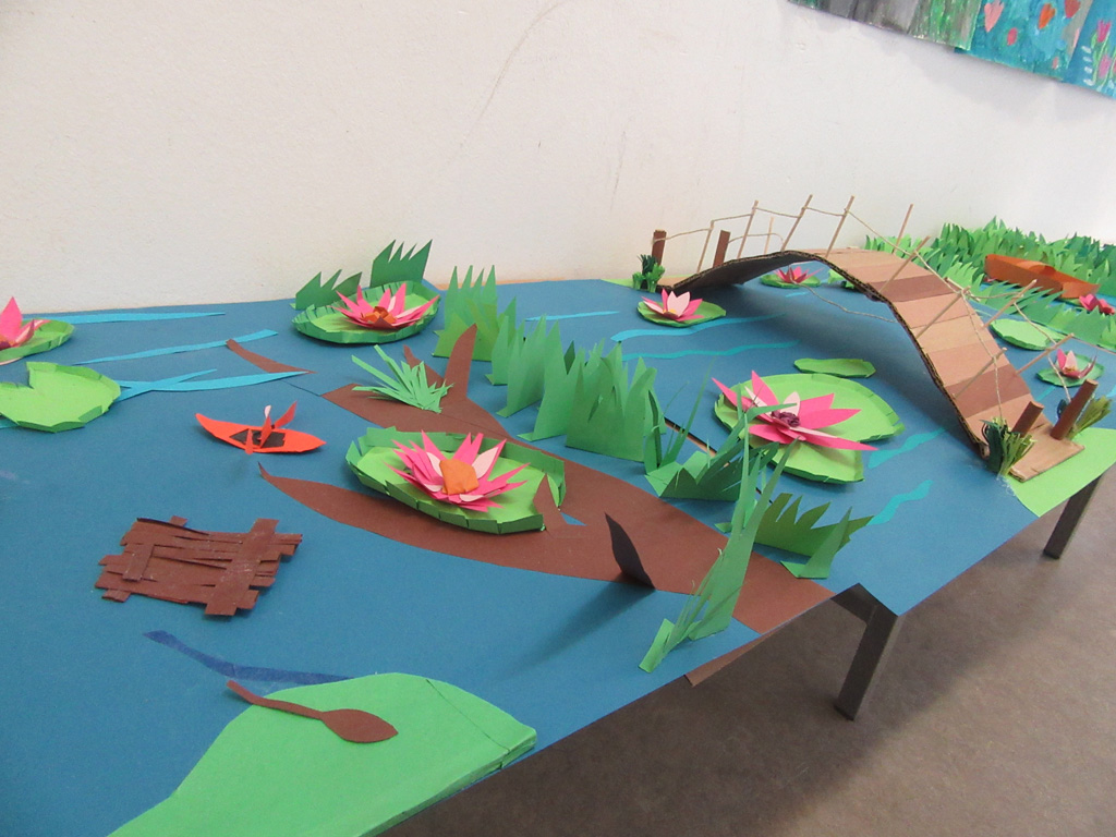 … begab sich die Klasse 7c. Die Schülerinnen und Schüler setzten sich mit Claude Monets berühmten Seerosenbildern und wichtigen Stilmerkmalen des Impressionismus auseinander und setzten dann die Wasserlandschaft dreidimensional in Papier um.
