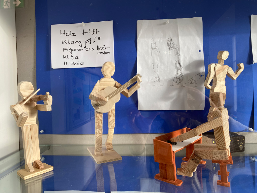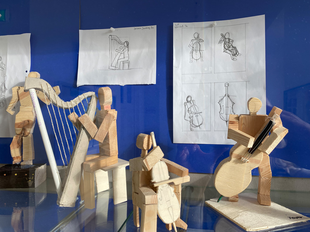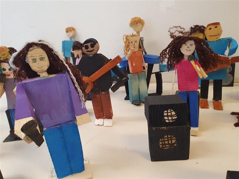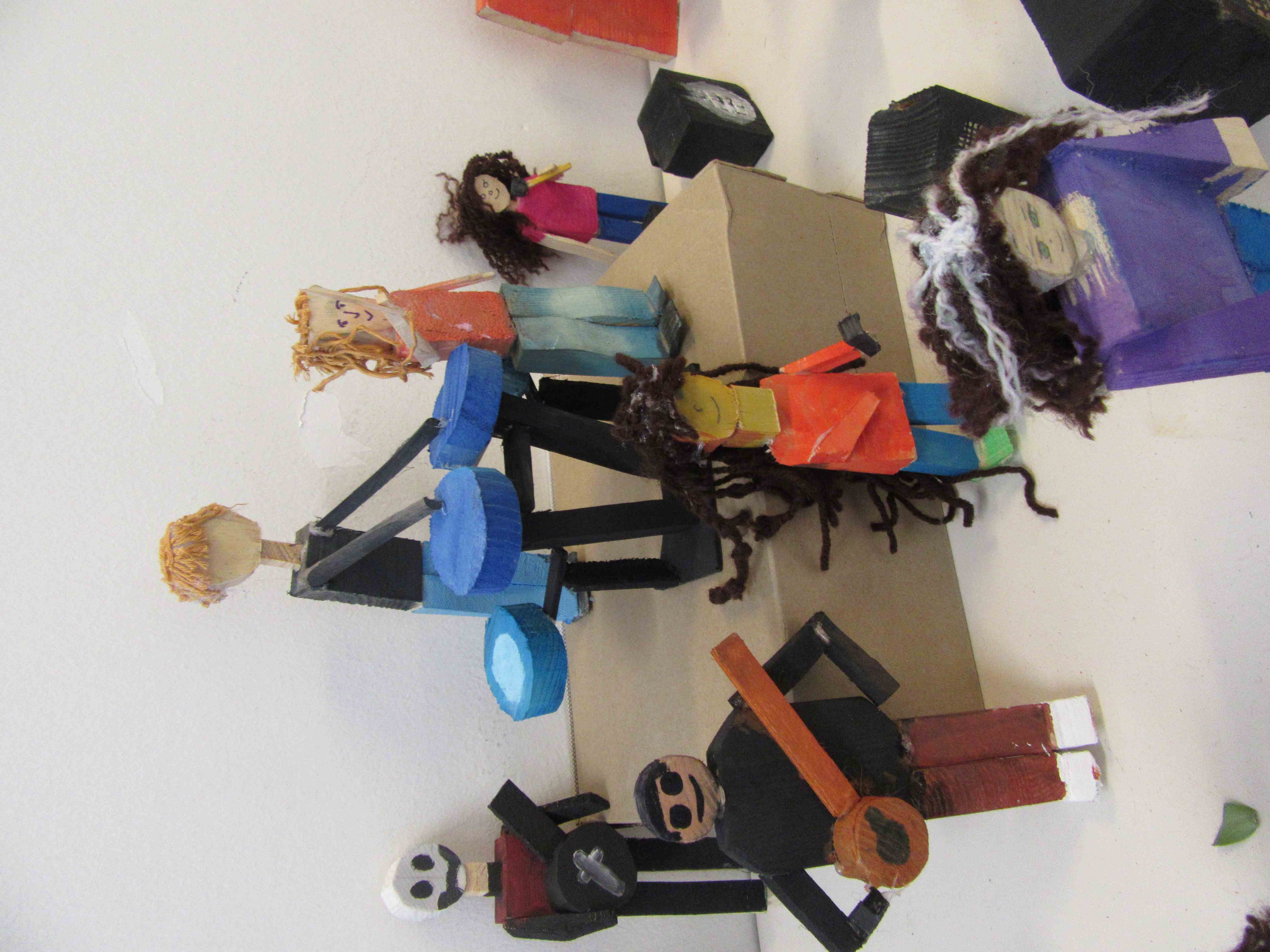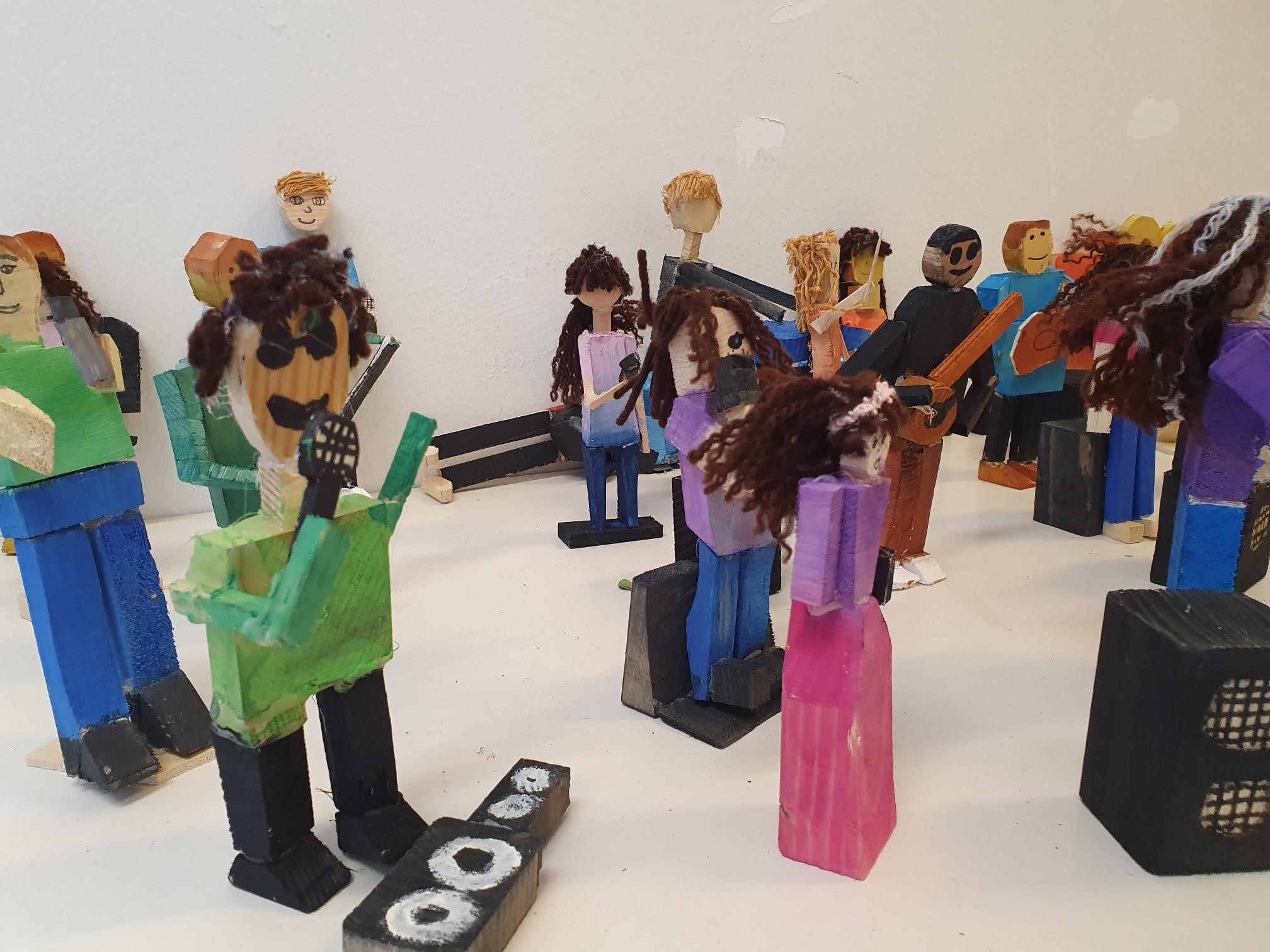 Zum Thema Figur entwickelte die Klasse 6d ein kunterbuntes Orchester mit Gitarristen, Sängern, aber auch DJs. Die aus Holzresten gestalteten Figuren wurden anschließend bemalt und weitergestaltet.
