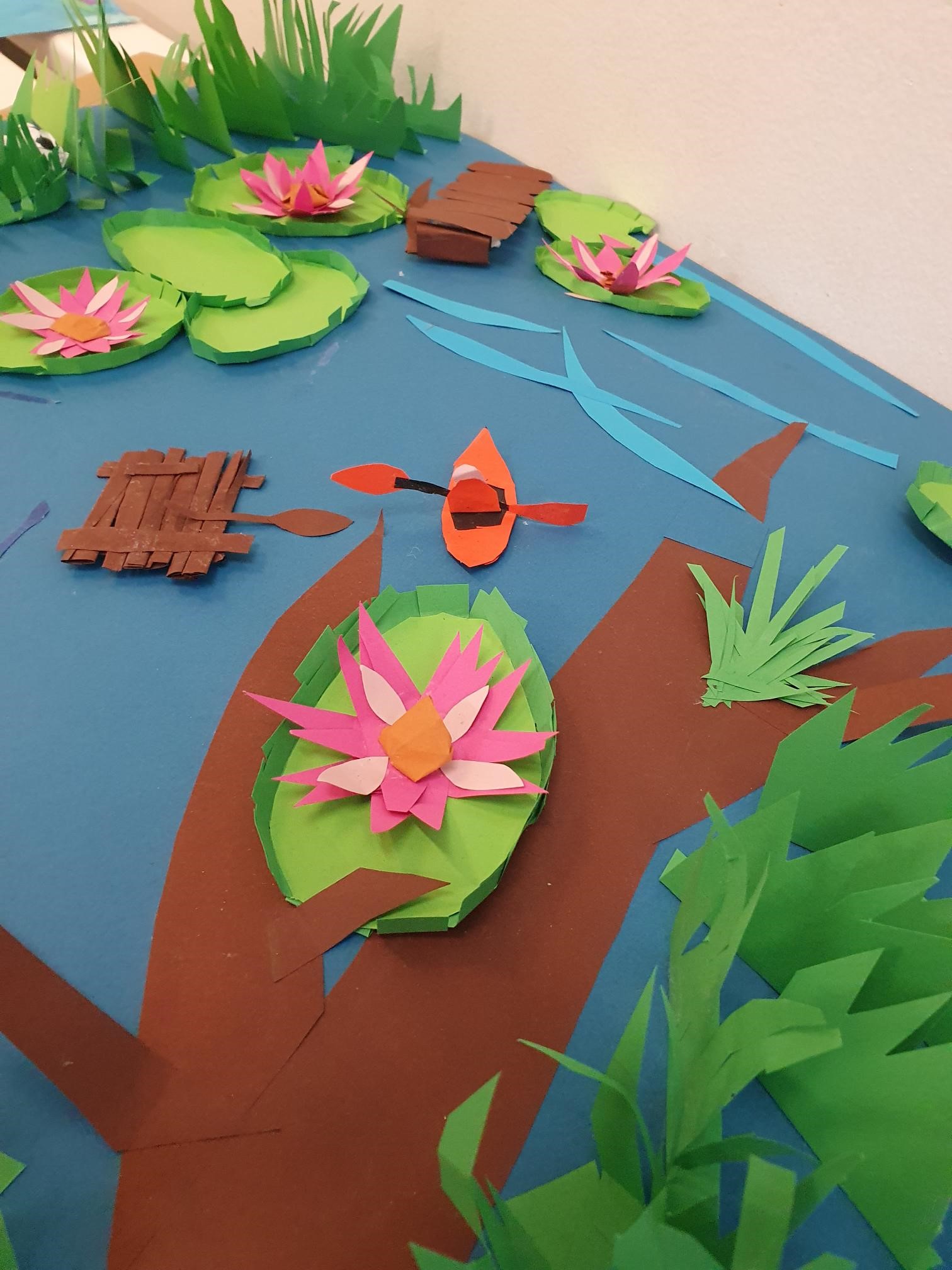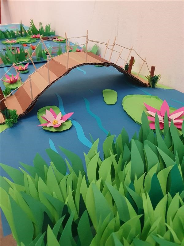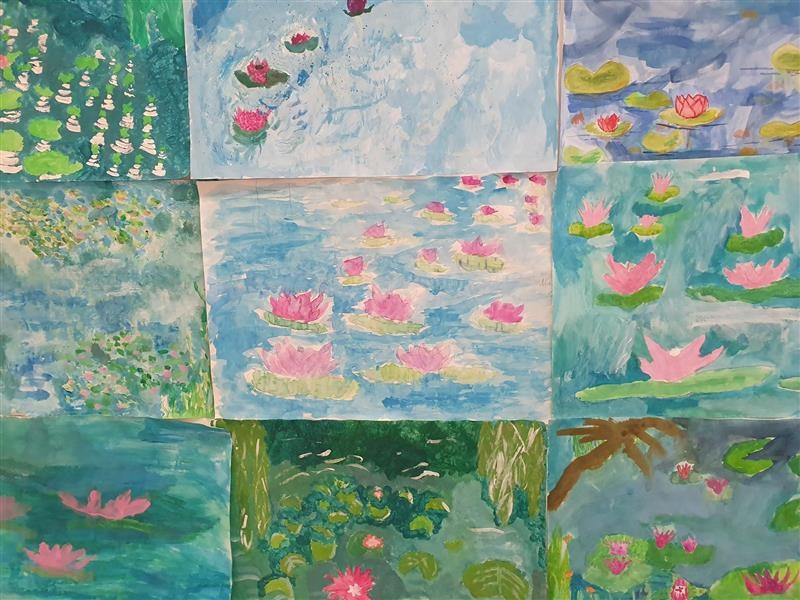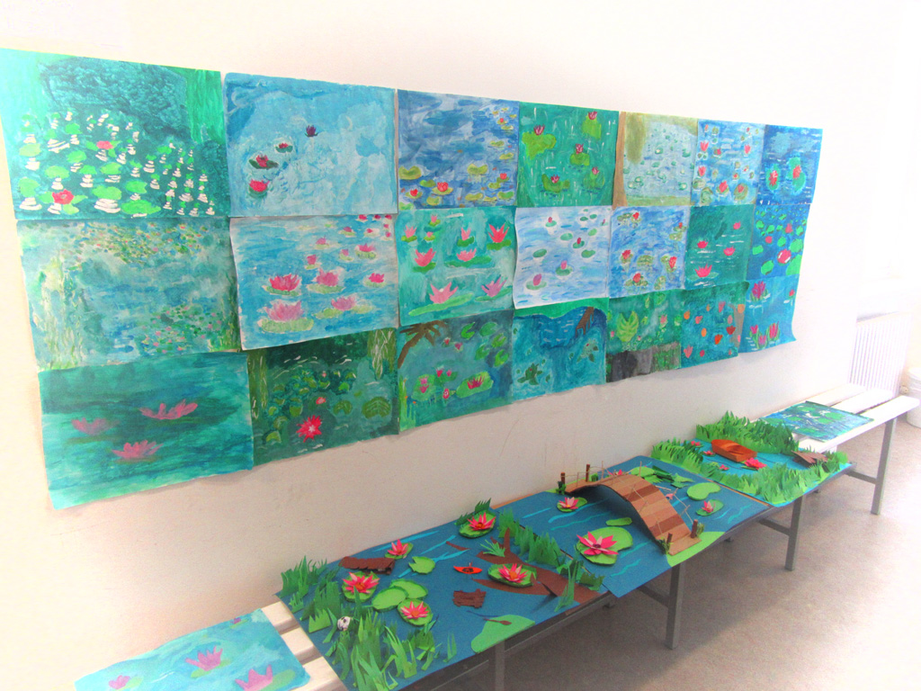 … begab sich die Klasse 7c. Die Schülerinnen und Schüler setzten sich mit Claude Monets berühmten Seerosenbildern und wichtigen Stilmerkmalen des Impressionismus auseinander und setzten dann die Wasserlandschaft dreidimensional in Papier um.