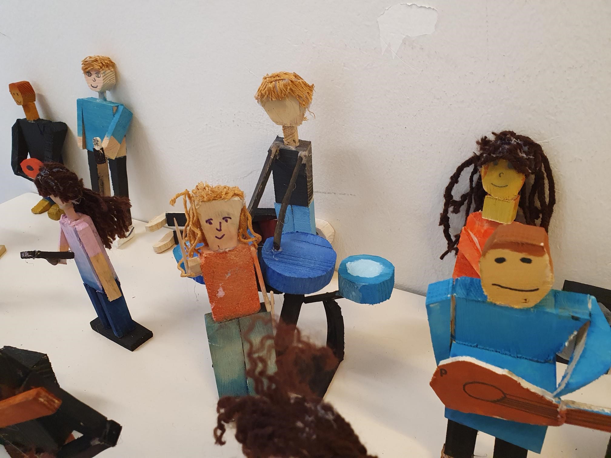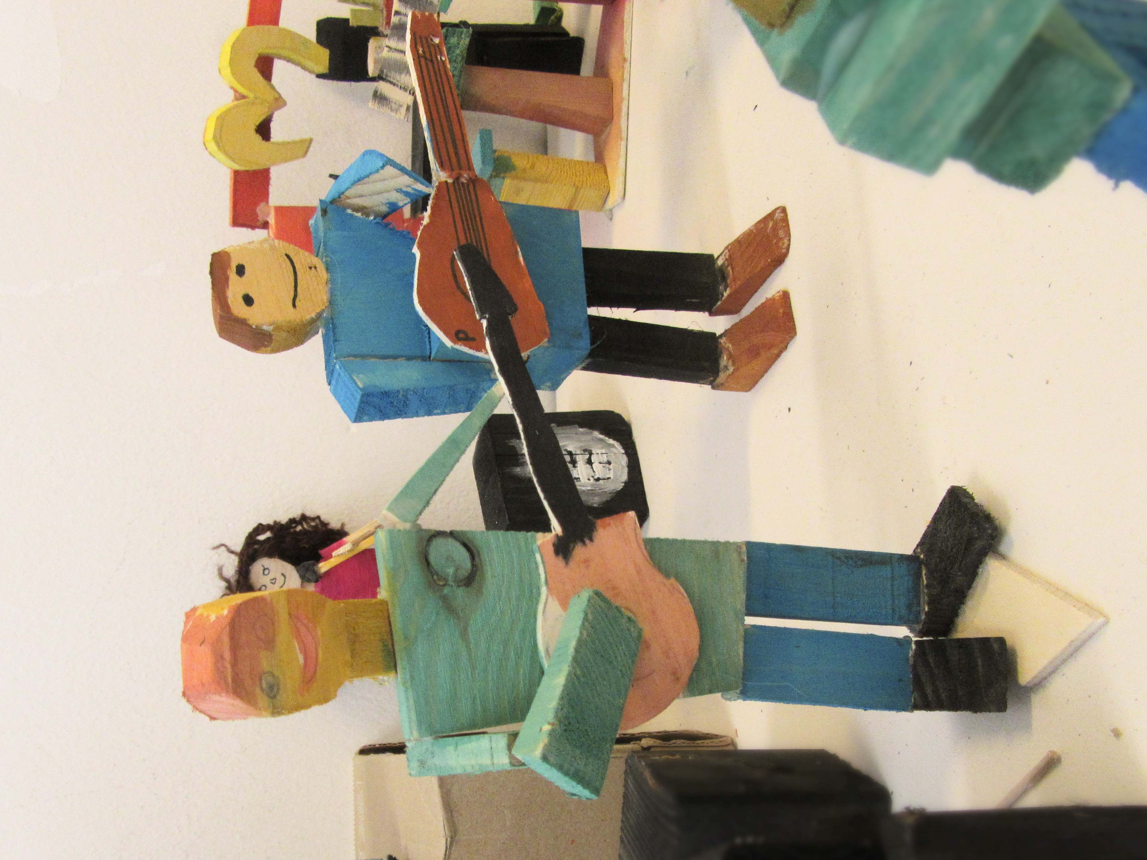 Zum Thema Figur entwickelte die Klasse 6d ein kunterbuntes Orchester mit Gitarristen, Sängern, aber auch DJs. Die aus Holzresten gestalteten Figuren wurden anschließend bemalt und weitergestaltet.
