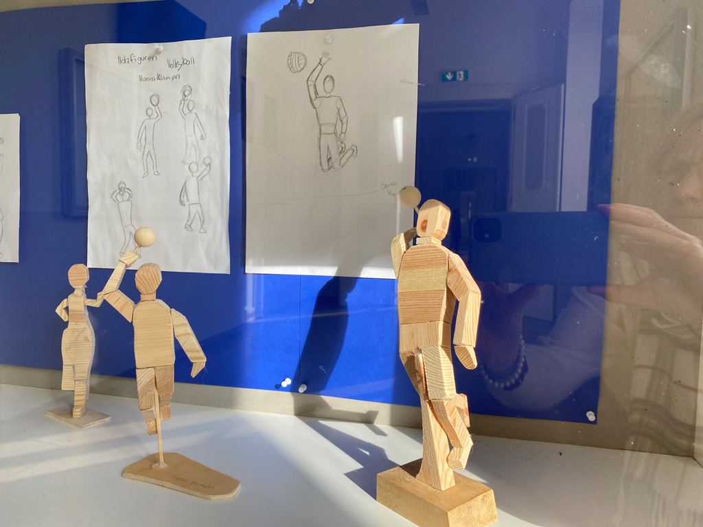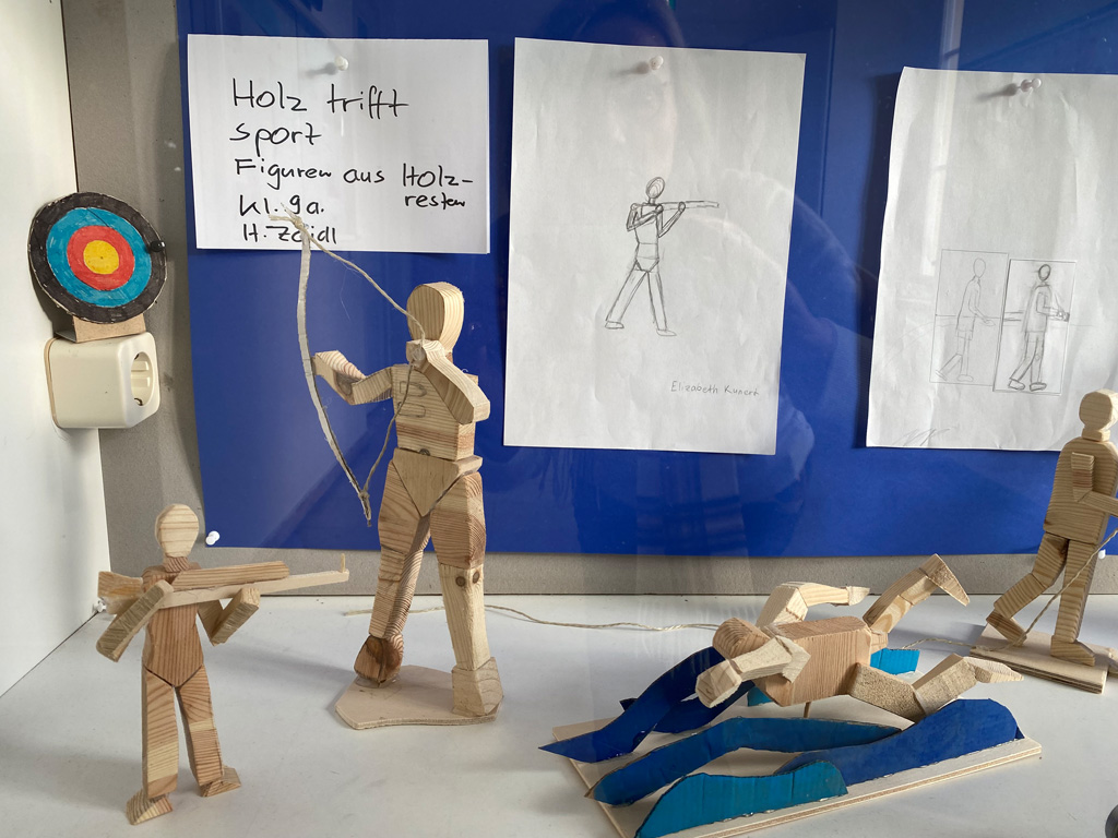 Auch die 9a gestaltete aus Holzresten Figuren zum Thema "Sport" und "Musik". Jede(r) konnte hier seine persönliche Leidenschaft plastisch darstellen. Hier wurden Farben nur sehr spärlich eingesetzt. So wirken die unterschiedlichen Maserungen des Rohstoffs Holz als gestalterisches Element.