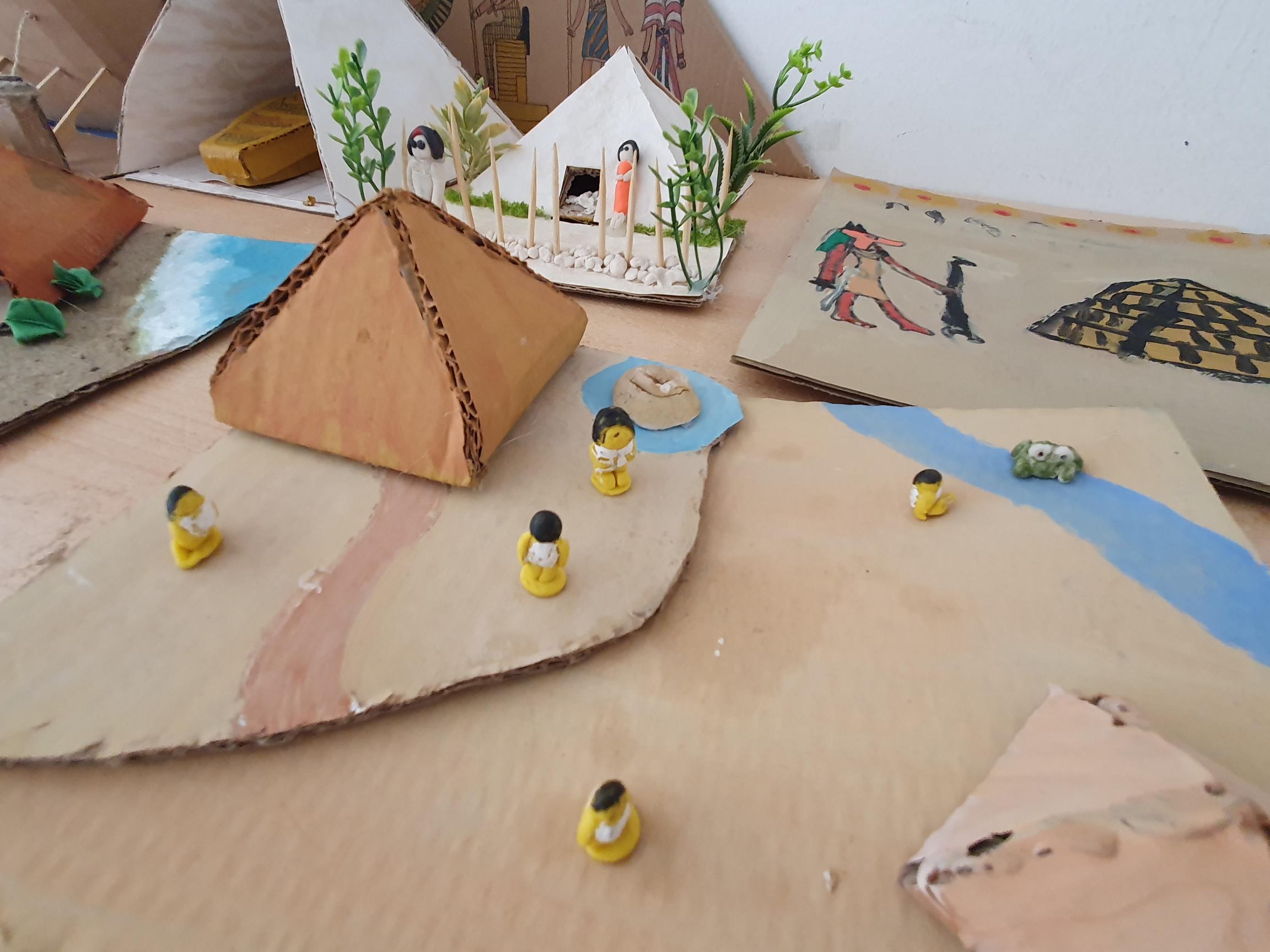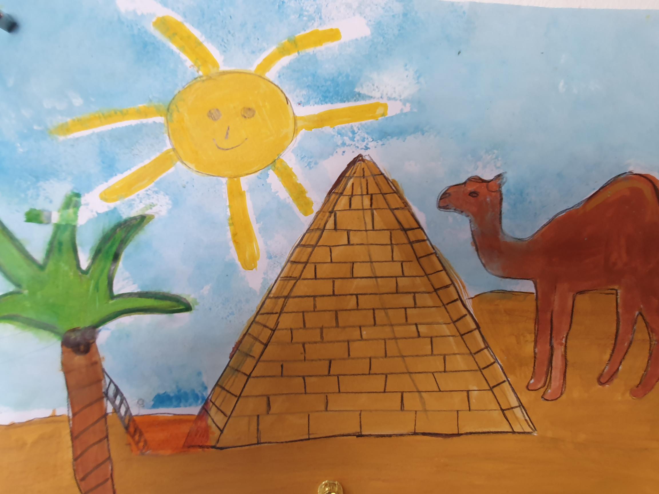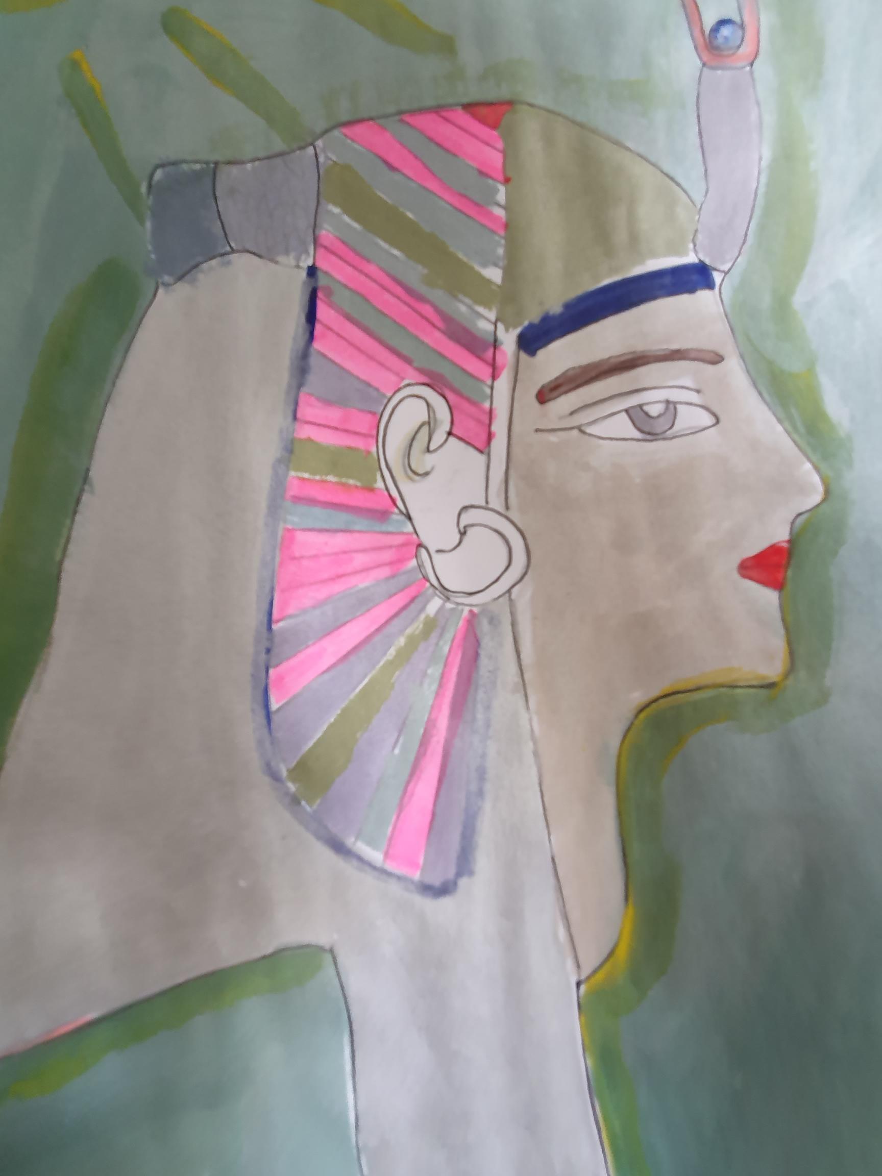… kann man derzeit im Engelhaus unternehmen. Die Klassen 5a und 6d haben sich mit der Altägyptischen Kunst auseinandergesetzt und nehmen uns mit ins Land der Pharaonen und Pyramiden.