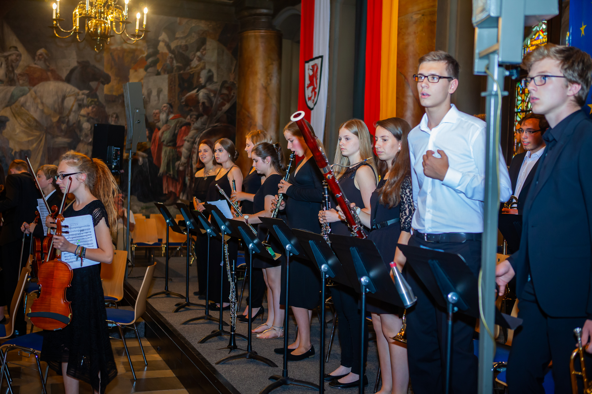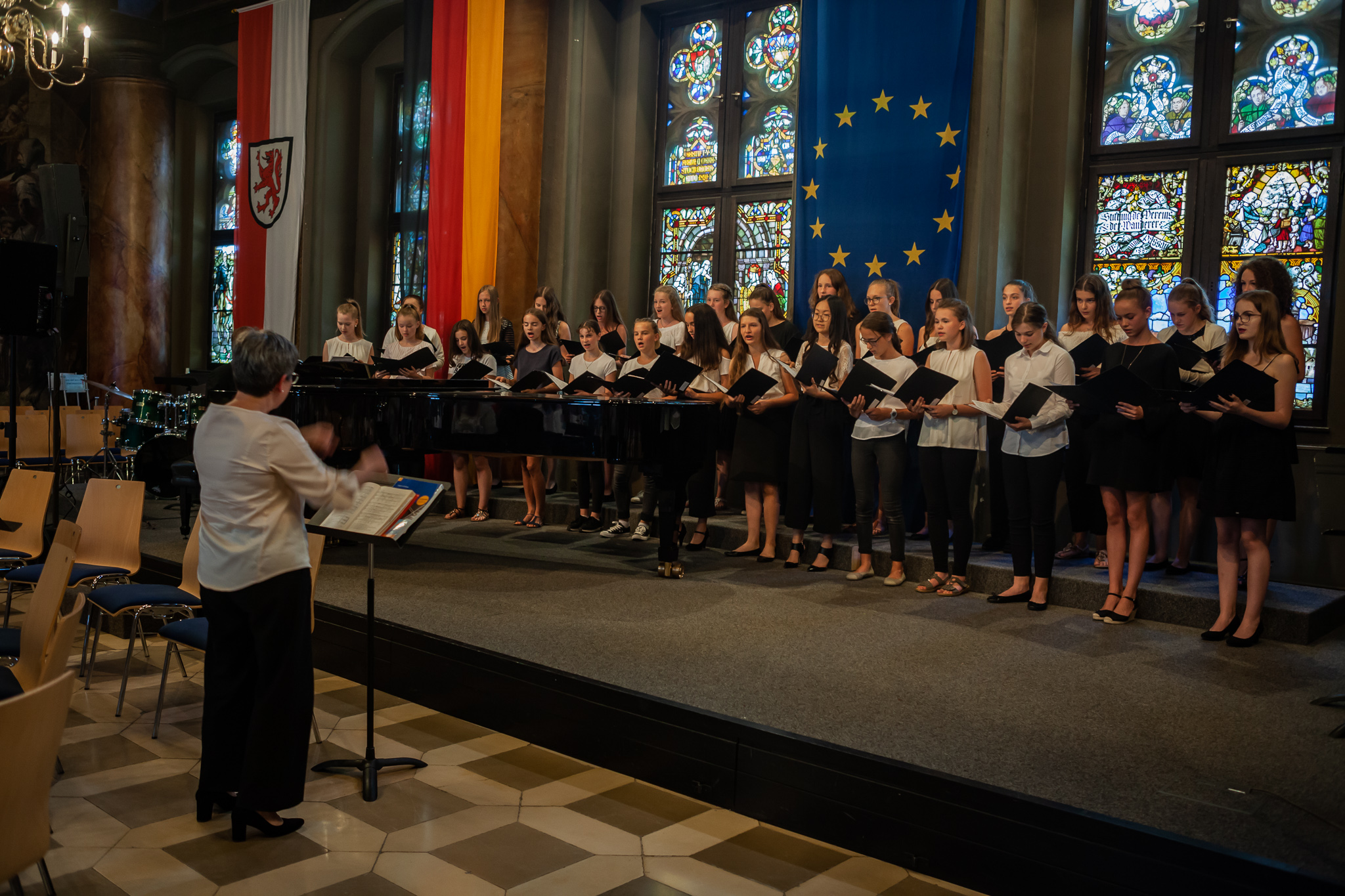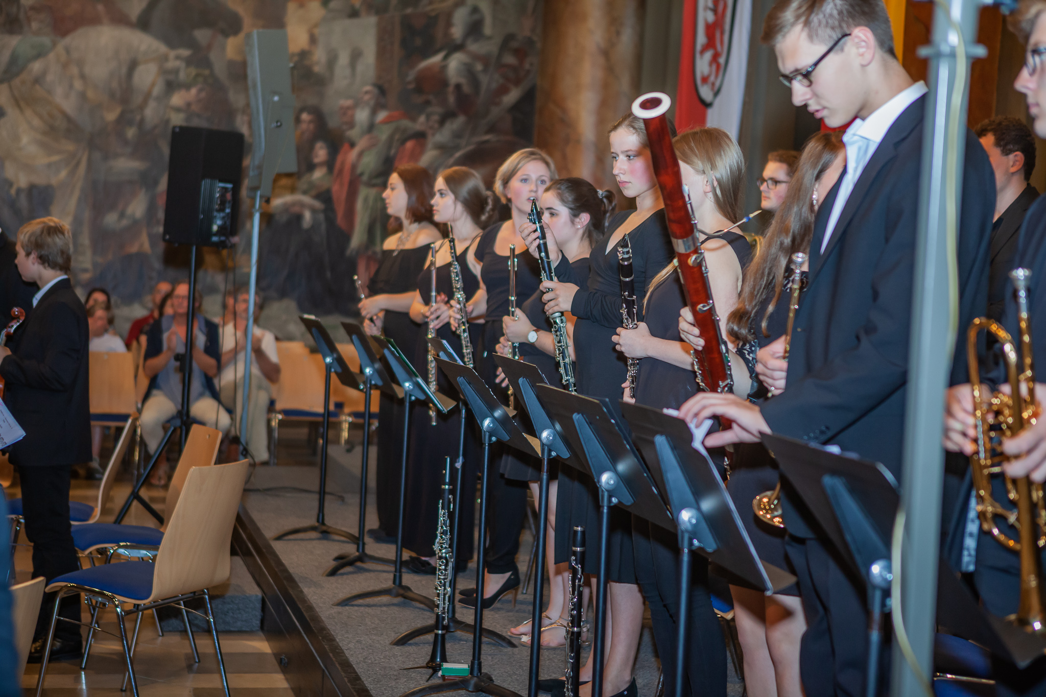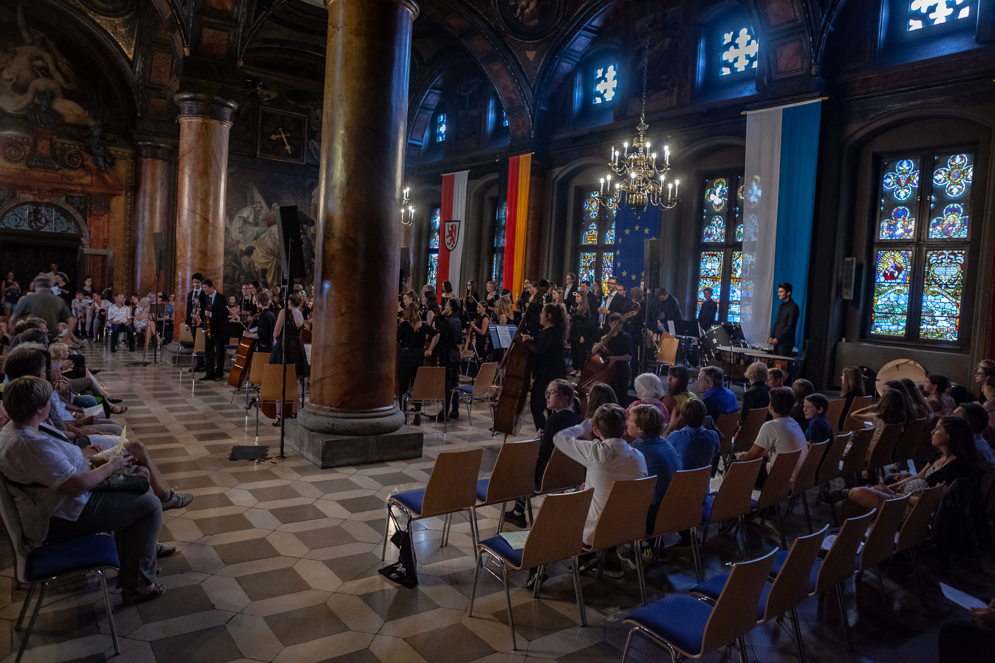 Mit dem Maria-Ward-Preis 2018 hat das Auersperg-Gymnasium im Rahmen der höchst beeindruckenden Jahreskonzerte im großen Rathaussaal Hannah Ecker (6.v.r.) geehrt. Schulleiter Christian Zitzl zeichnete zudem Franziska Fischer (4.v.r), Elisabeth Pontz (5.v.l.), Marie Groß (4.v.l.), Elena Breinfalk (5.v.r.) und Martin Schmid (3.v.l.) mit dem Großen Musikpreis aus. Die jungen Musiker und Sänger brillierten an den beiden Abenden mit herausragendem Können.