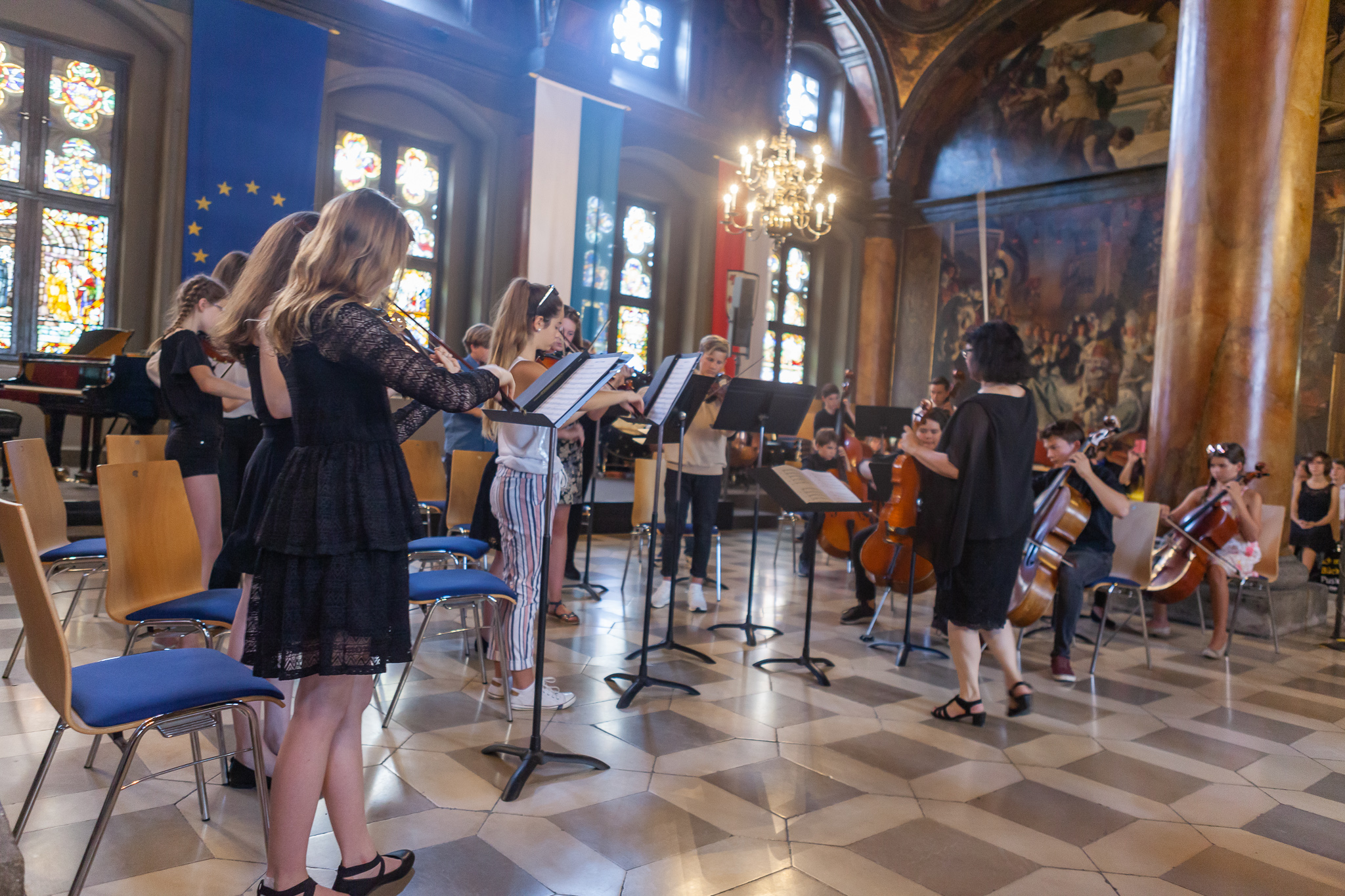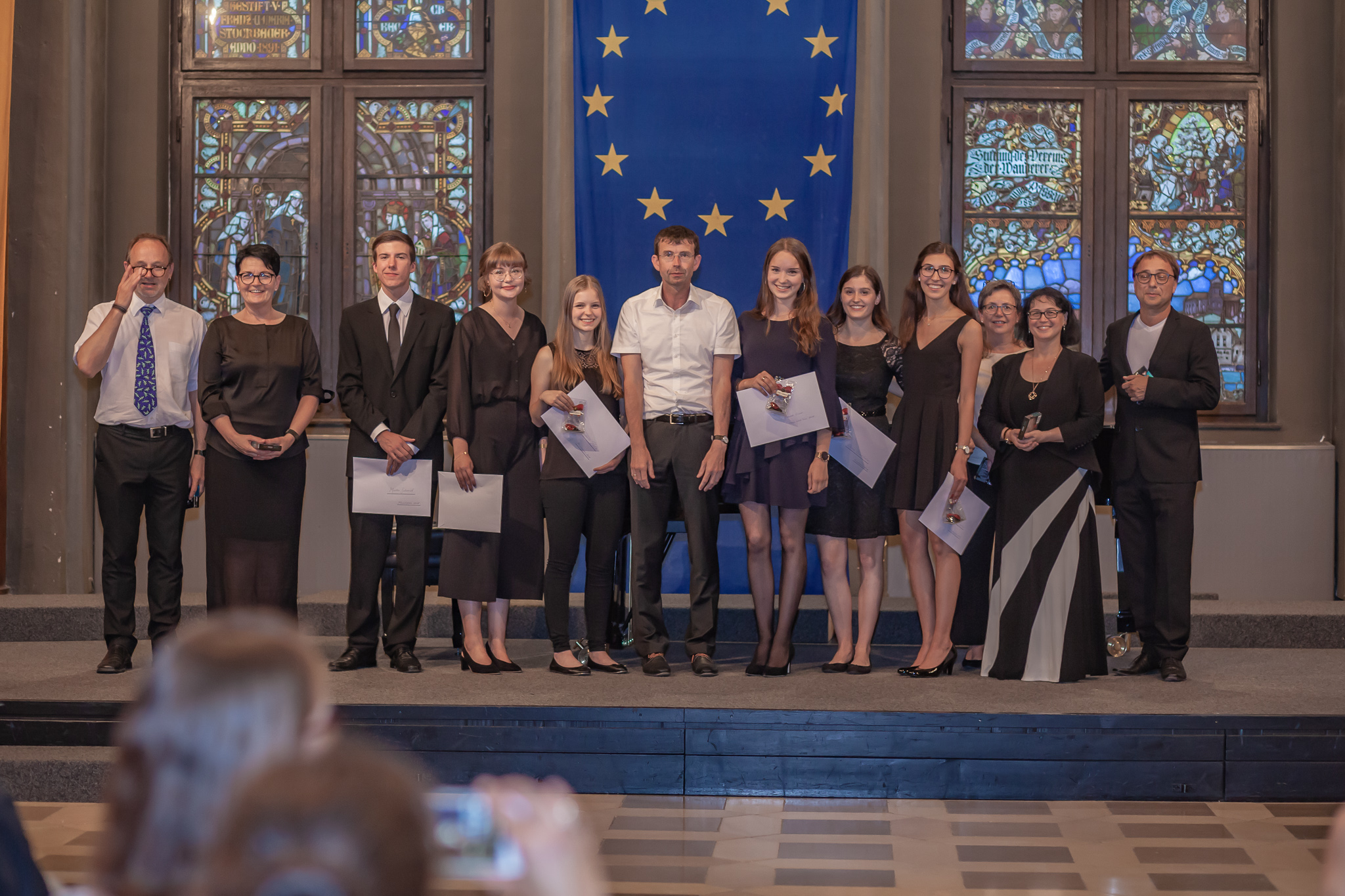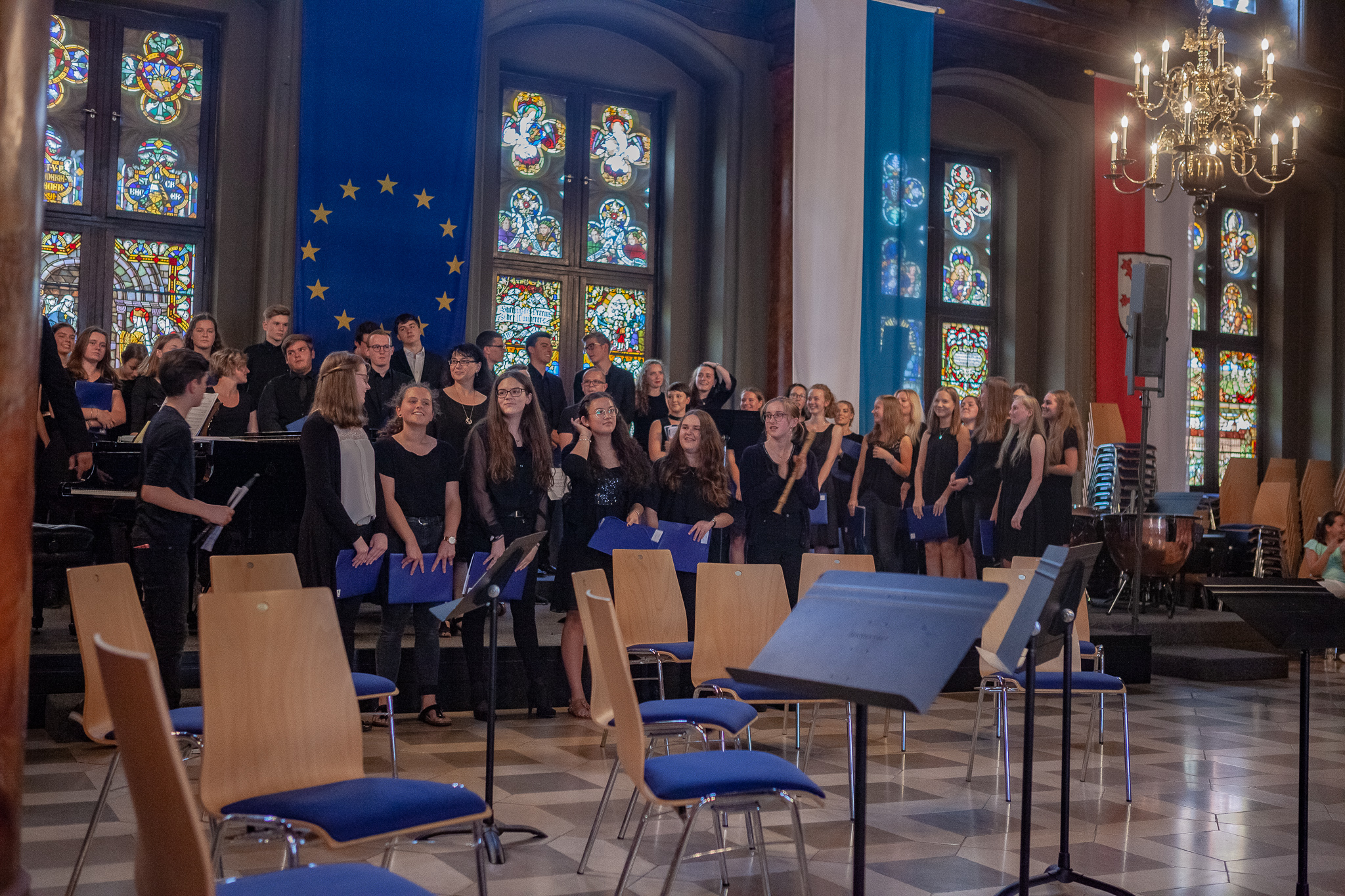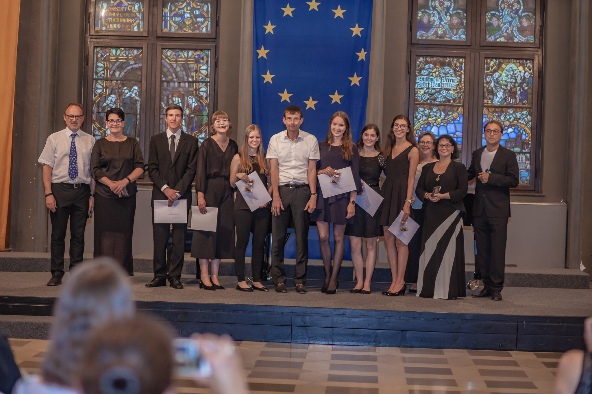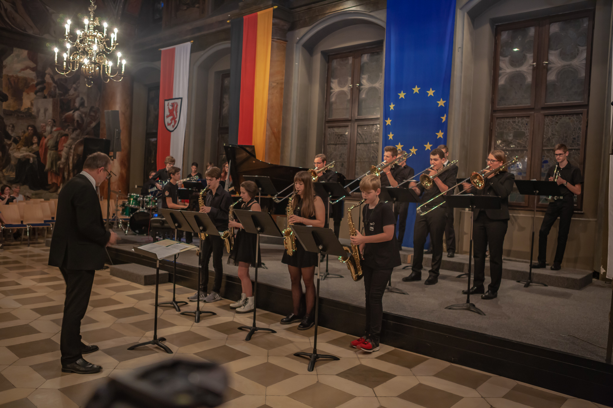 Mit dem Maria-Ward-Preis 2018 hat das Auersperg-Gymnasium im Rahmen der höchst beeindruckenden Jahreskonzerte im großen Rathaussaal Hannah Ecker (6.v.r.) geehrt. Schulleiter Christian Zitzl zeichnete zudem Franziska Fischer (4.v.r), Elisabeth Pontz (5.v.l.), Marie Groß (4.v.l.), Elena Breinfalk (5.v.r.) und Martin Schmid (3.v.l.) mit dem Großen Musikpreis aus. Die jungen Musiker und Sänger brillierten an den beiden Abenden mit herausragendem Können.