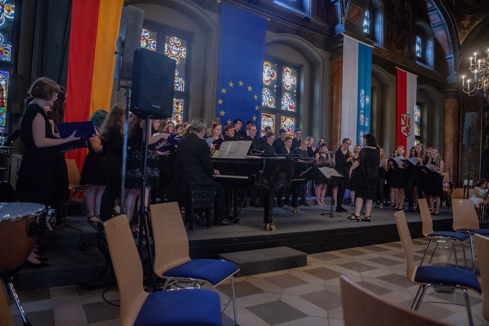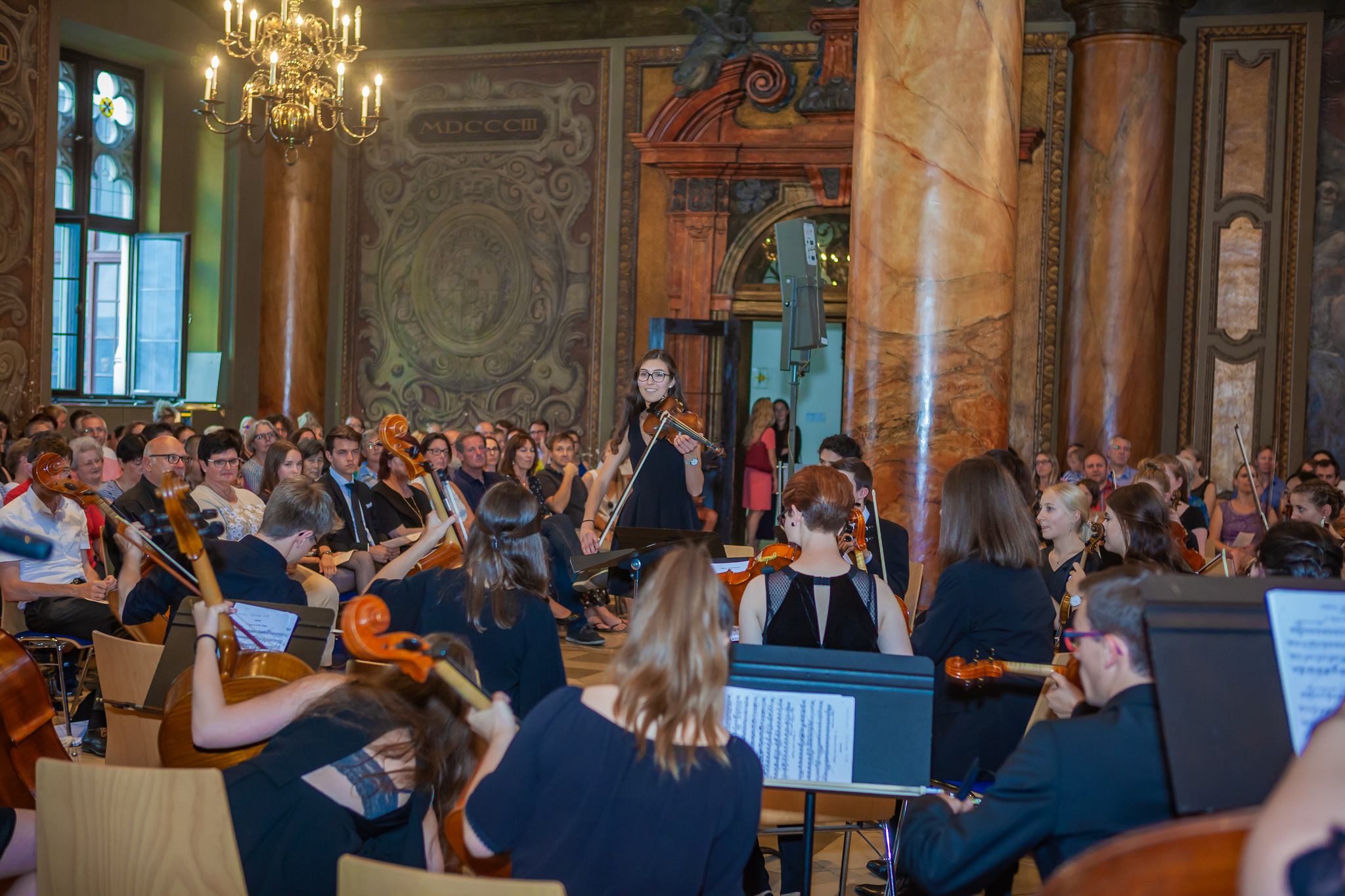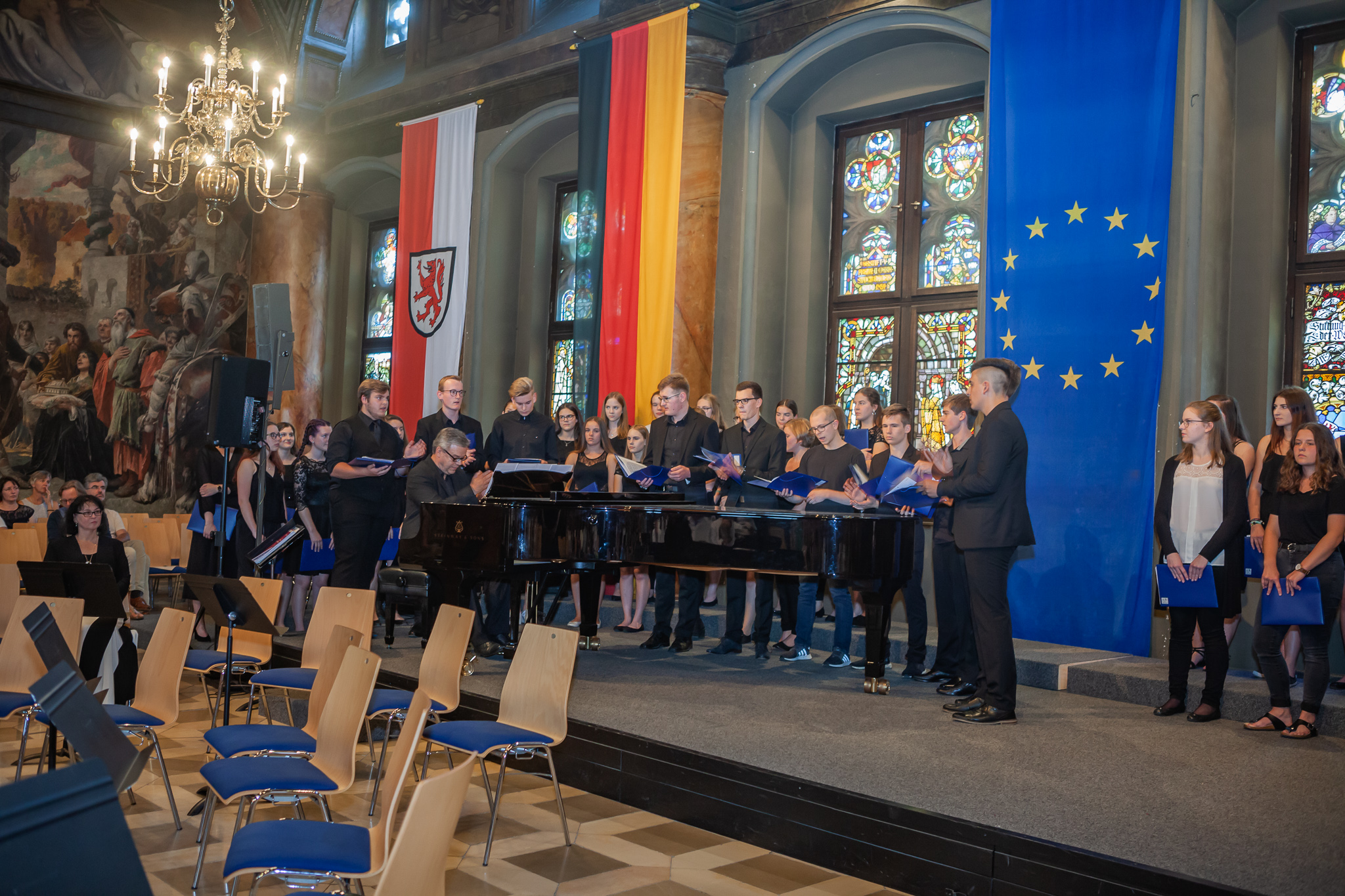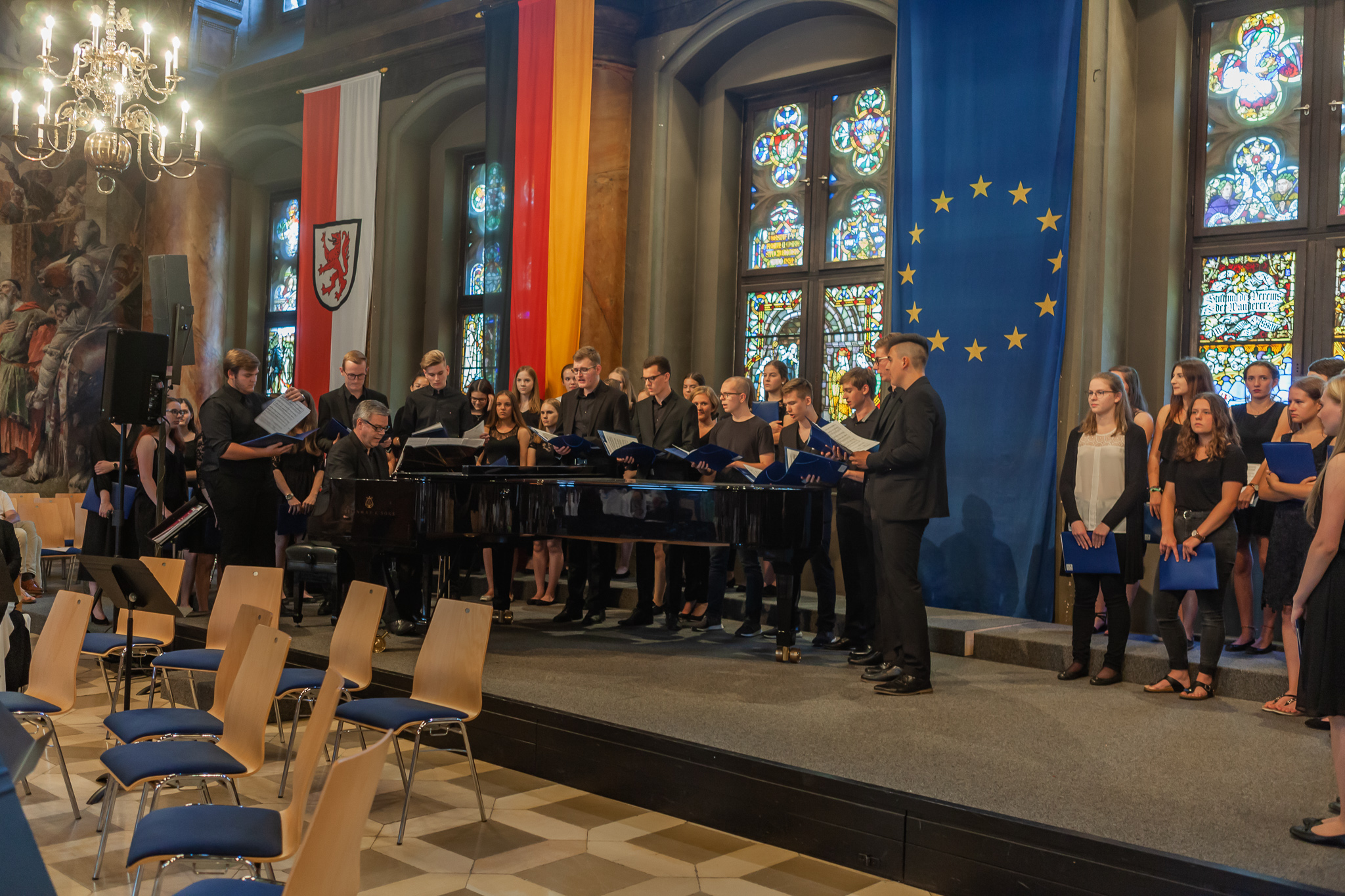 Mit dem Maria-Ward-Preis 2018 hat das Auersperg-Gymnasium im Rahmen der höchst beeindruckenden Jahreskonzerte im großen Rathaussaal Hannah Ecker (6.v.r.) geehrt. Schulleiter Christian Zitzl zeichnete zudem Franziska Fischer (4.v.r), Elisabeth Pontz (5.v.l.), Marie Groß (4.v.l.), Elena Breinfalk (5.v.r.) und Martin Schmid (3.v.l.) mit dem Großen Musikpreis aus. Die jungen Musiker und Sänger brillierten an den beiden Abenden mit herausragendem Können.